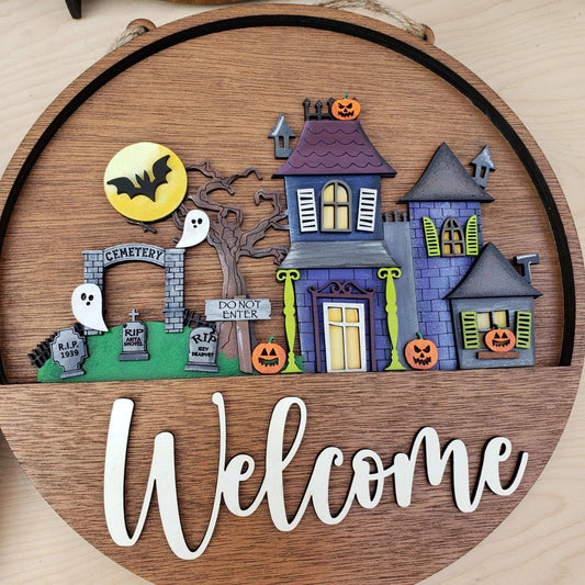 12" Welcome Halloween Haunted House Cemetery Interchangeable Sign Inserts- Halloween Haunted House Fall Pumpkin Door Hanger