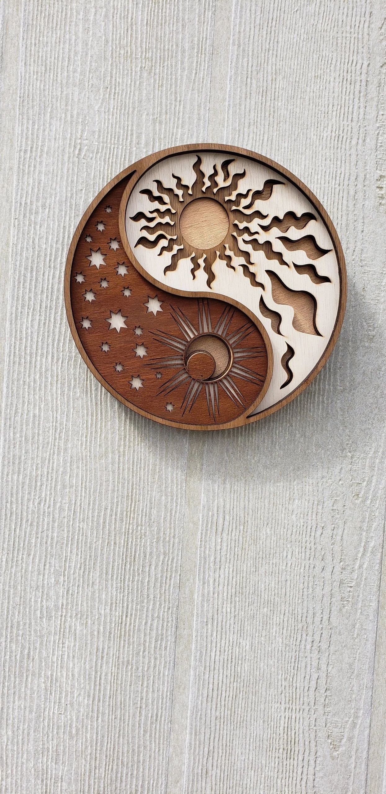 3D Celestial Yin Yang 4 layers of laser-cut wood will add charm to your home. Shades of brown and gold accentuate the layers. 10" round.