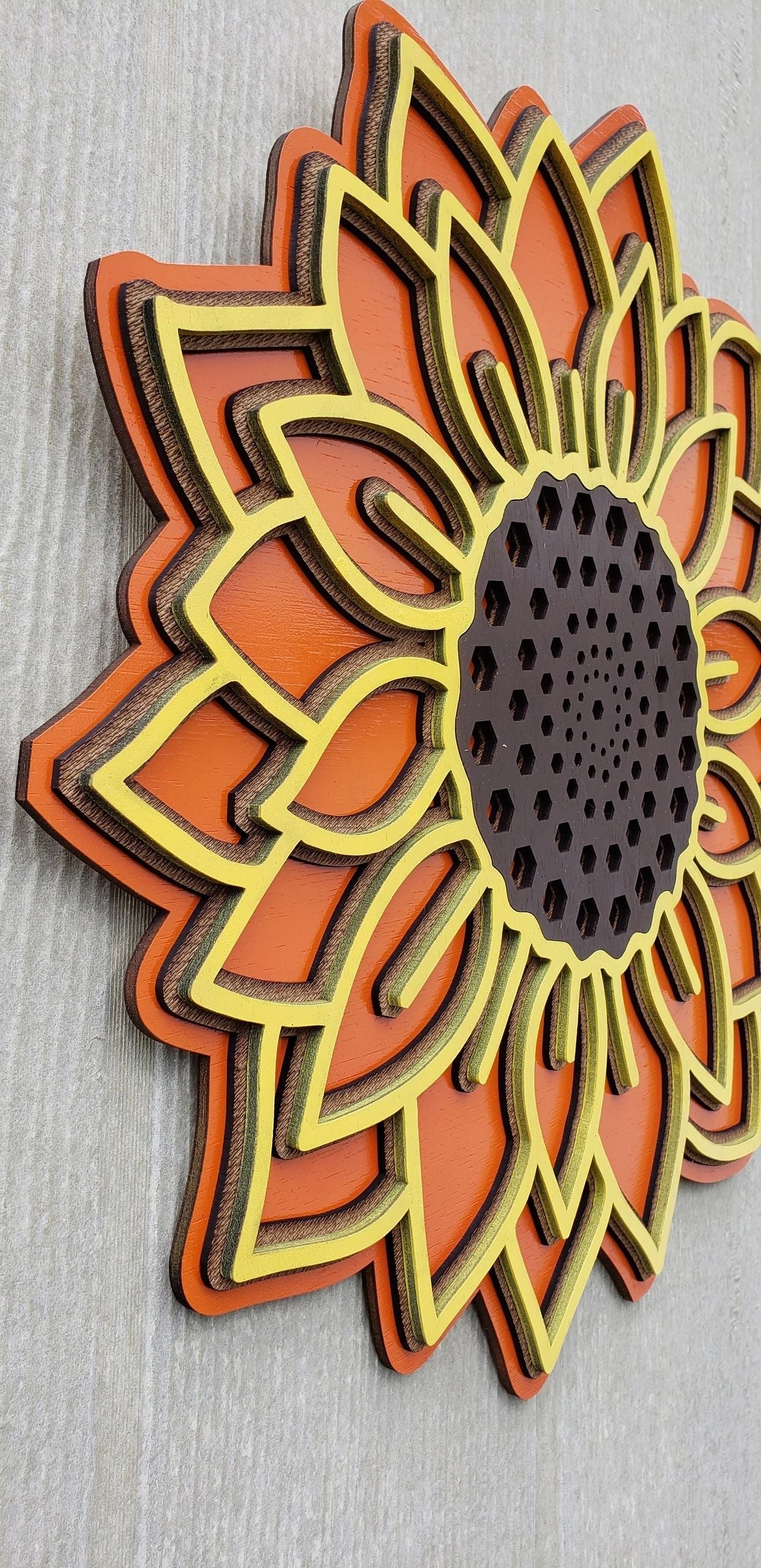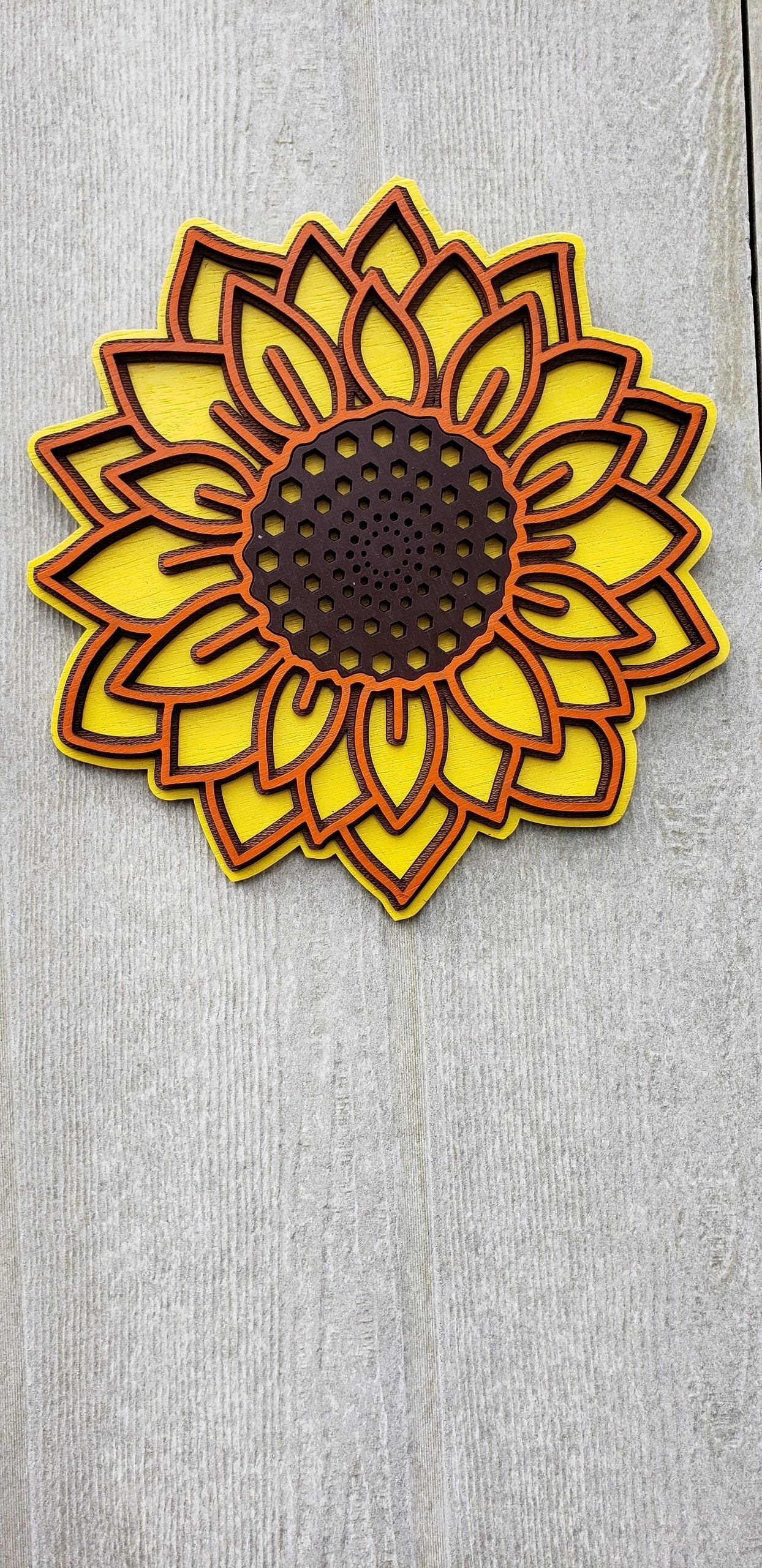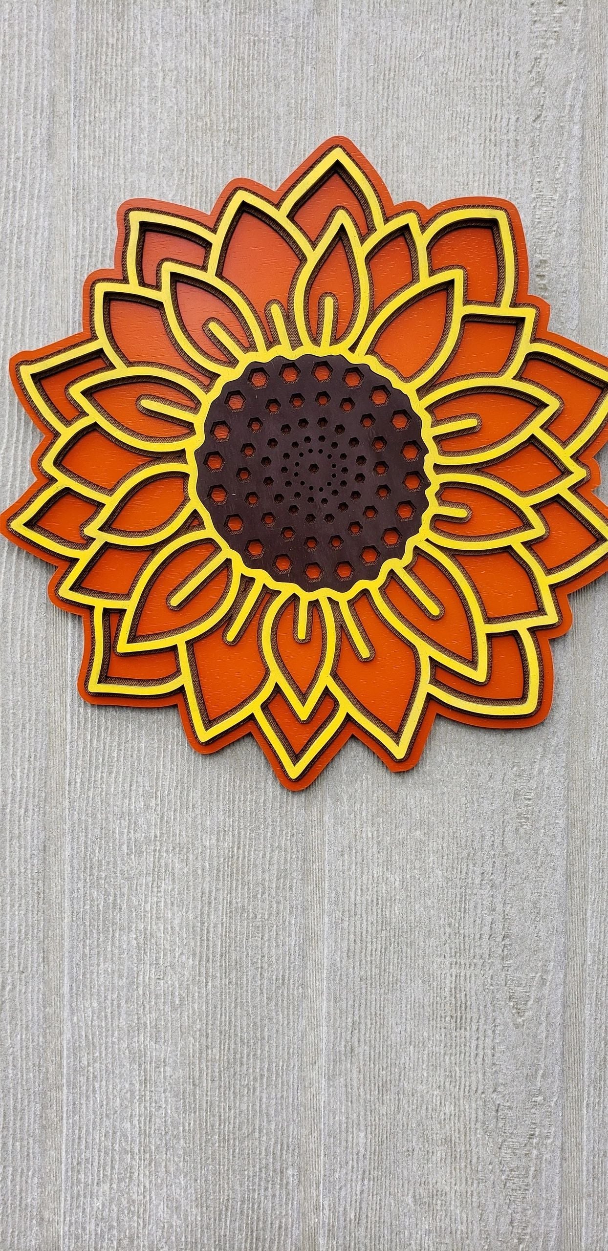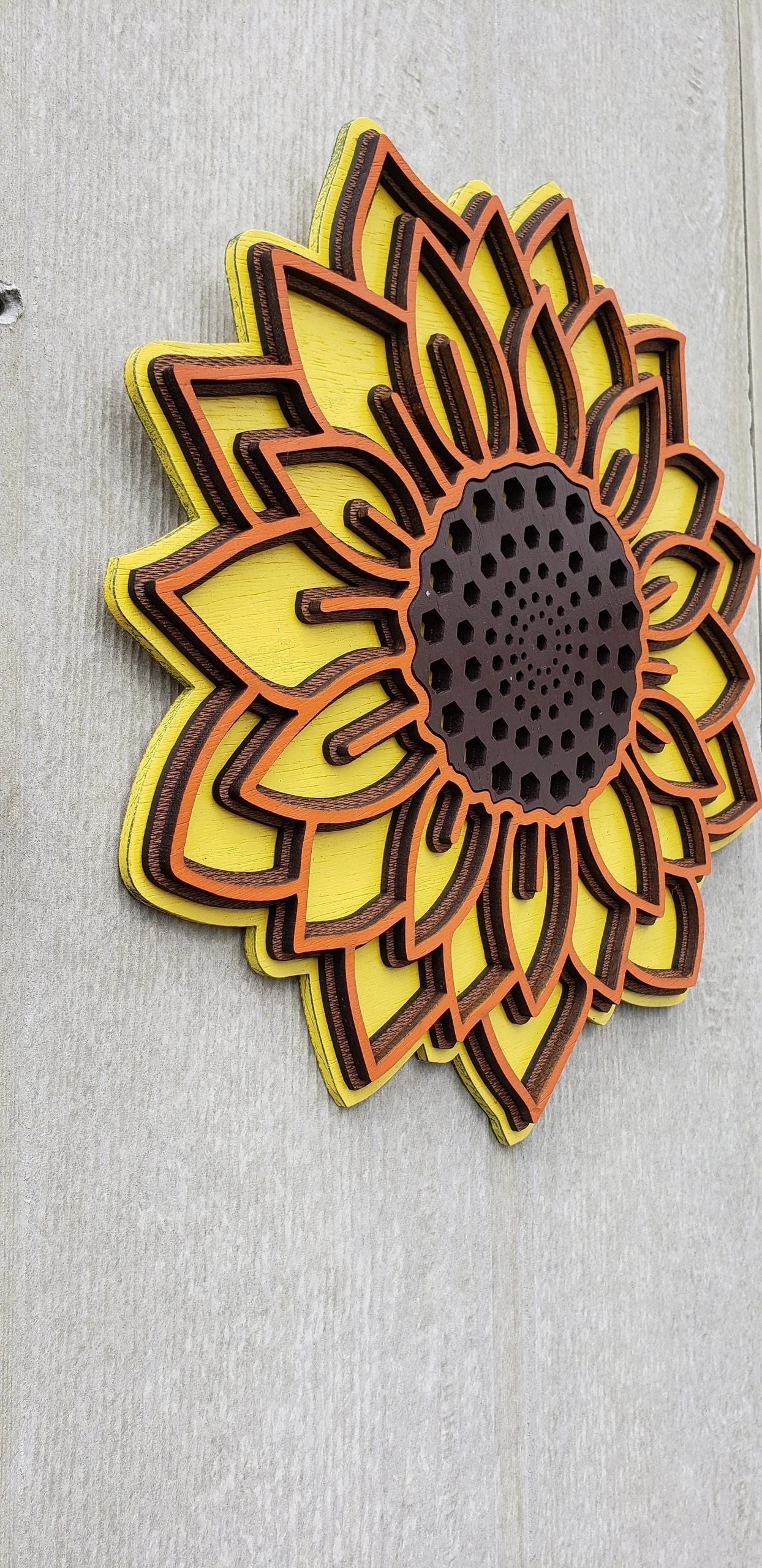 3D Sunflower Wall Art These sunflowers are sure to make anyone smile. 3 layers of laser-cut wood, painted and sealed. You can choose any color combination, just leave a message in the options area. Background, Mid, and top layer color. Can be further customized with a Welcome message. 2 sizes availble. 14" x 14" OR 19" x 19"