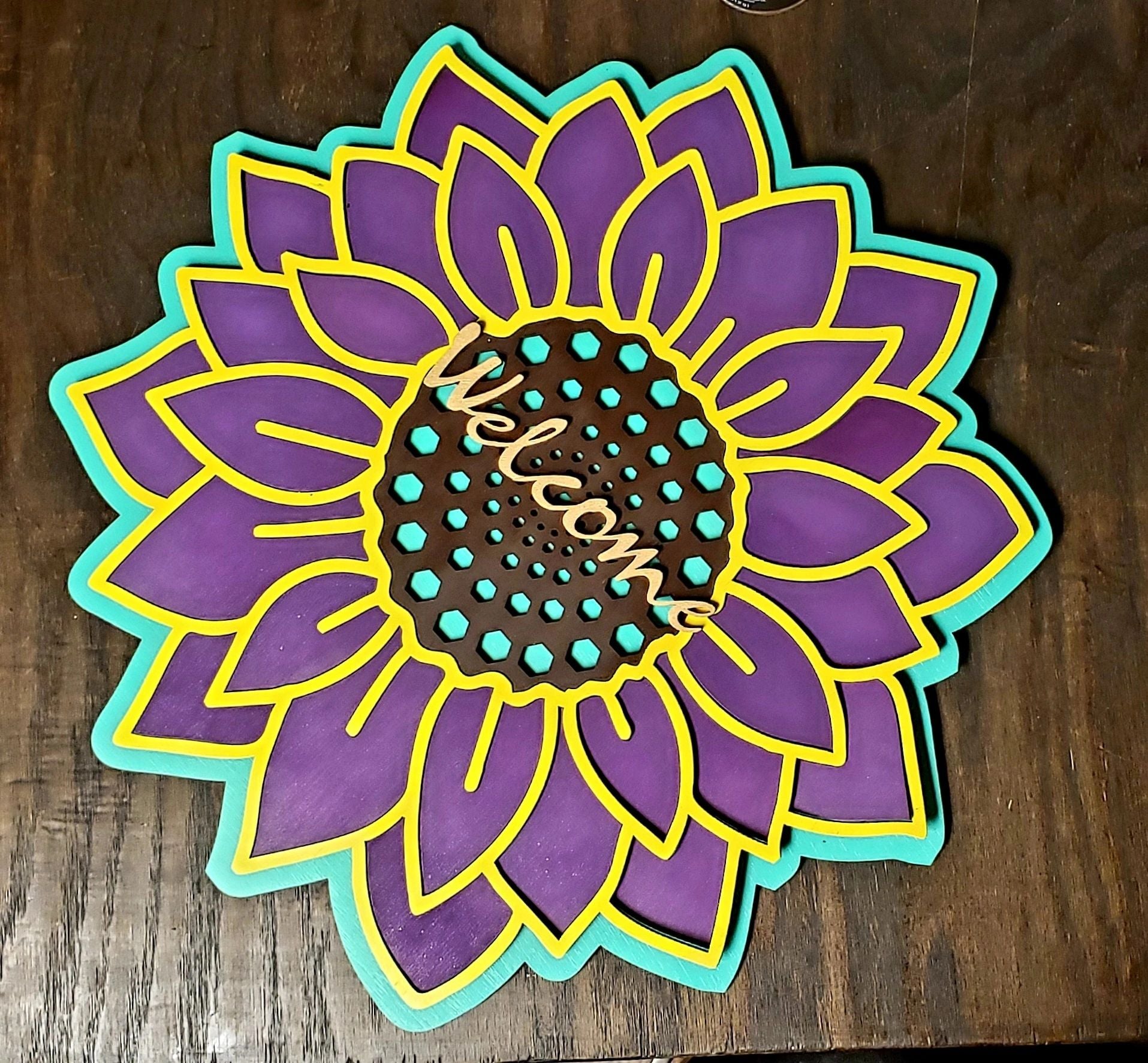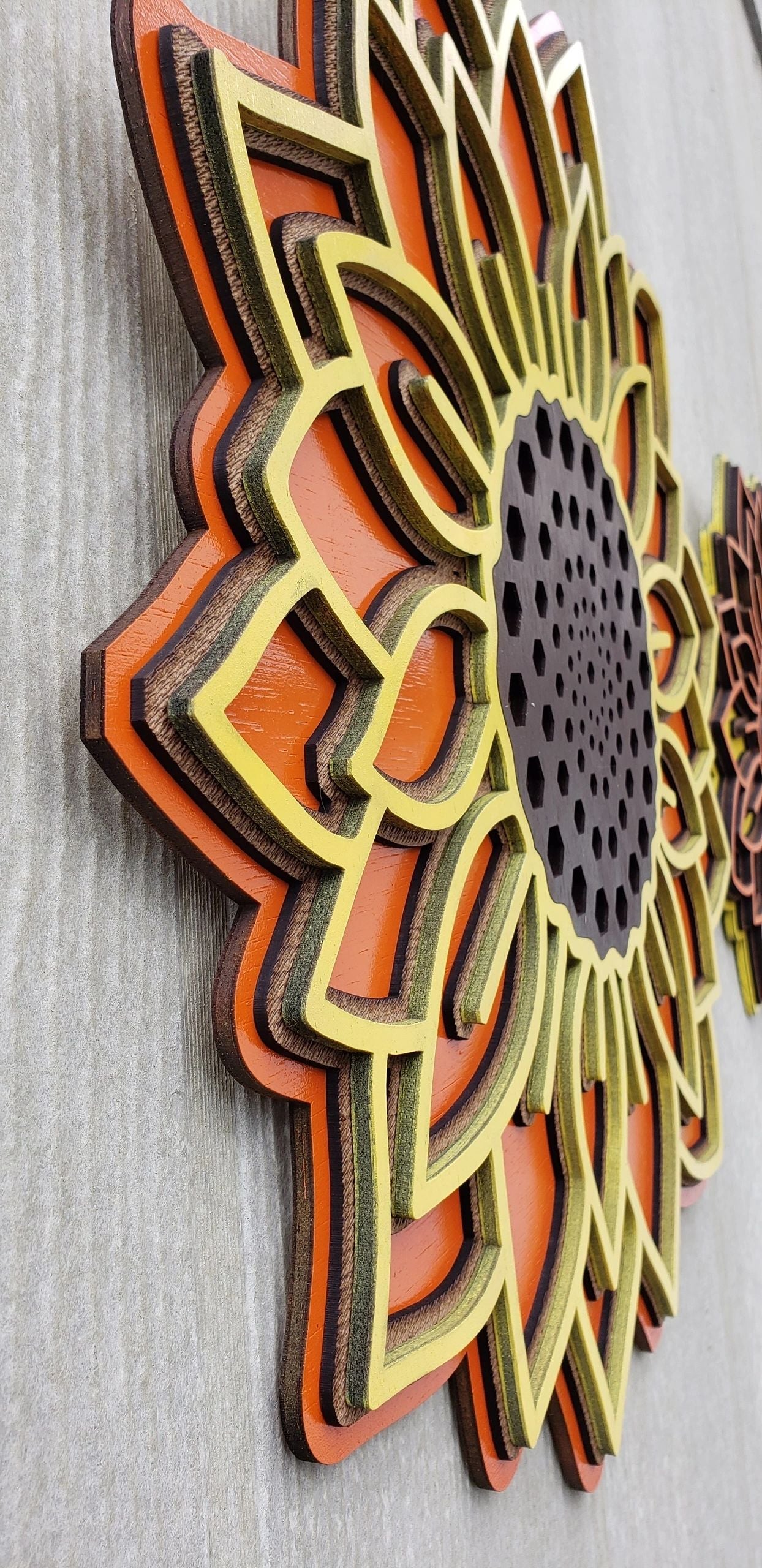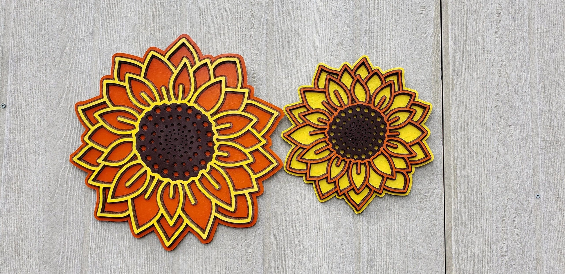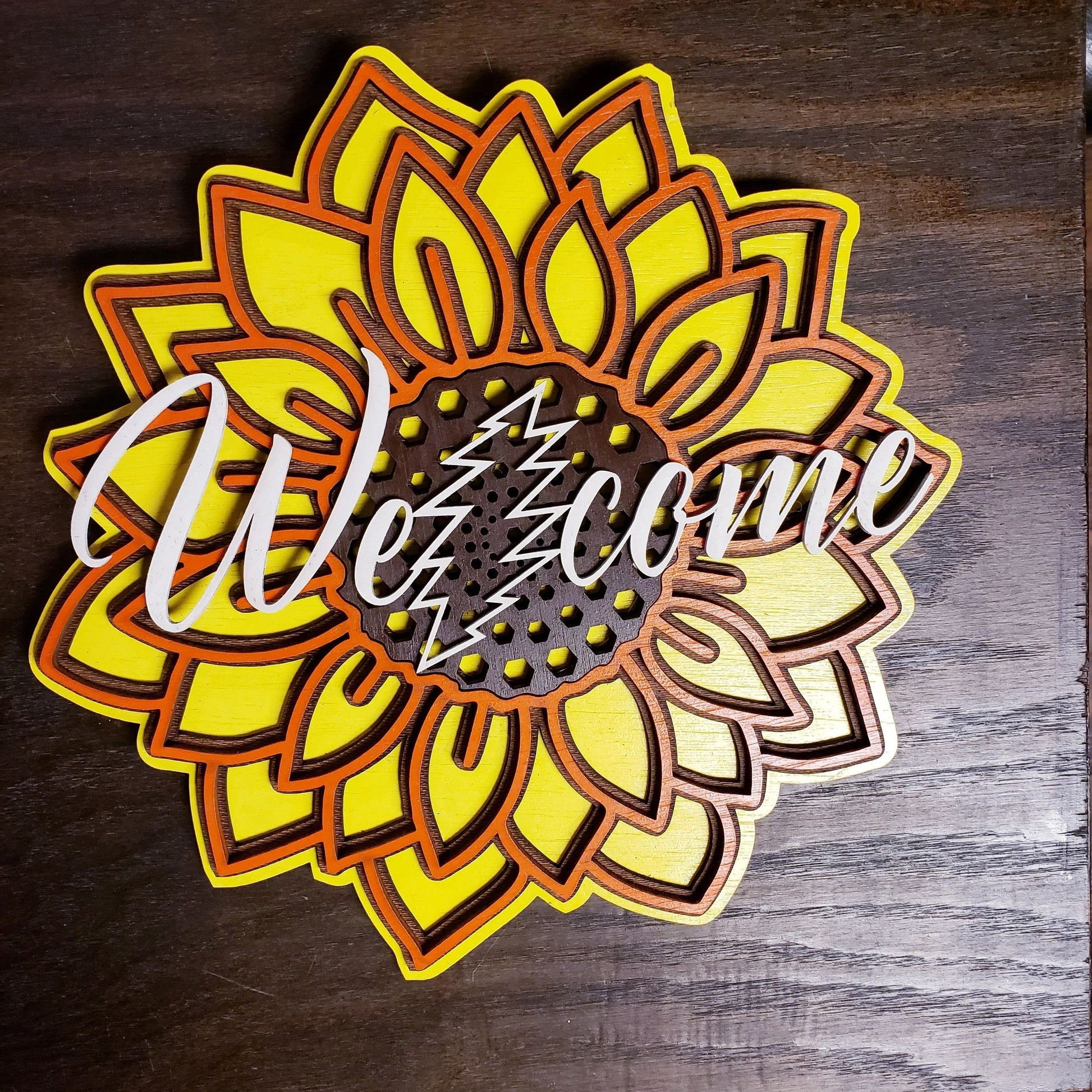 3D Sunflower Wall Art These sunflowers are sure to make anyone smile. 3 layers of laser-cut wood, painted and sealed. You can choose any color combination, just leave a message in the options area. Background, Mid, and top layer color. Can be further customized with a Welcome message. 2 sizes availble. 14" x 14" OR 19" x 19"