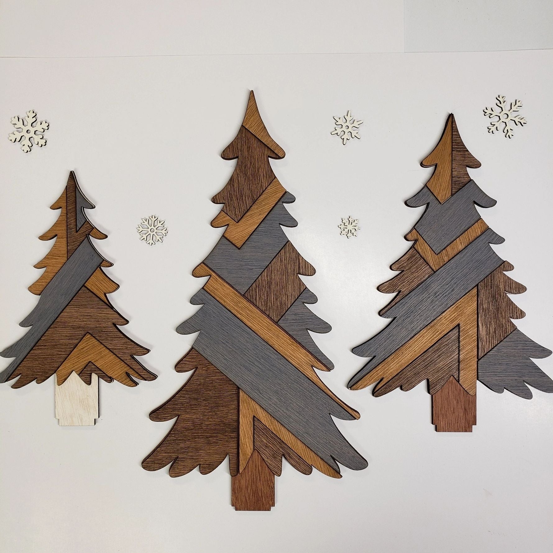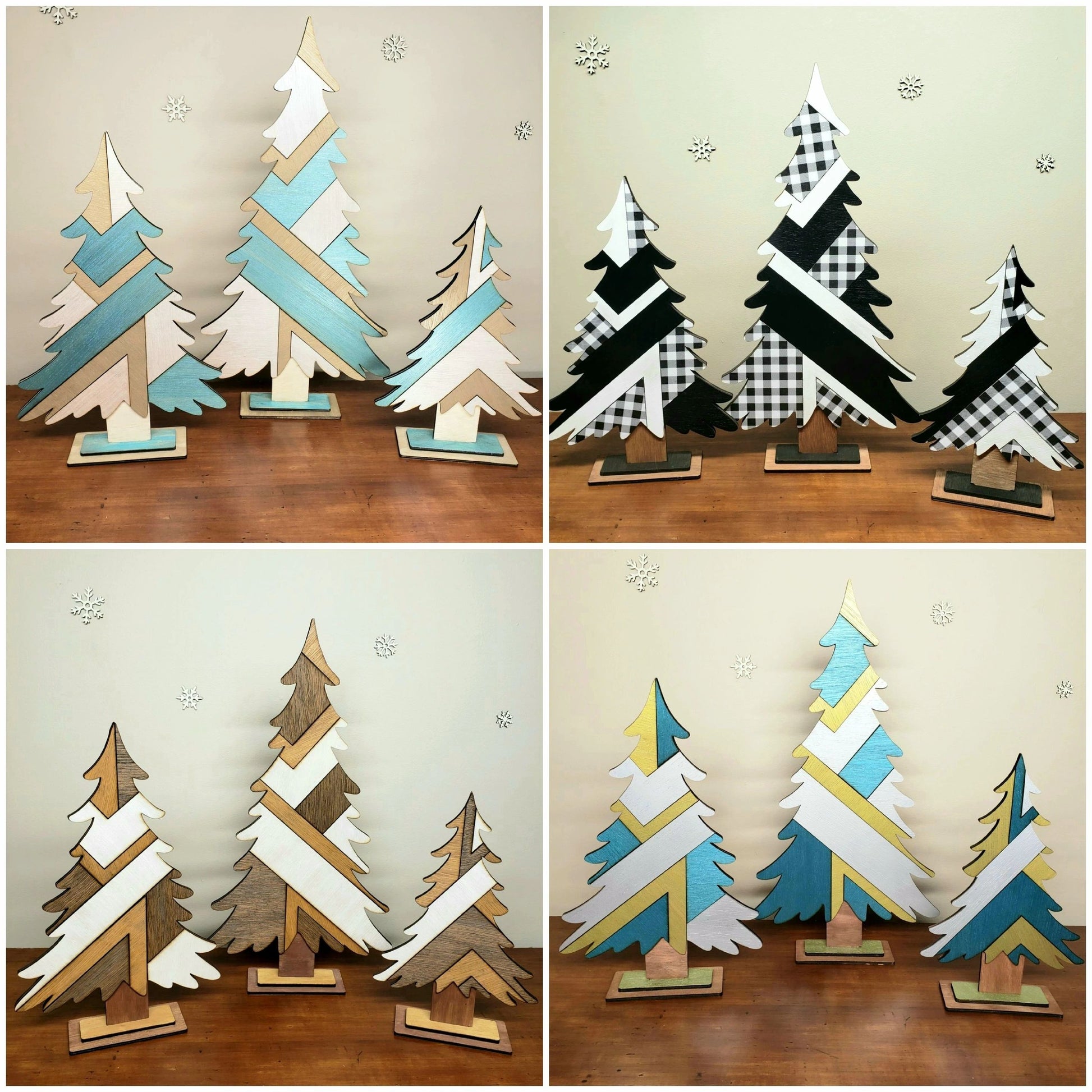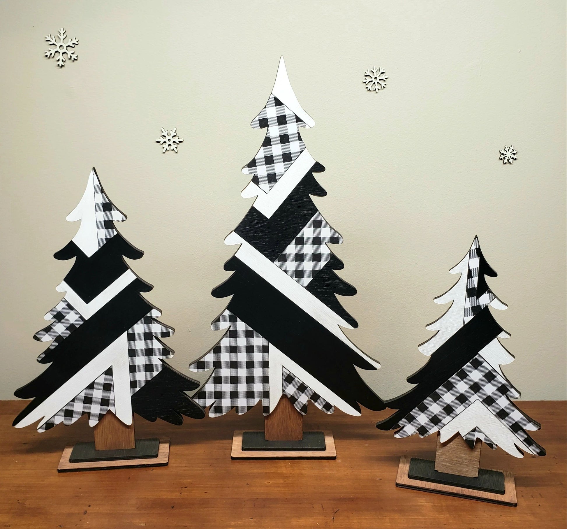 Buffalo Check Plaid Christmas Trees, Farmhouse Decor, Teal Christmas, Neutral Rustic Christmas Trees, Wooden Patchwork Trees, Pallet Trees, Barnwood Trees, Farmhouse Christmas Decor, Wooden Trees These beautiful Christmas trees will add some charm with the popular modern farmhouse standing trees. The wooden patchwork Christmas trees will look great with any decor, from farmhouse to modern to classic. There is a color combination that will suit your palette. Mix any three colors per tree. Order individual pieces or the entire set. You can mix and match sizes and color schemes for a customized set. The trees look great on your mantel, a shelf, or on a table. Mix with your other rustic decorations for that cozy rustic look. Each tree comes with a dual layer wood base. You may need to slide the tree into the base. The trees measure Small 11.5" x 7" Medium 14" x 8.75" Large 18.25x 9.75" Stands measure 5 x 2.3" Each piece is individually stained and put together. Color choices include: Black Black Wash White Ivory White Metallic Silver Metallic Titanium Gold Metallic Topaz Metallic Peacock Metallic Emerald Metallic Festive Green Metallic Gold Green Metallic Cranberry Wash Red Metallic Walnut Oak Black White Buffalo Plaid They will ship flat to protect them in transit. All you have to do it slip them in their slot.