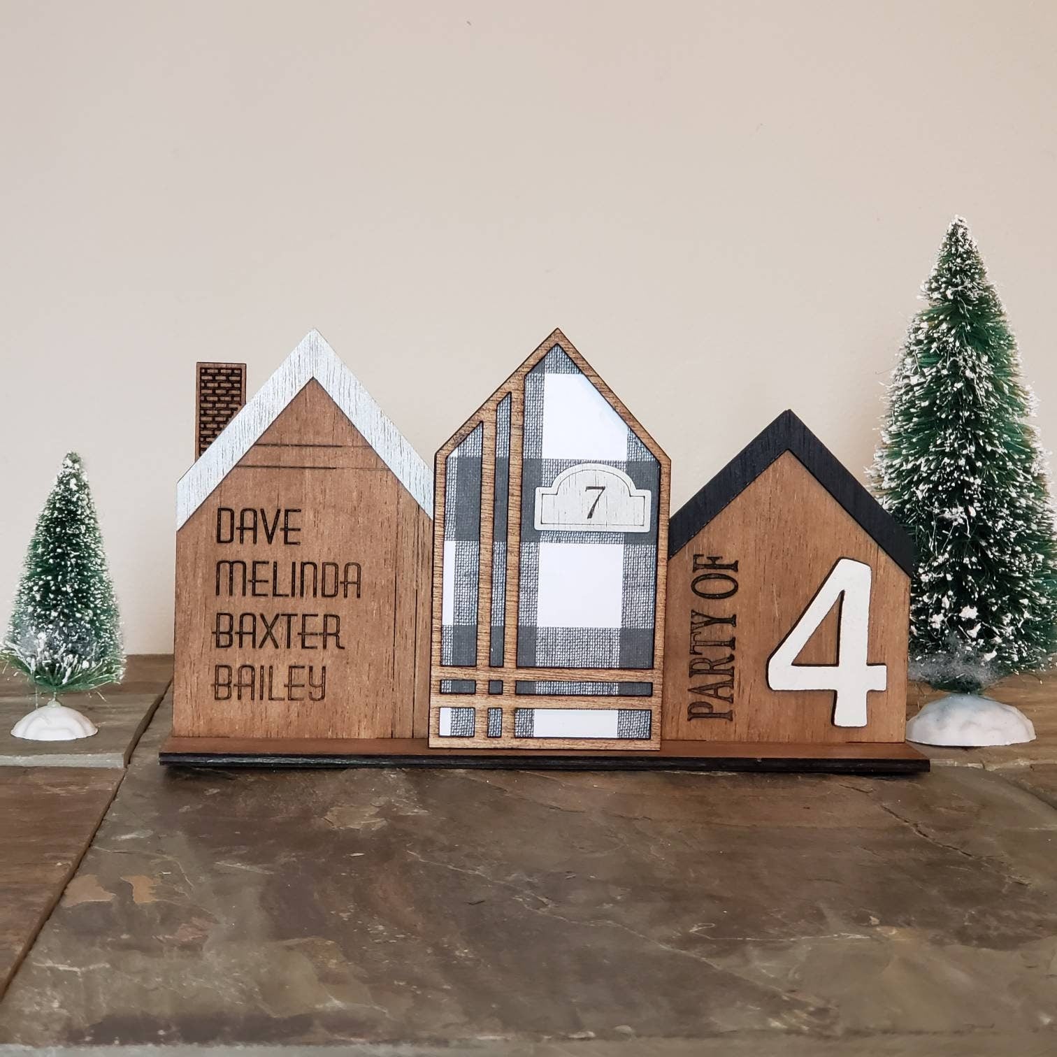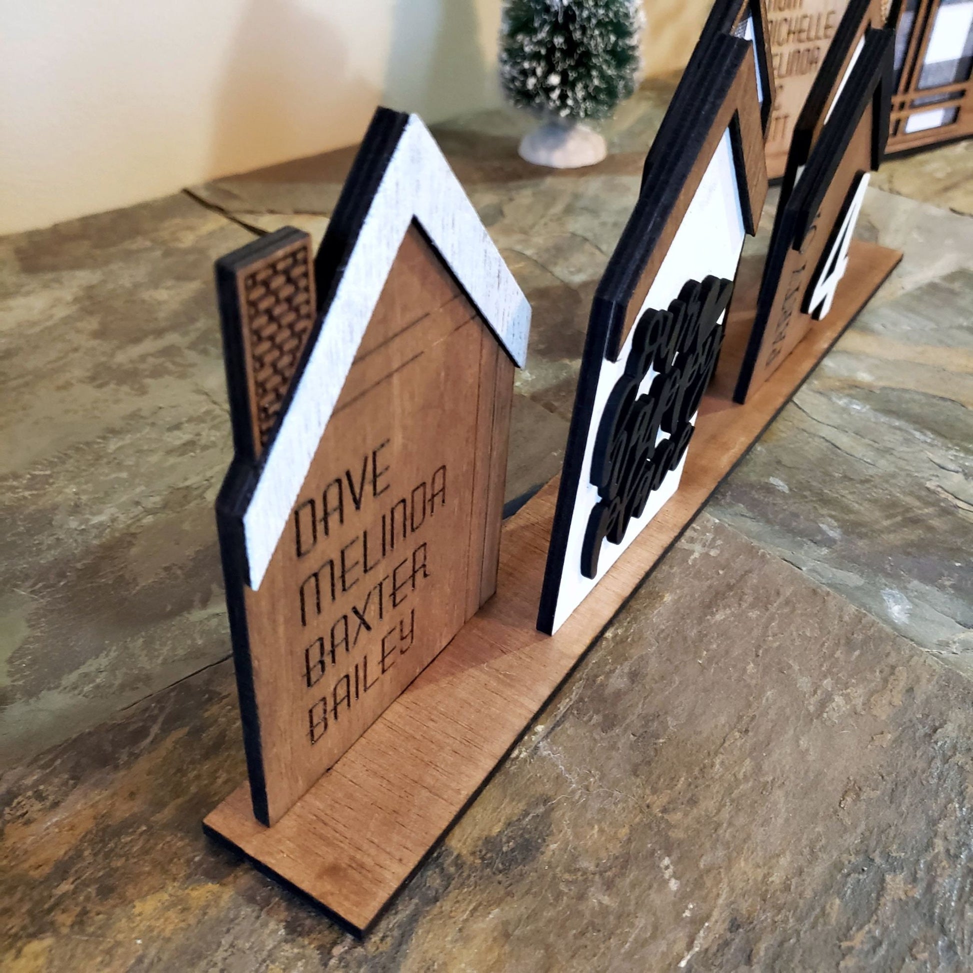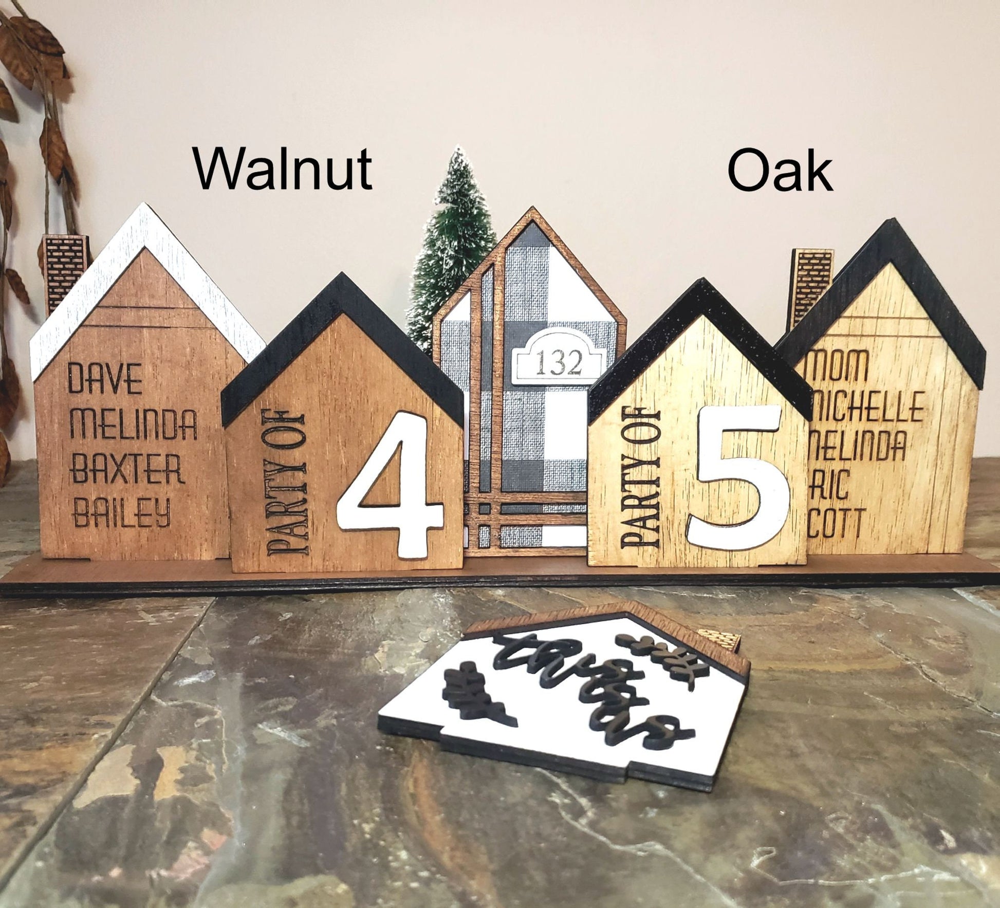 These standing houses customizable sets are available in 3 or 5 house sets. These make a wonderful gift for newlyweds, a new homeowner, or any occasion that a thoughtful gift is needed. The rustic farmhouse style can also be ordered in a walnut OR oak finish for just the right shade to match any decor. The houses each have a tab on the bottom that pops into a slot on the base. The houses can be rearranged into any configuration that you would like.