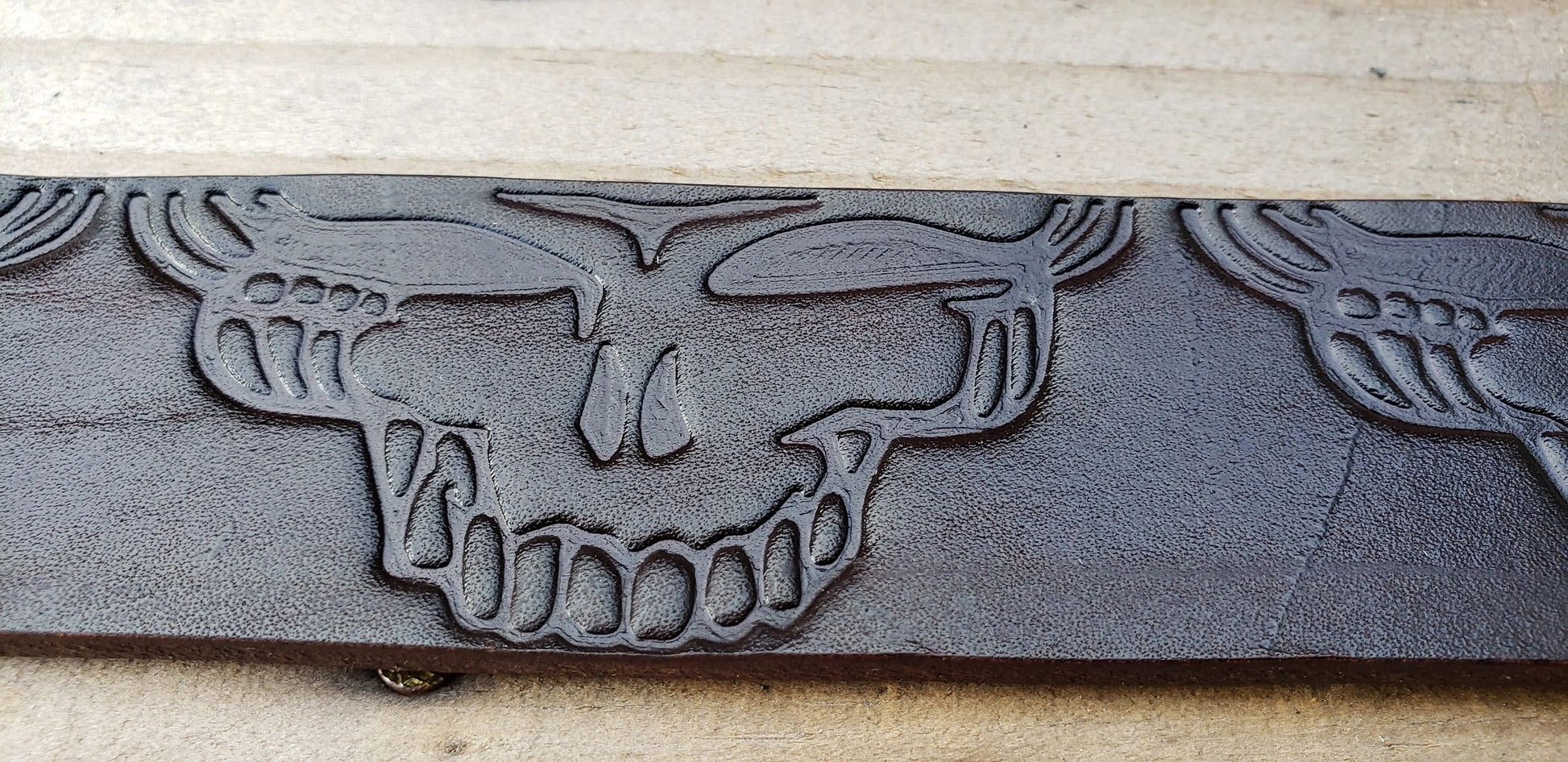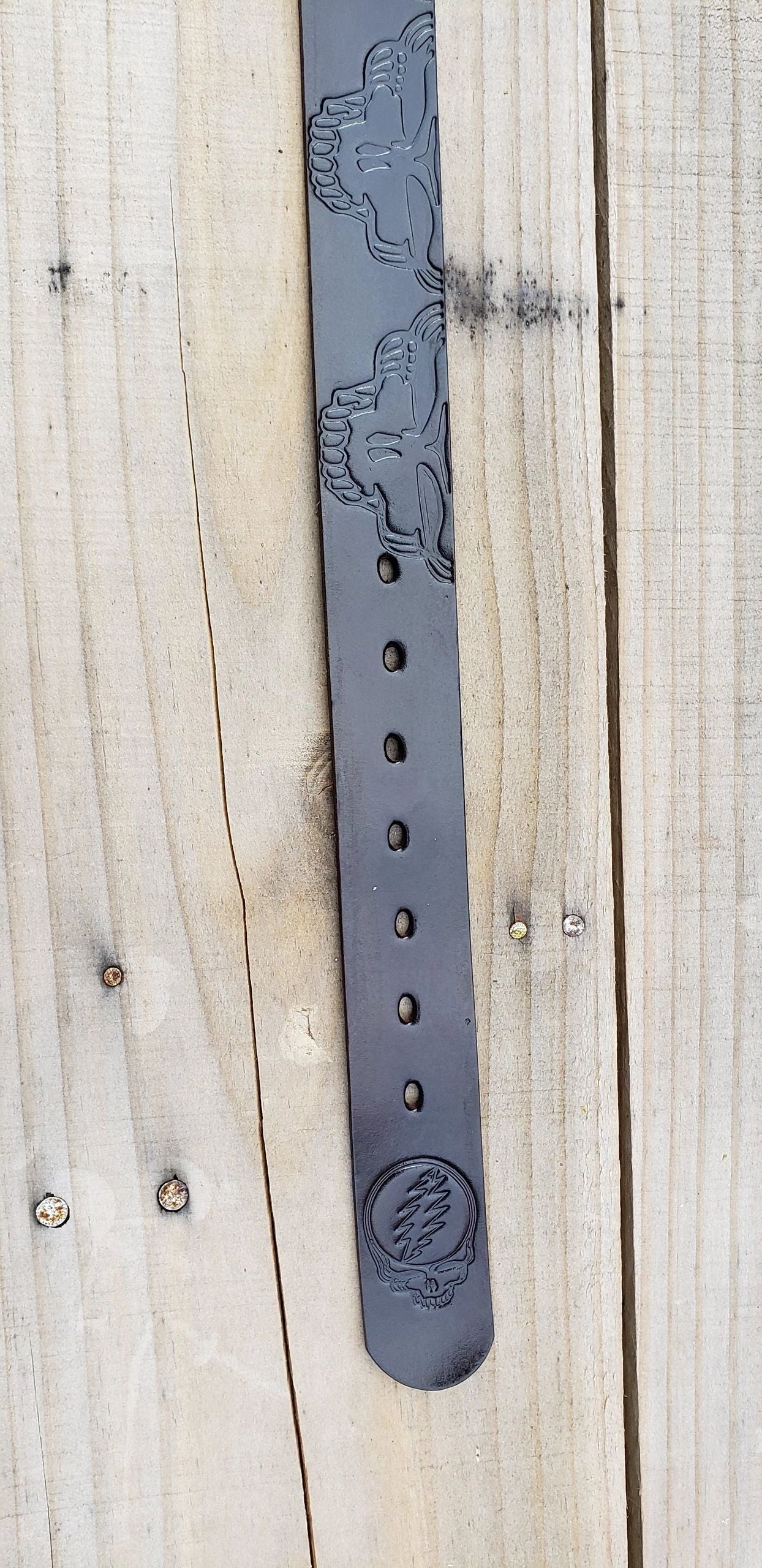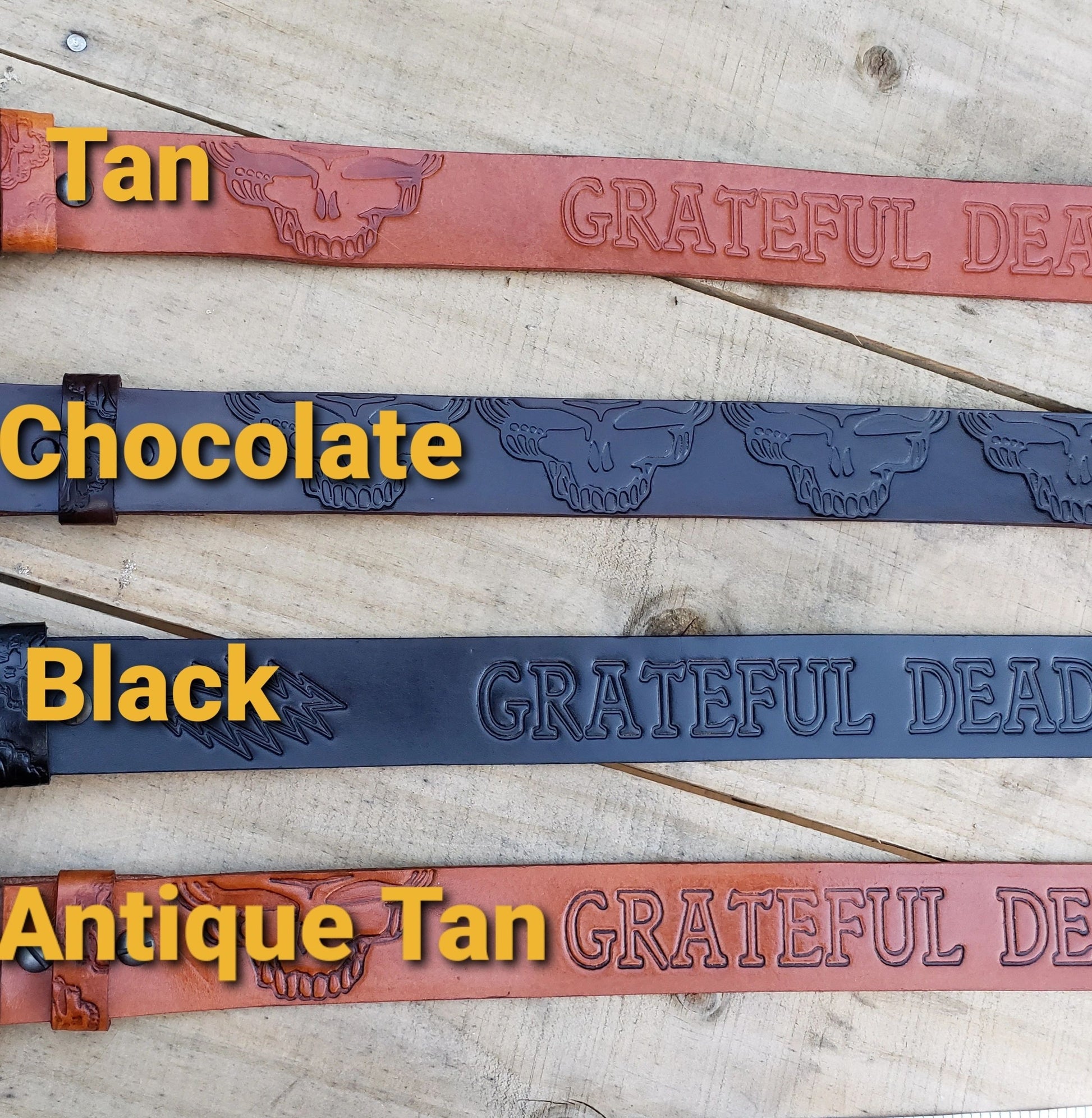 Leather Belt Grateful Dead with 1/2 Stealie Faces Please be aware of the Sizing Chart in the Photos and order accordingly. Belts are normally 2-3" larger than your normal pants size. DO NOT ORDER YOUR PANTS SIZE! Example - If your Pants size is 36" ---> Order a 38" Belt Size. This belt will be made to order in my Pennsylvania shop. The belts are hand-cut 1 1/ 2" wide quality vegetable tanned leather is stamped with a Grateful Dead theme. Then hand-dyed and sealed for a long-lasting finish. Gold embellished belt buckle. Snaps can be undone to swap out the buckle.