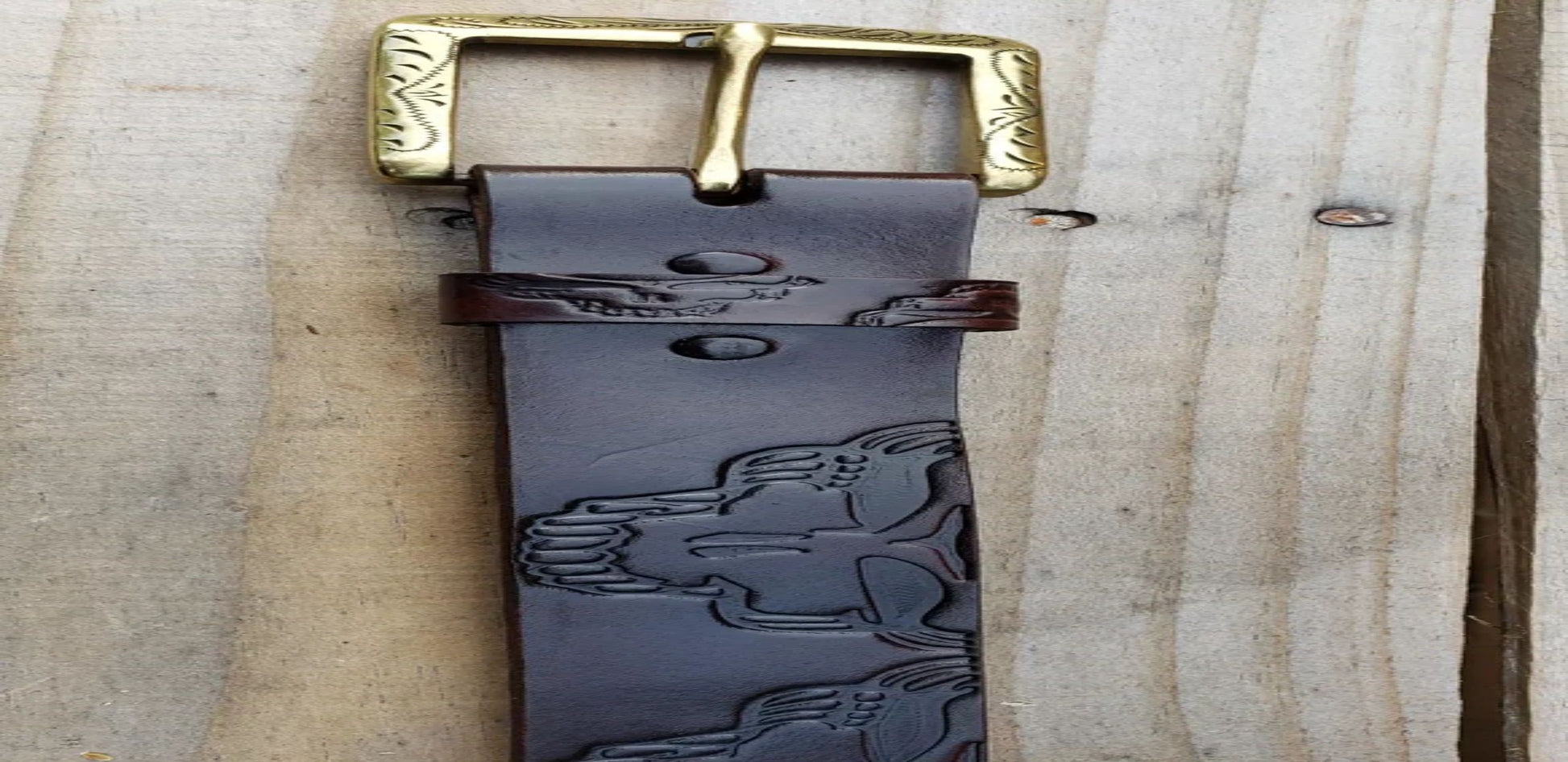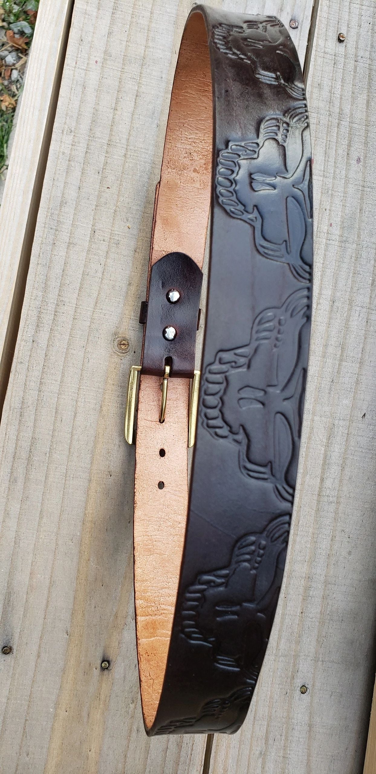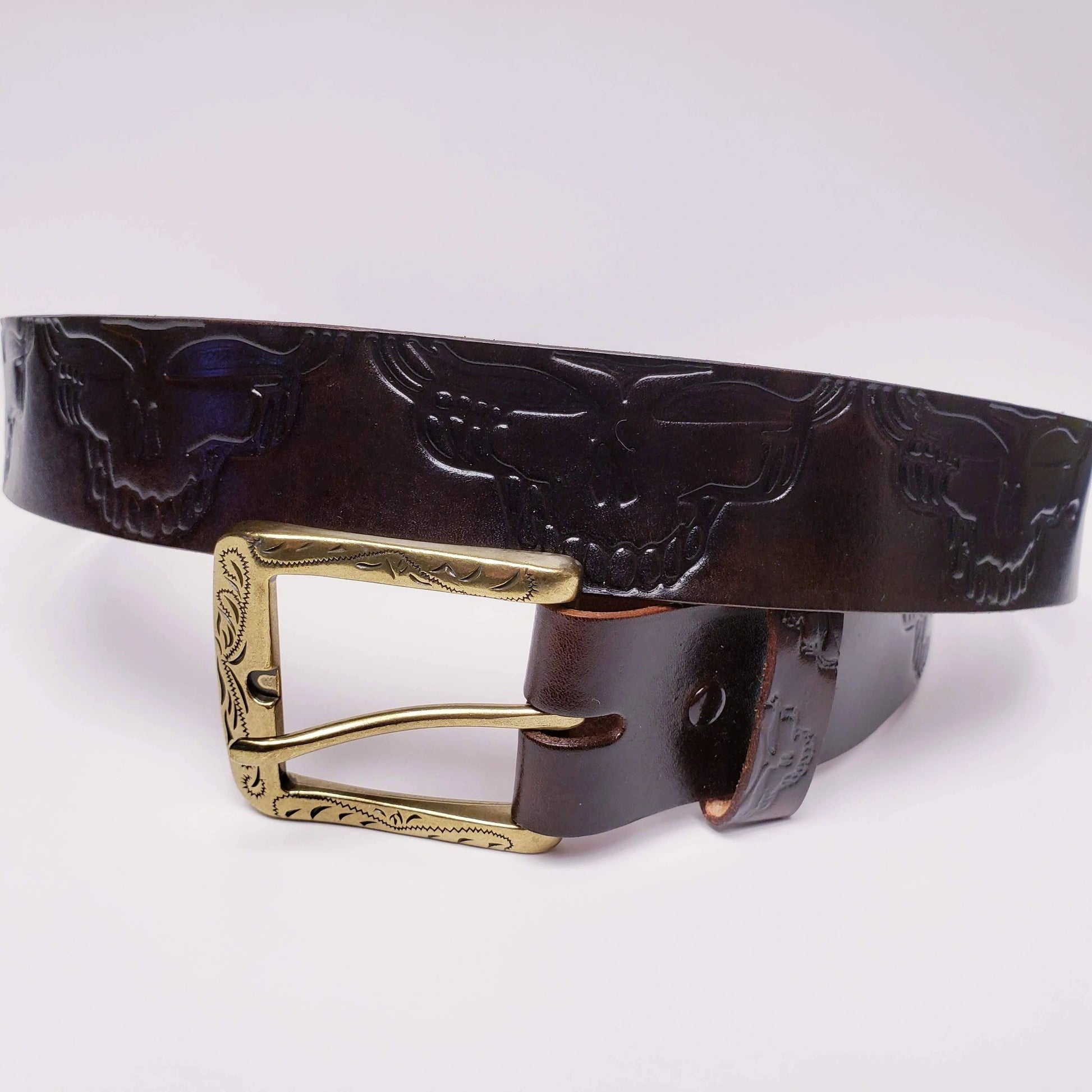 Leather Belt Grateful Dead with 1/2 Stealie Faces Please be aware of the Sizing Chart in the Photos and order accordingly. Belts are normally 2-3" larger than your normal pants size. DO NOT ORDER YOUR PANTS SIZE! Example - If your Pants size is 36" ---> Order a 38" Belt Size. This belt will be made to order in my Pennsylvania shop. The belts are hand-cut 1 1/ 2" wide quality vegetable tanned leather is stamped with a Grateful Dead theme. Then hand-dyed and sealed for a long-lasting finish. Gold embellished belt buckle. Snaps can be undone to swap out the buckle.