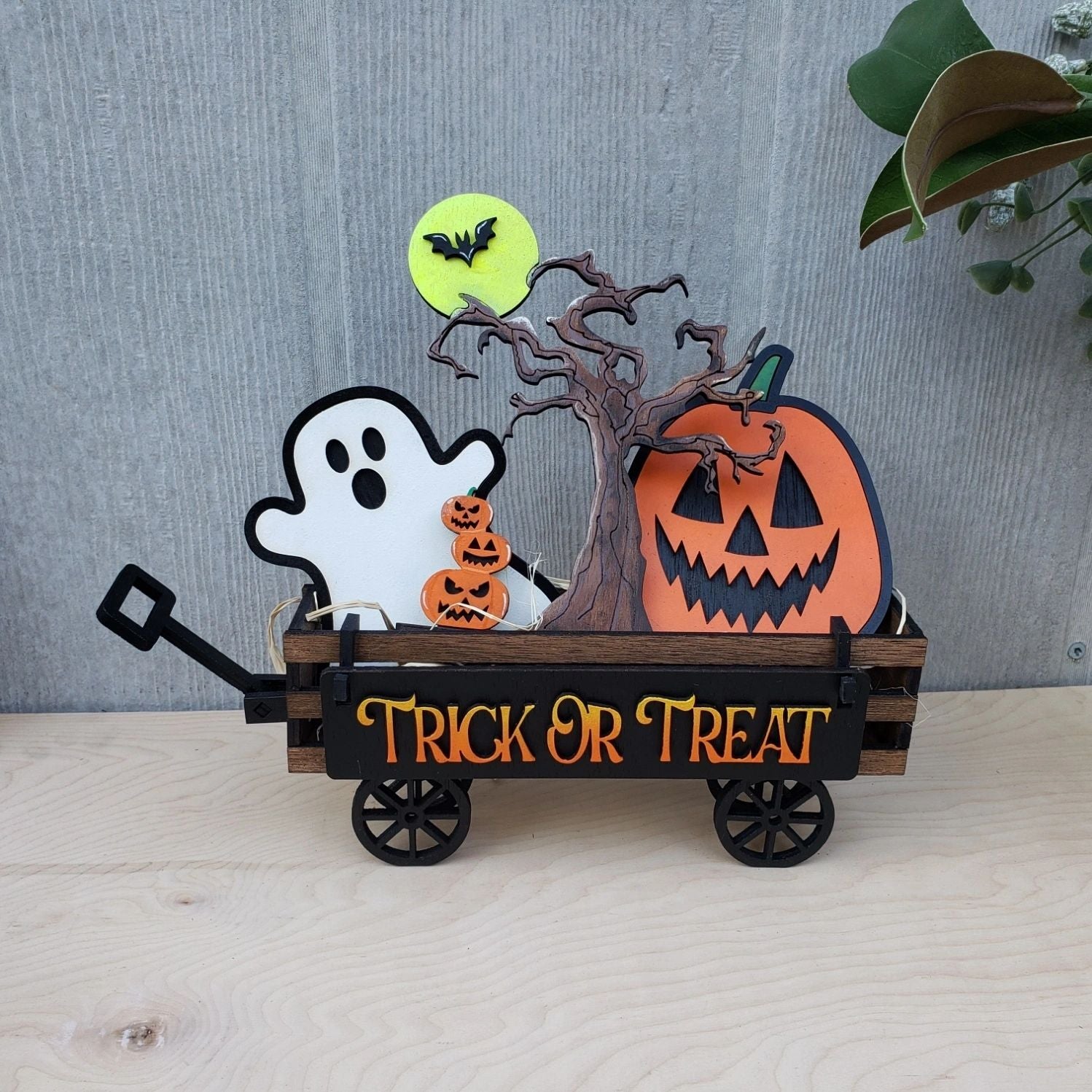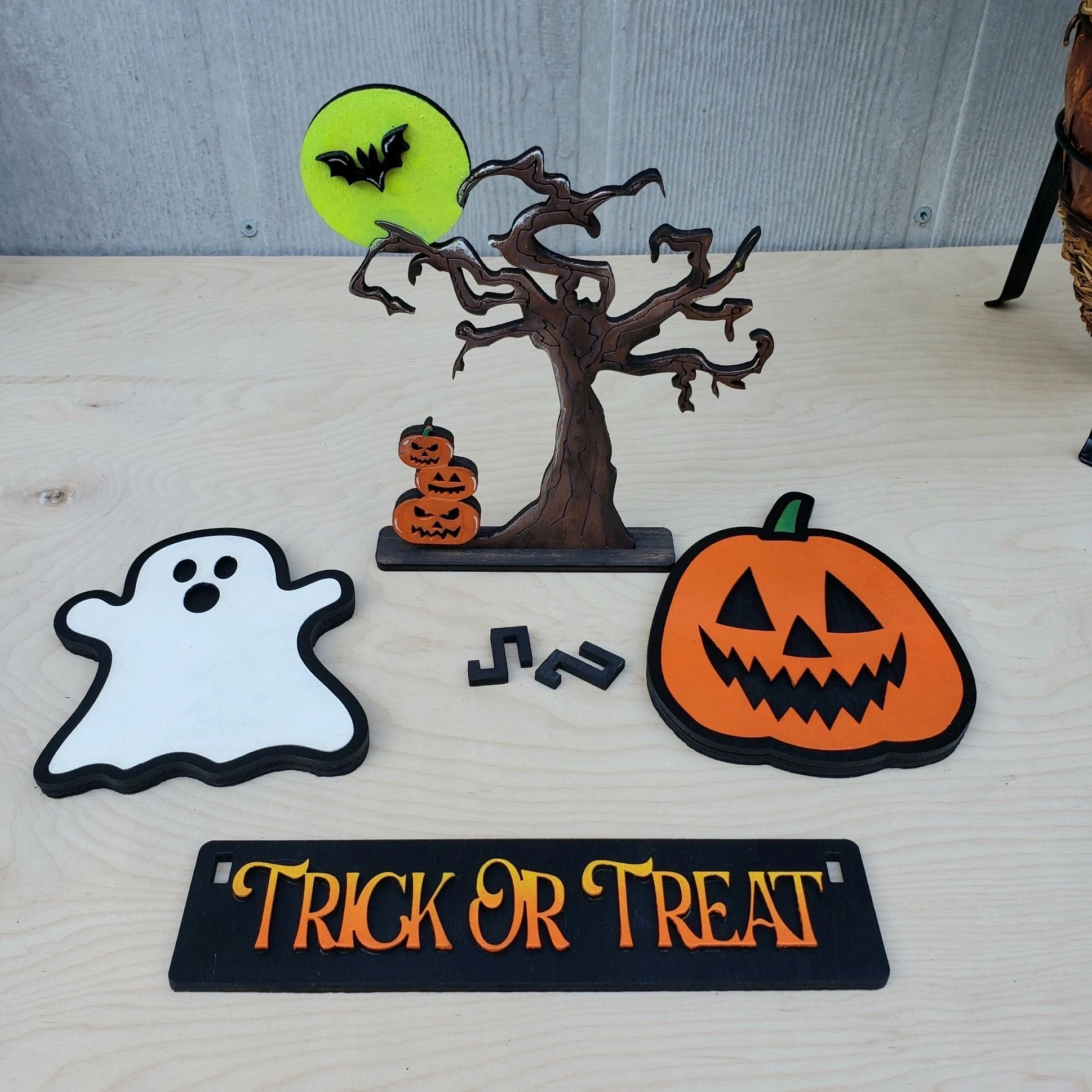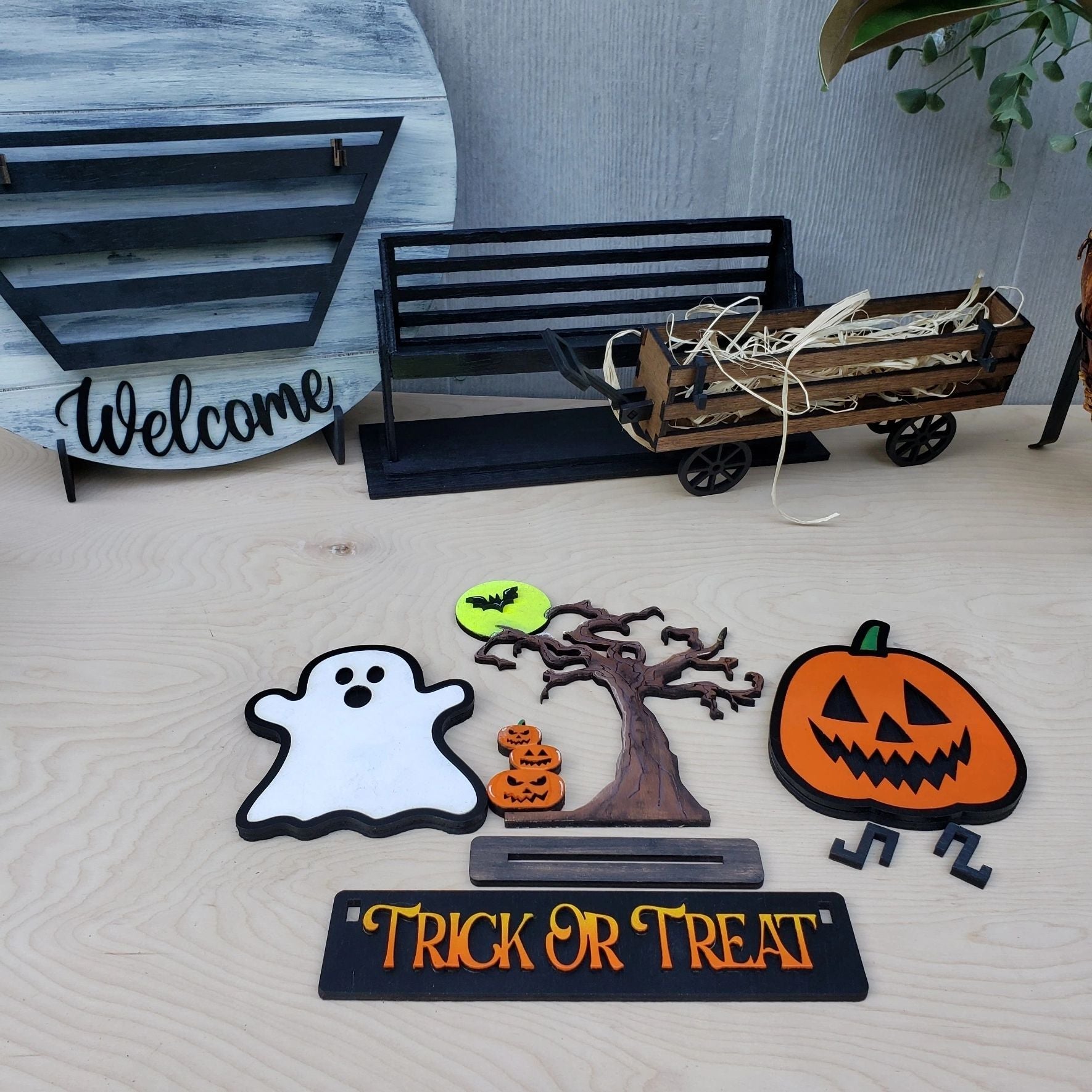 Halloween Interchangeable Set ****Wagon, Shelf, and Welcome Basket Sign SOLD SEPARATELY**** The Halloween set will add a fun pop of color to your home decor. Use the set as stand-alone decor , or add them to a Wagon, Shelf, or Basket Welcome Sign available in my shop. This set is multi-layered and laser cut from a mix of birch and MDF. The Ghost measures 5 x 4.5 ". The Jack-o-lantern measures 6 x 4.5 ". The Tree measures 7.5 x 6.5". The banner sign measures 8.5 x 2" and comes with 2 removable wood hooks to hang the banner.