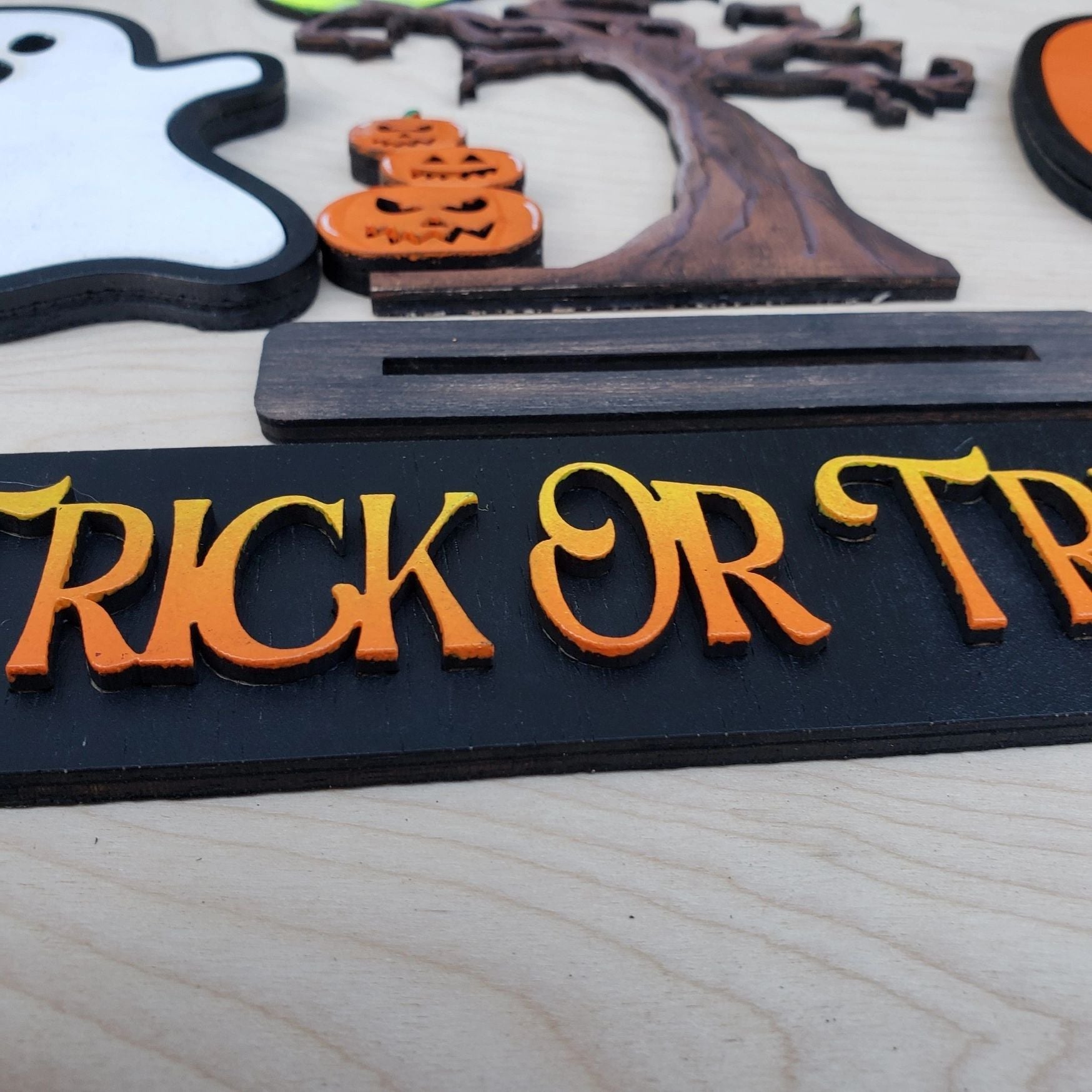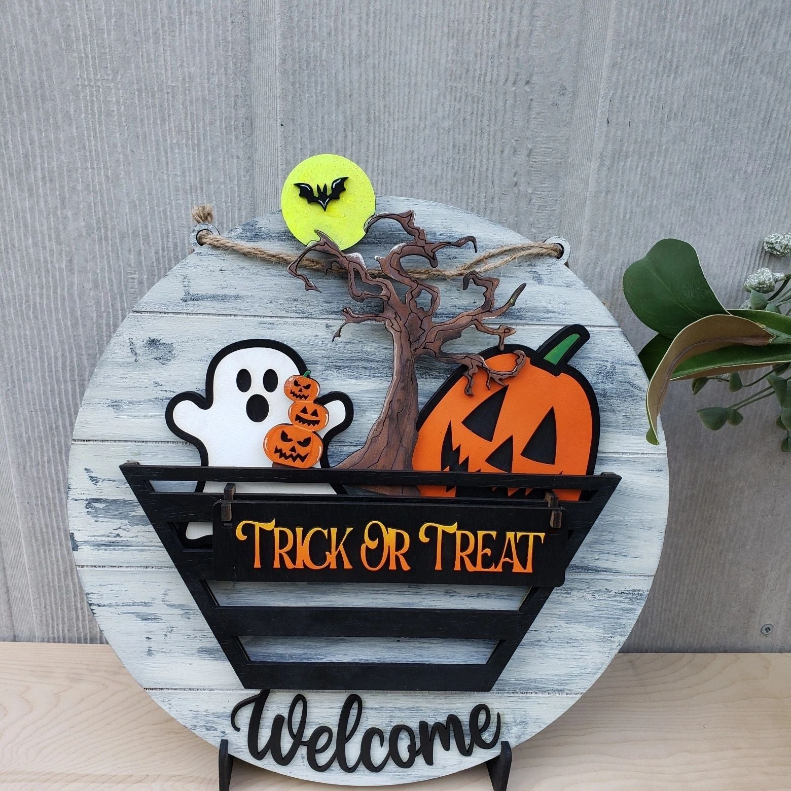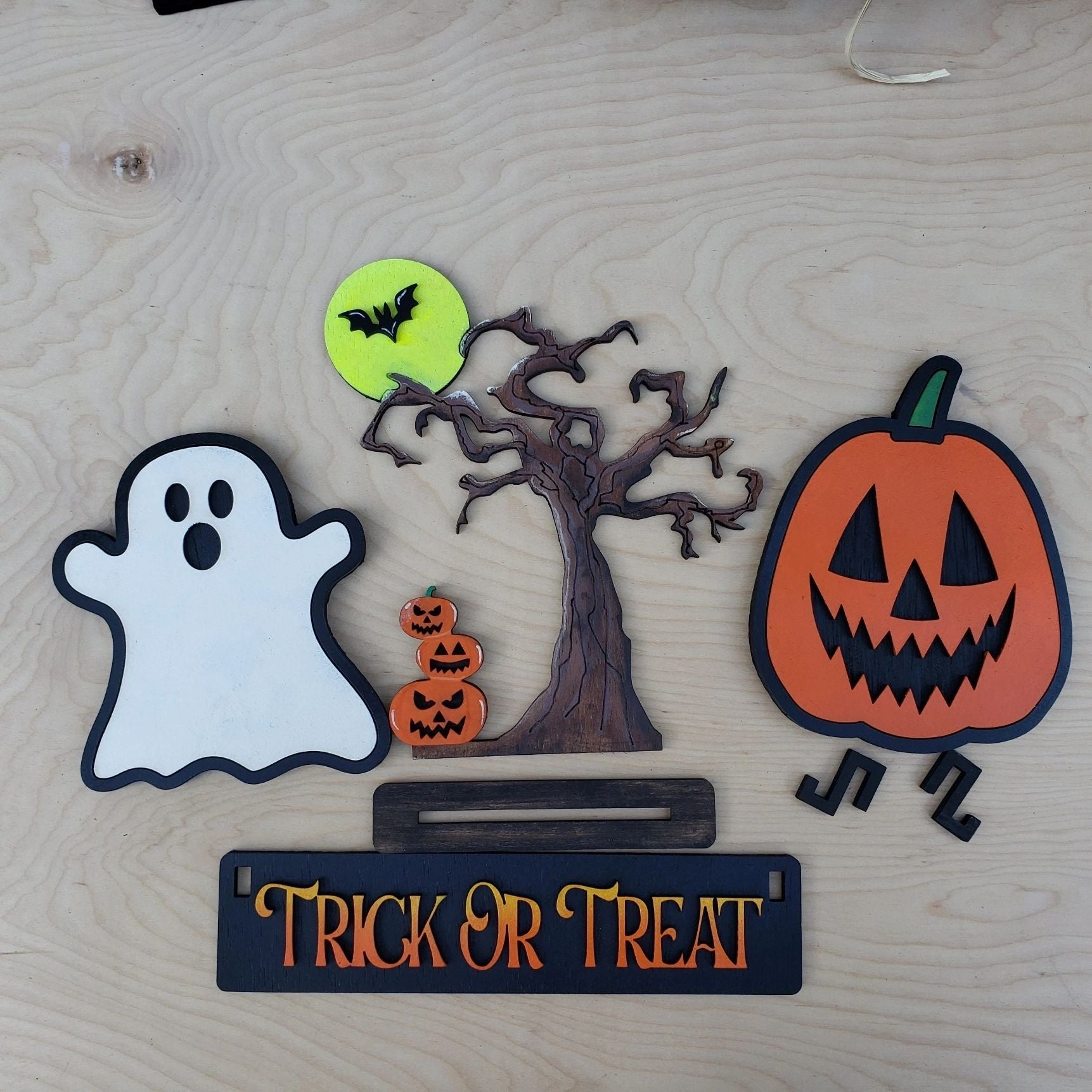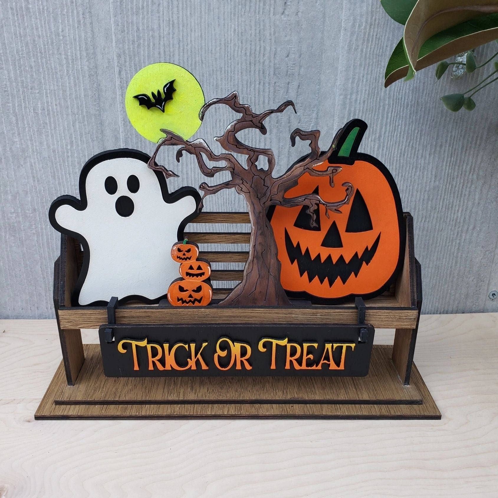 Halloween Interchangeable Set ****Wagon, Shelf, and Welcome Basket Sign SOLD SEPARATELY**** The Halloween set will add a fun pop of color to your home decor. Use the set as stand-alone decor , or add them to a Wagon, Shelf, or Basket Welcome Sign available in my shop. This set is multi-layered and laser cut from a mix of birch and MDF. The Ghost measures 5 x 4.5 ". The Jack-o-lantern measures 6 x 4.5 ". The Tree measures 7.5 x 6.5". The banner sign measures 8.5 x 2" and comes with 2 removable wood hooks to hang the banner.