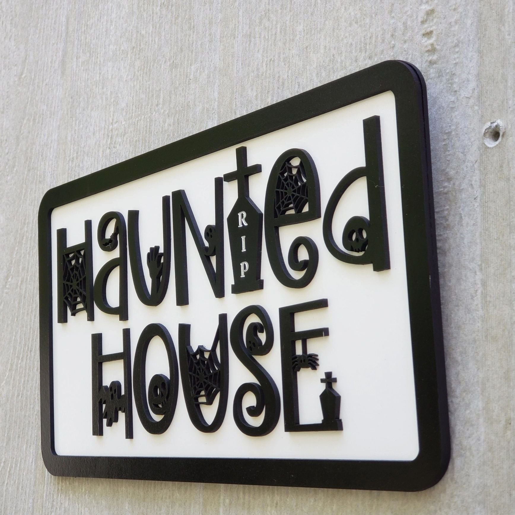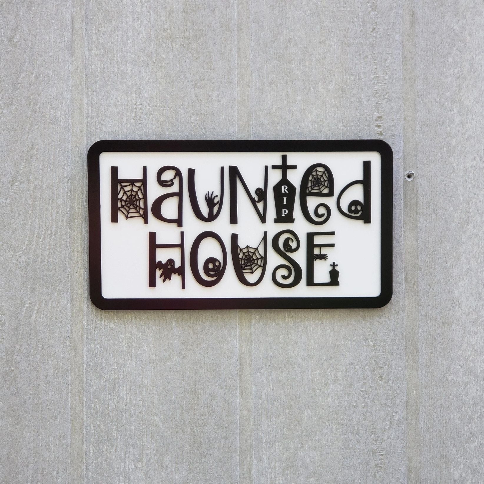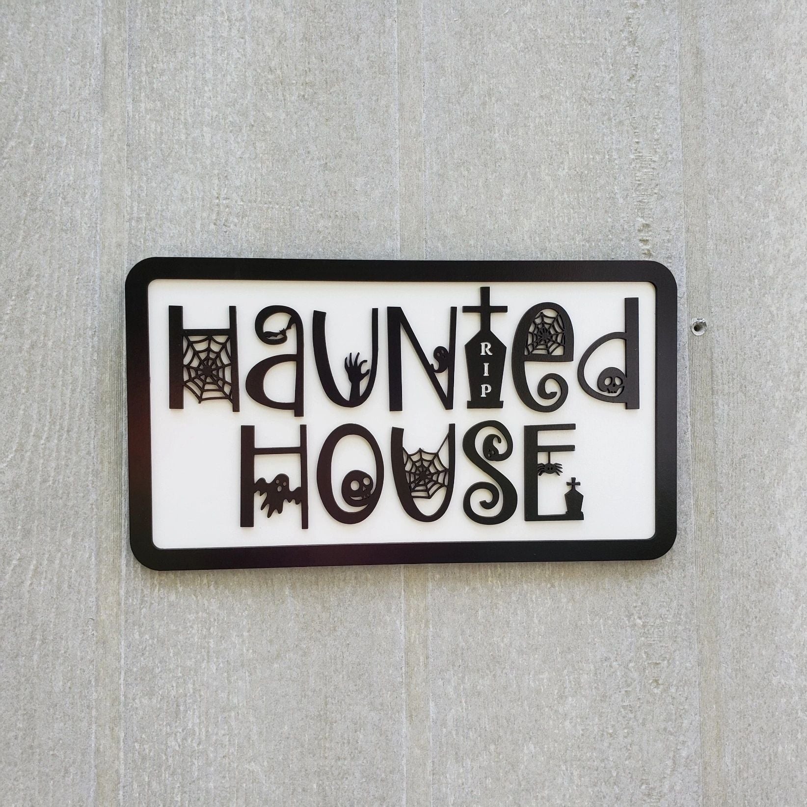 Haunted House Halloween Wall Sign This classic black and white haunted house sign will seamlessly blend with any Halloween decor. The sign is 2 layers of black and white MDF that have been laser cut. Thie haunted house sign measures 14.5. x 8 x .25" A sawtooth hanger is attached to the back for easy hanging or you can set it on any shelf.
