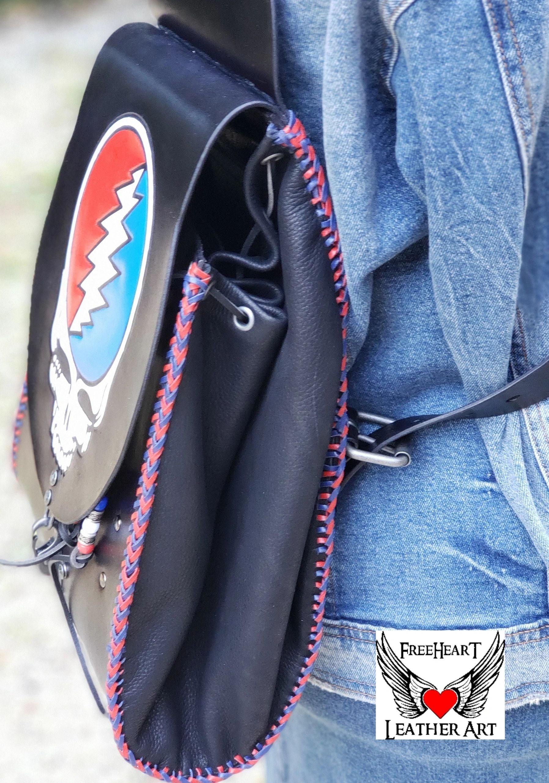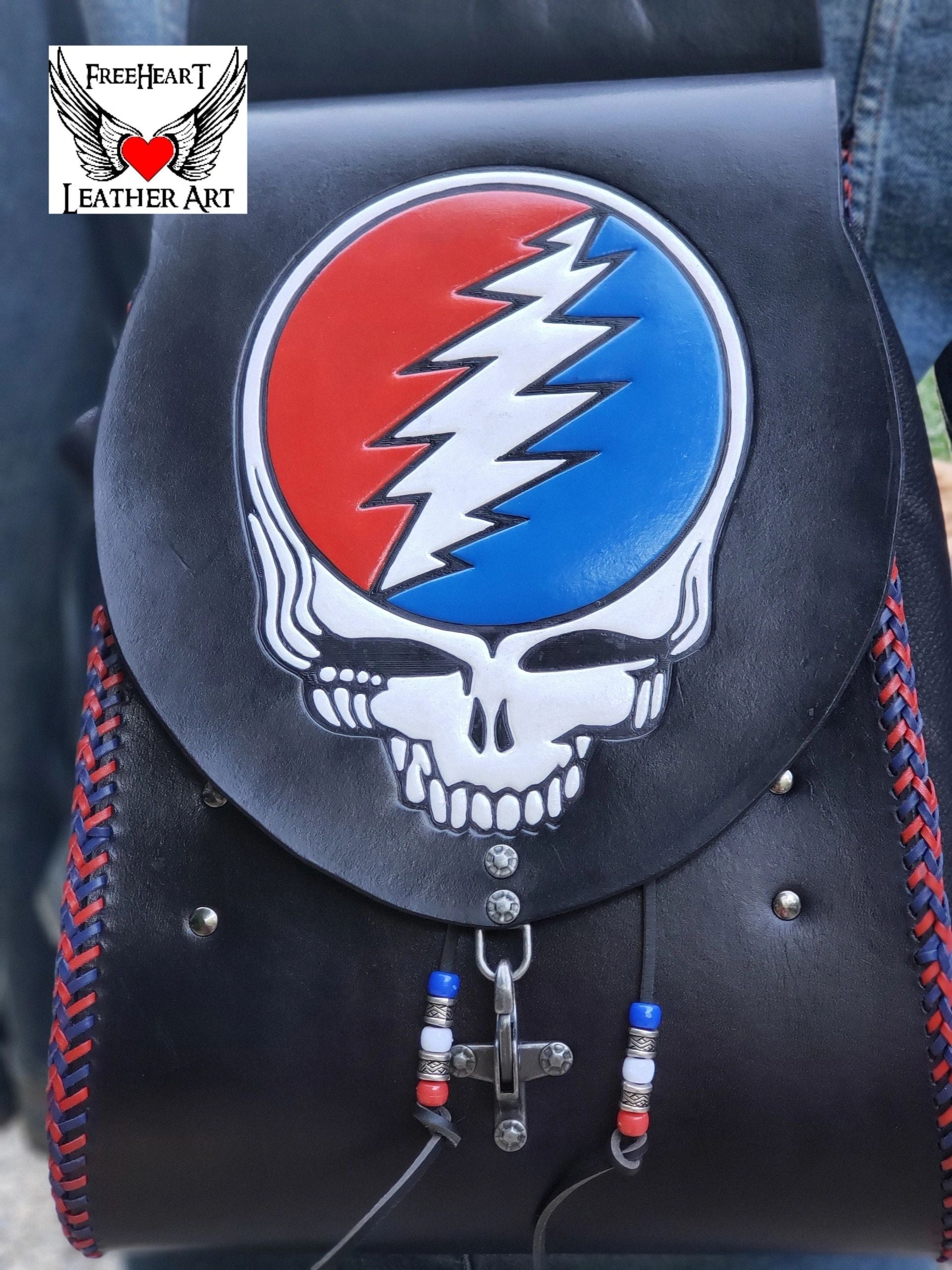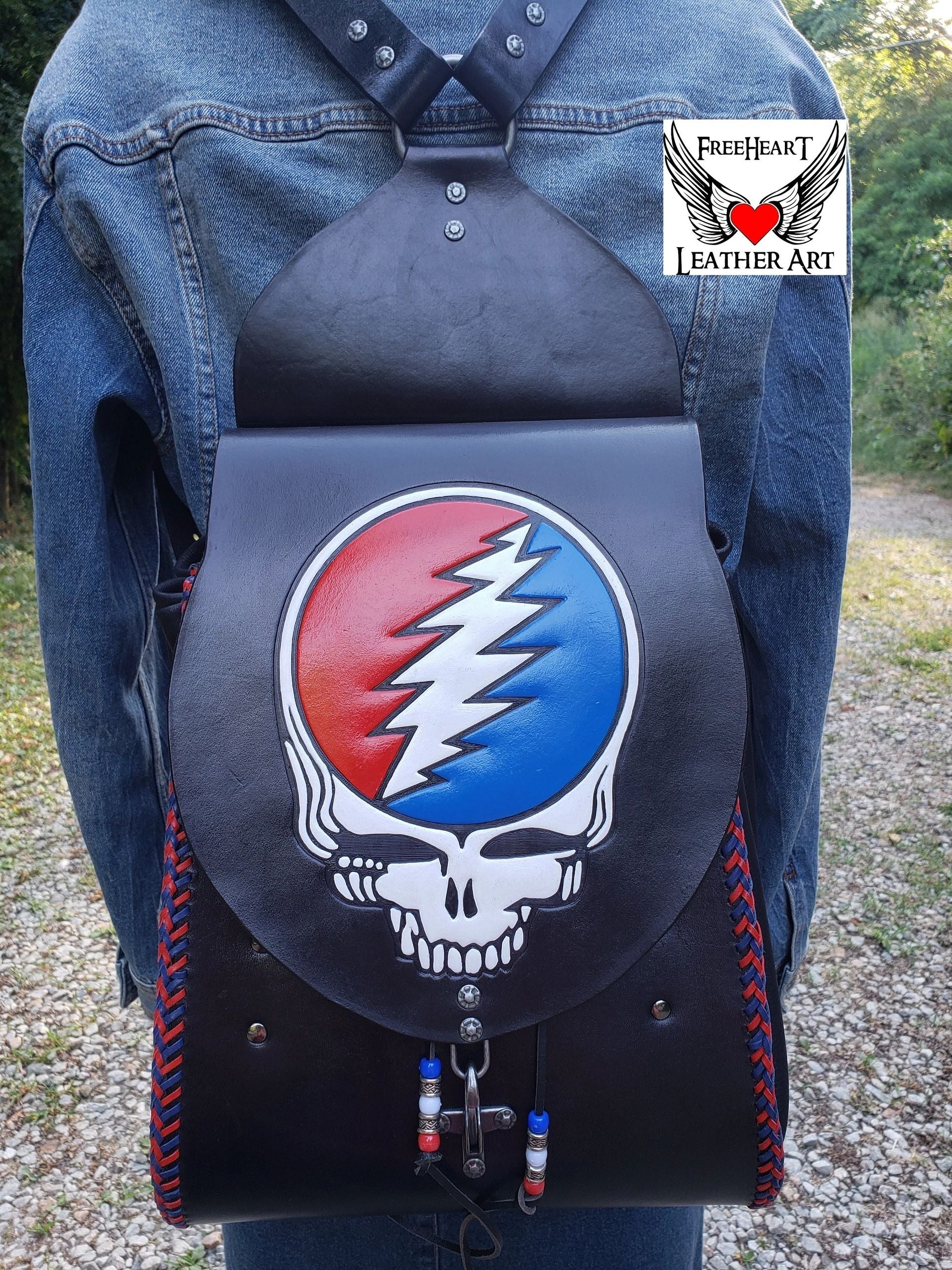 Handmade Leather Grateful Dead "Steal Your Face" Backpack ⚡More items are available on my website https://freeheartleatherart.com ⚡ Leather backpack with tooled "Steal Your Face" Skull and dual-color kangaroo lacing. Made from 6 oz. vegetable-tanned leather dyed black and painted, red, white, and blue. The sides are cut from super-soft deer-tanned cowhide. The closure is a nautical-style hook clasp. Removable 13-point lightning should pads and cross-chest buckle for added comfort when wearing for long periods. Inside are 2 pockets. One in front to slip your phone into and a secure zipper pocket for those valuables. The backpack measures approximately - tapers from the bottom 10 inches wide to top 9 inches wide. Depth from 3 to 6 inches with drawstring expansion. 25 - 35 inch strap length. Handmade in our shop from quality genuine leather products. Treated with Fiebing's Resolene as a sealer and water resistor. Leather conditioner should be applied periodically to maintain the finish.