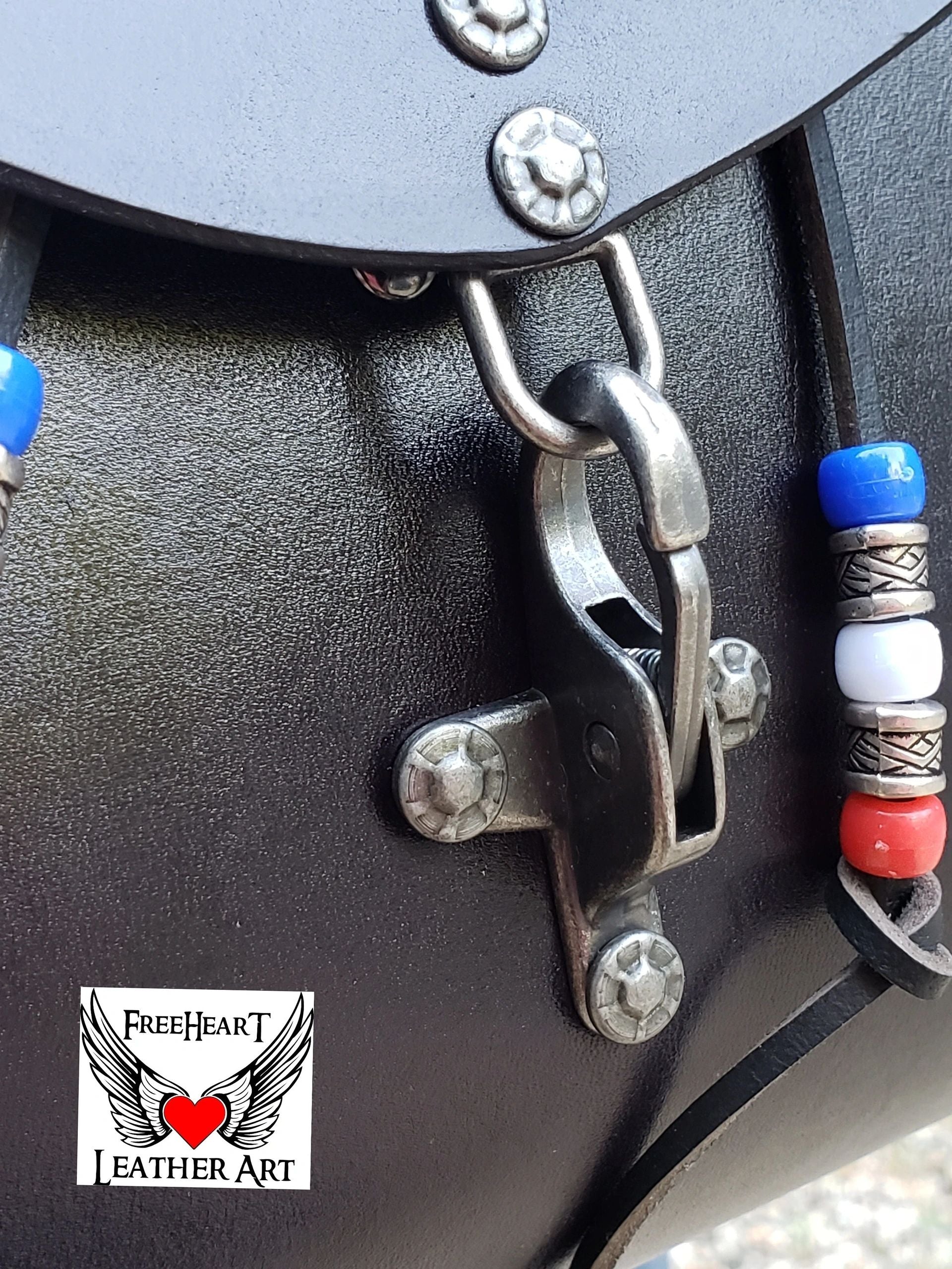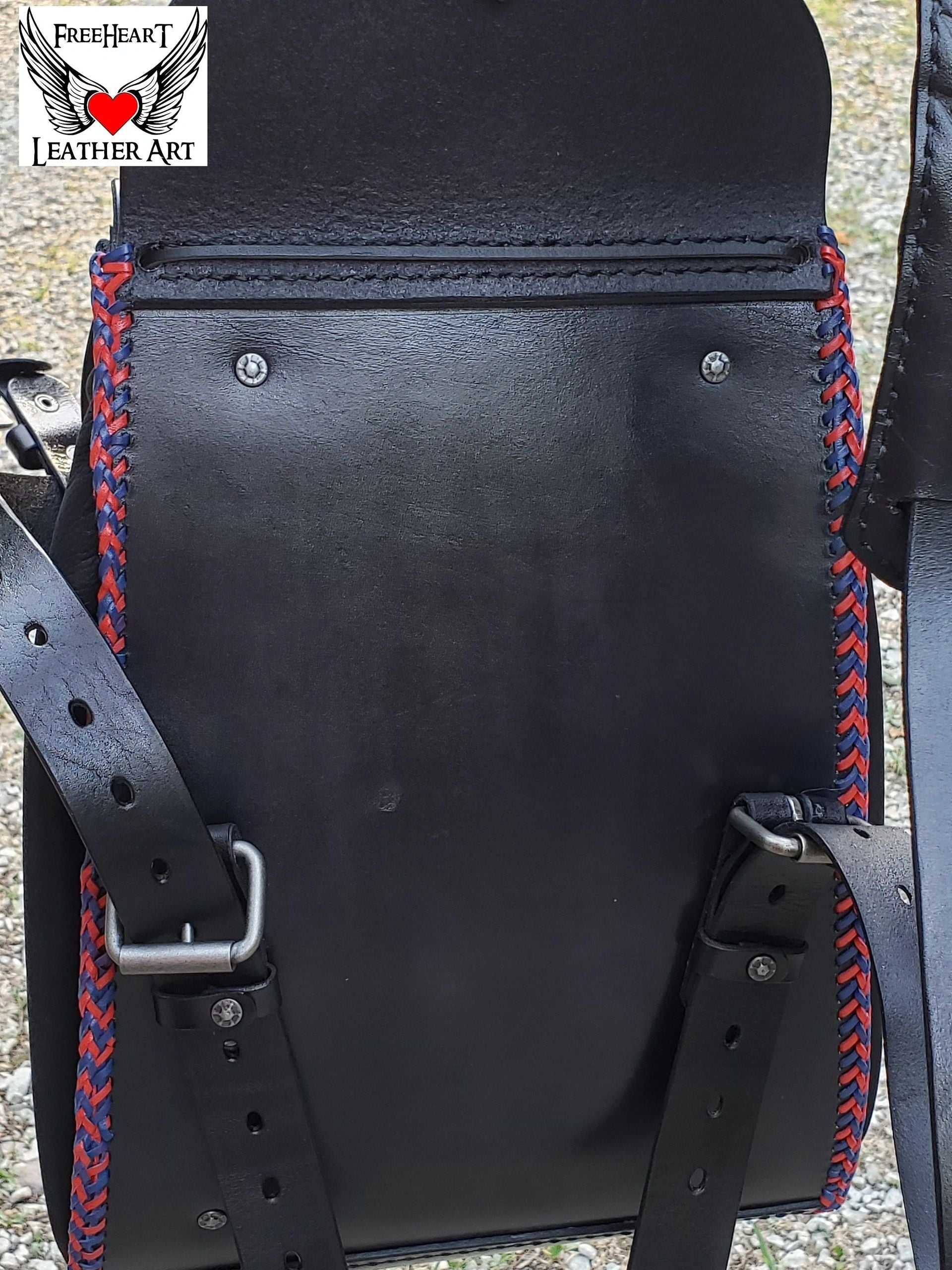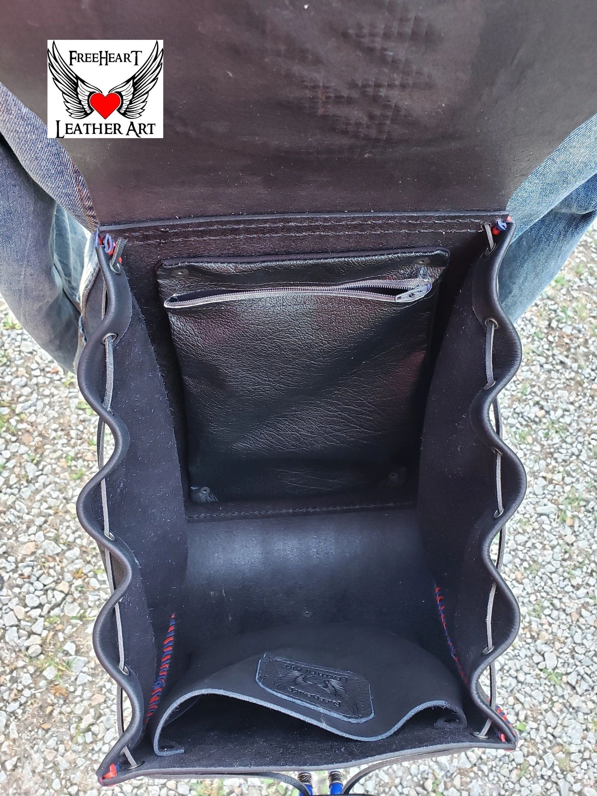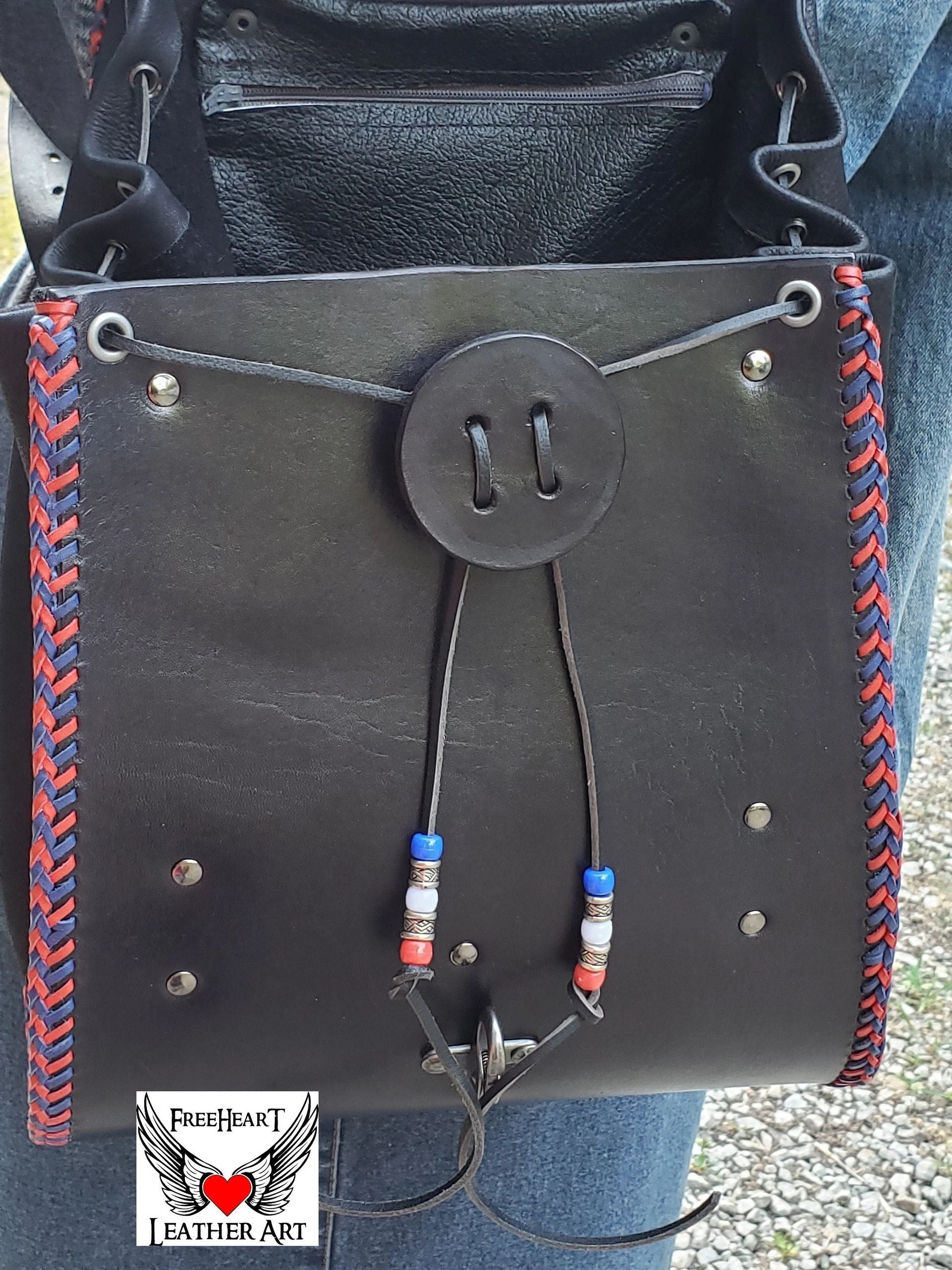 Handmade Leather Grateful Dead "Steal Your Face" Backpack ⚡More items are available on my website https://freeheartleatherart.com ⚡ Leather backpack with tooled "Steal Your Face" Skull and dual-color kangaroo lacing. Made from 6 oz. vegetable-tanned leather dyed black and painted, red, white, and blue. The sides are cut from super-soft deer-tanned cowhide. The closure is a nautical-style hook clasp. Removable 13-point lightning should pads and cross-chest buckle for added comfort when wearing for long periods. Inside are 2 pockets. One in front to slip your phone into and a secure zipper pocket for those valuables. The backpack measures approximately - tapers from the bottom 10 inches wide to top 9 inches wide. Depth from 3 to 6 inches with drawstring expansion. 25 - 35 inch strap length. Handmade in our shop from quality genuine leather products. Treated with Fiebing's Resolene as a sealer and water resistor. Leather conditioner should be applied periodically to maintain the finish.