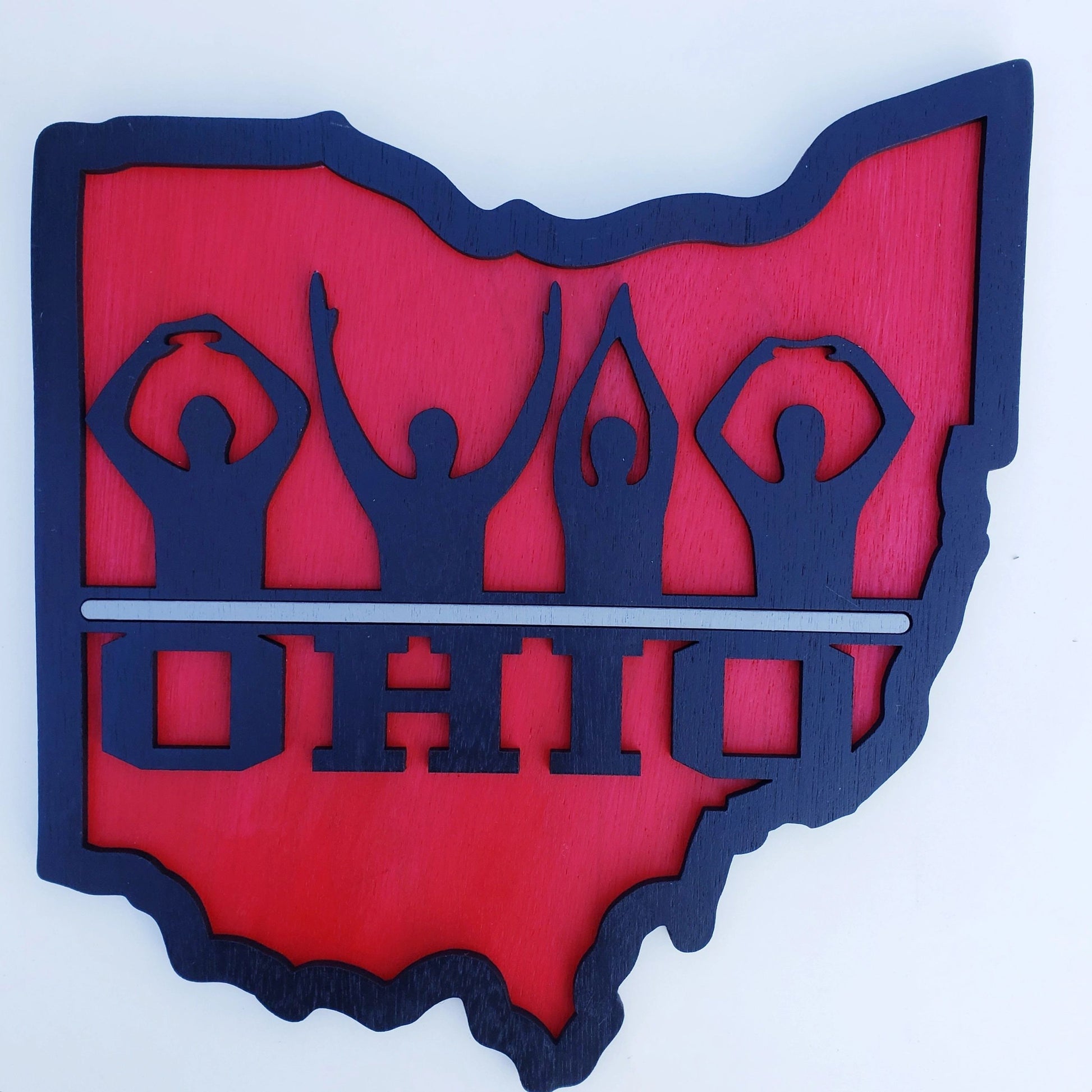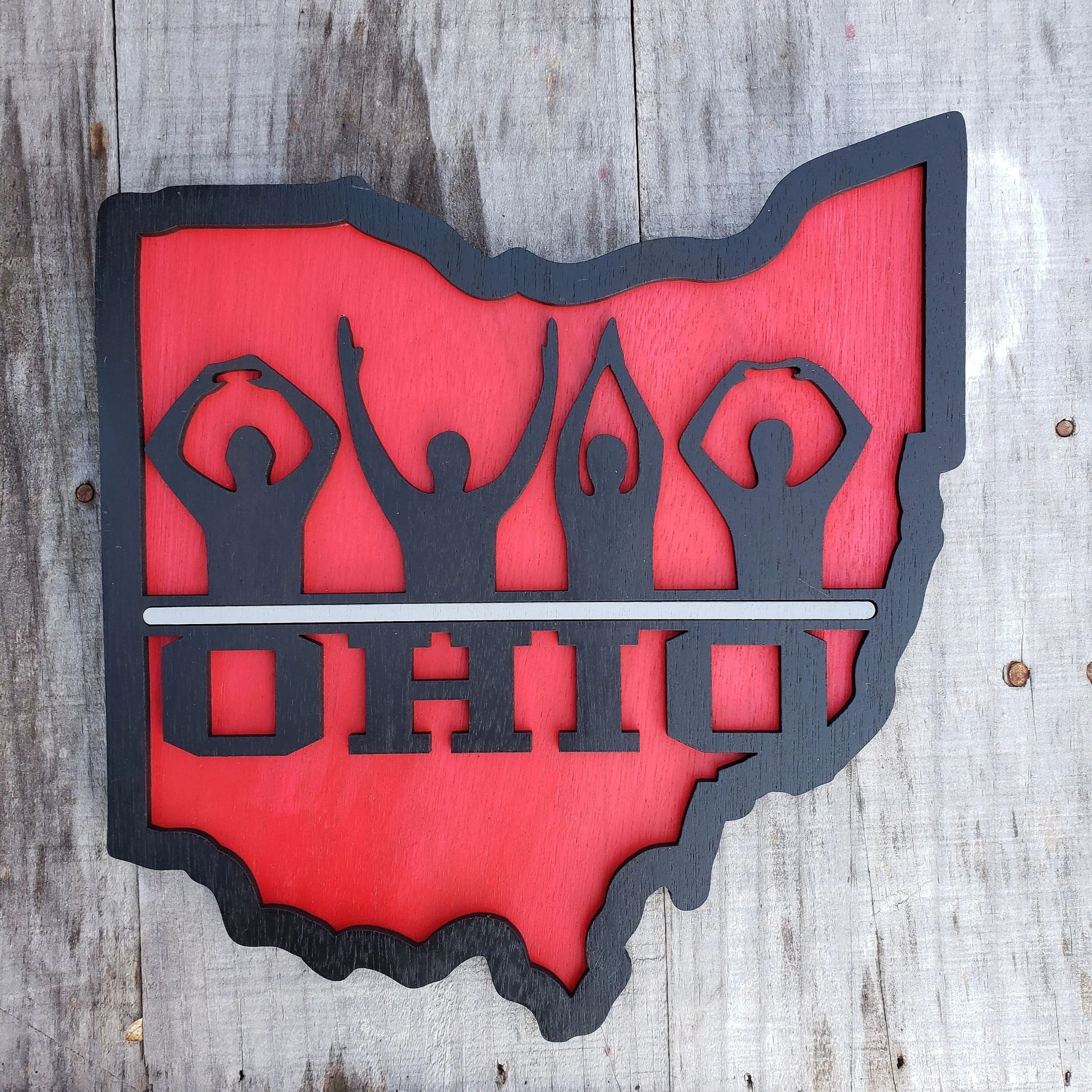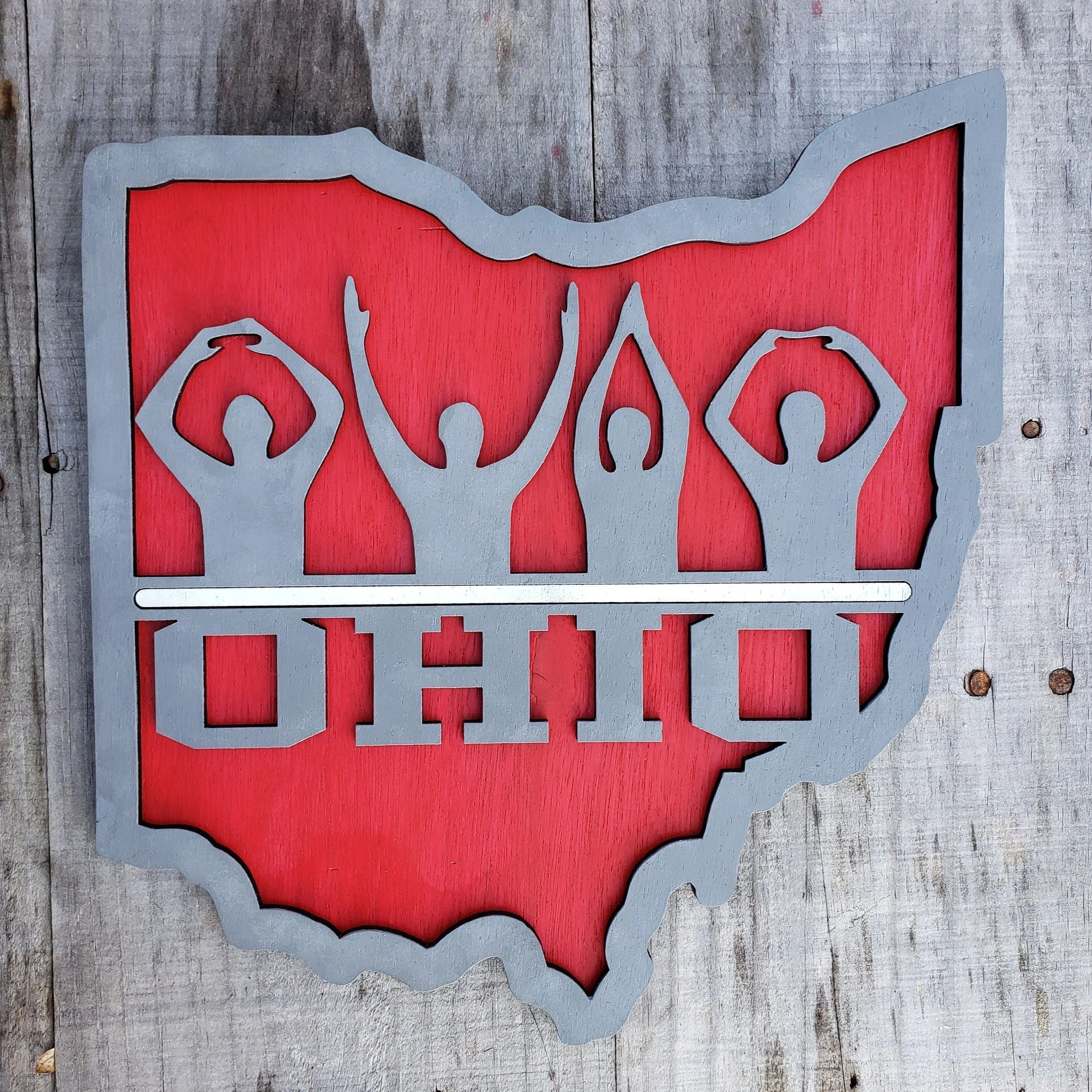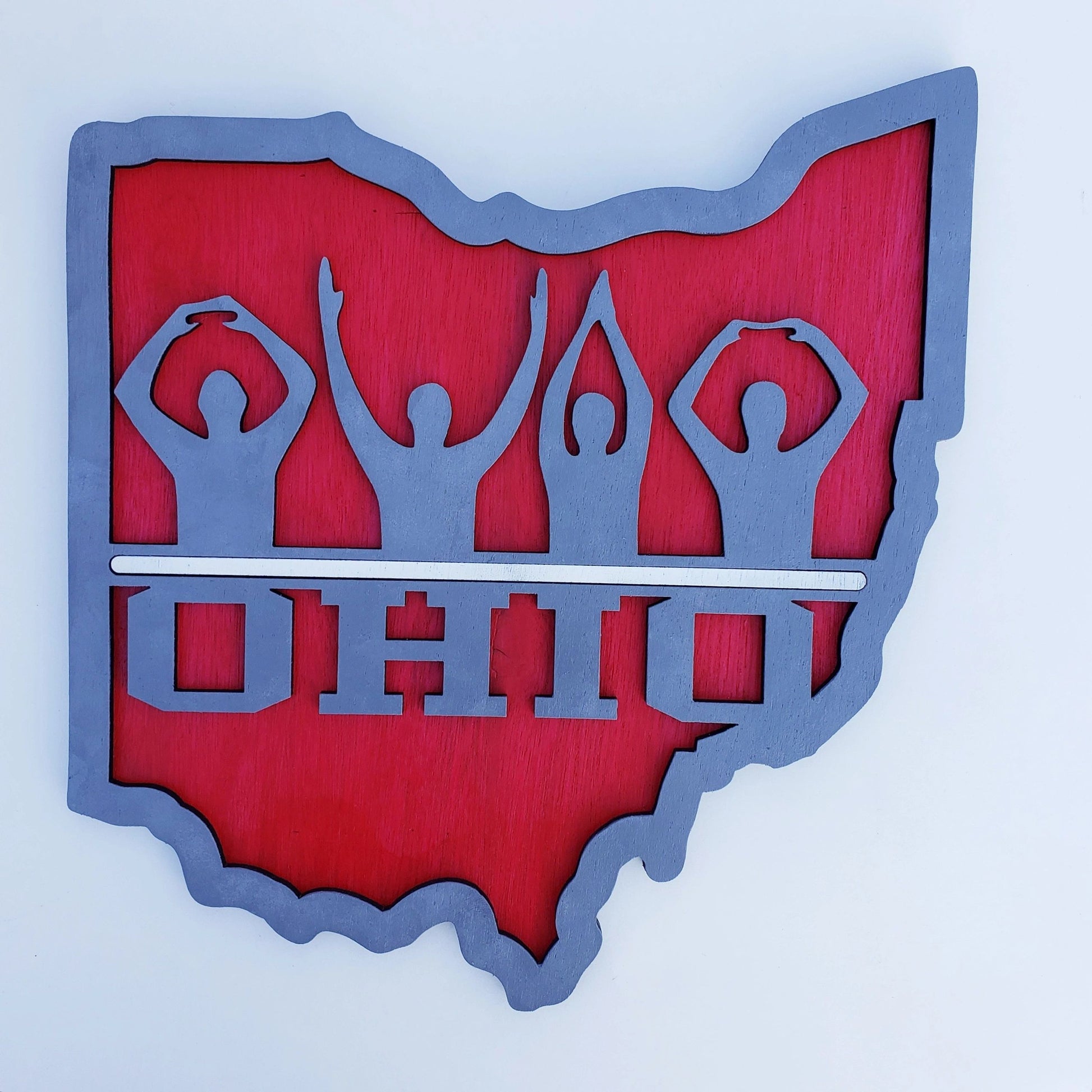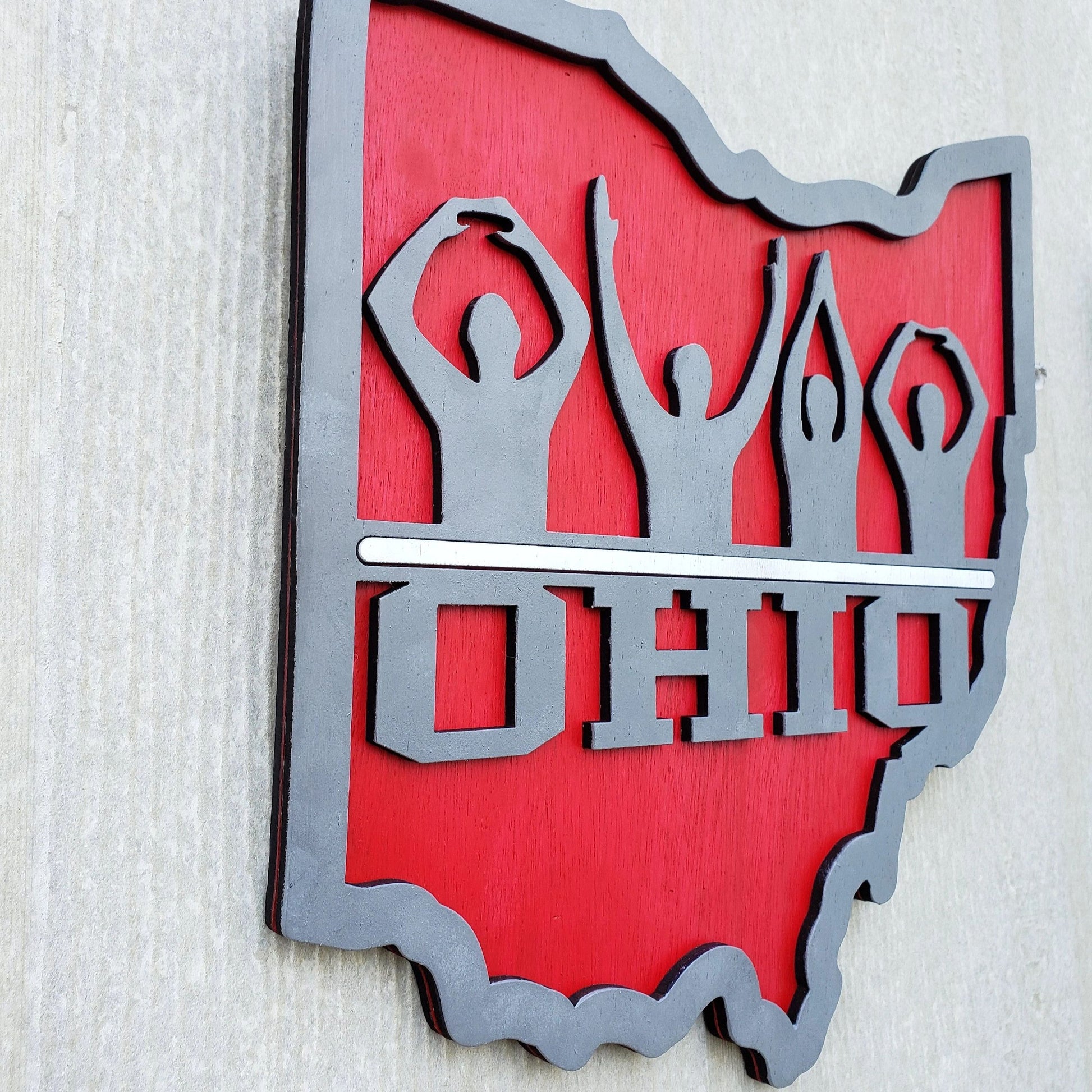 Ohio State Wall Sign, O-H-I-O Sign Don't be shy, show your O-H-I-O pride with this eye-catching wall sign. This is a great addition to any game room or a gift. Get yours today and make your friends drool the next game day. Laser-cut from birch wood. Painted in a combination of scarlet, white, black, and grey. Hang with a sawtooth hanger attached to the back. Measures 12"w x 12.75"h x .50"