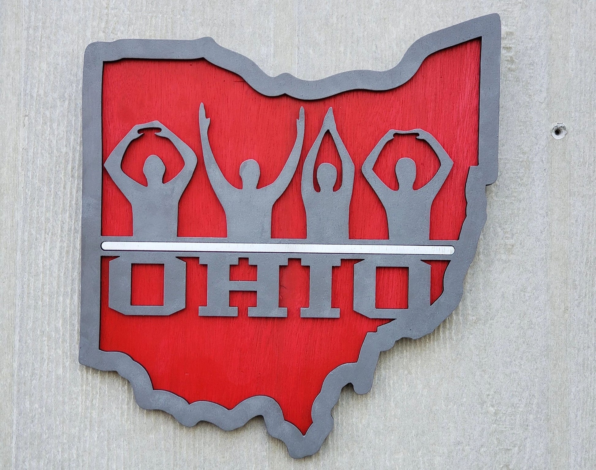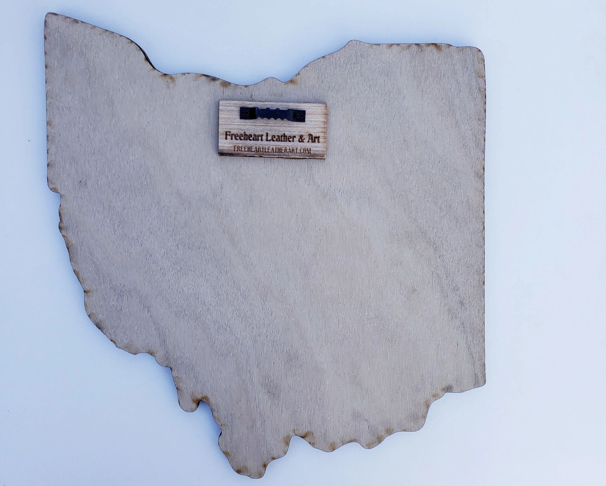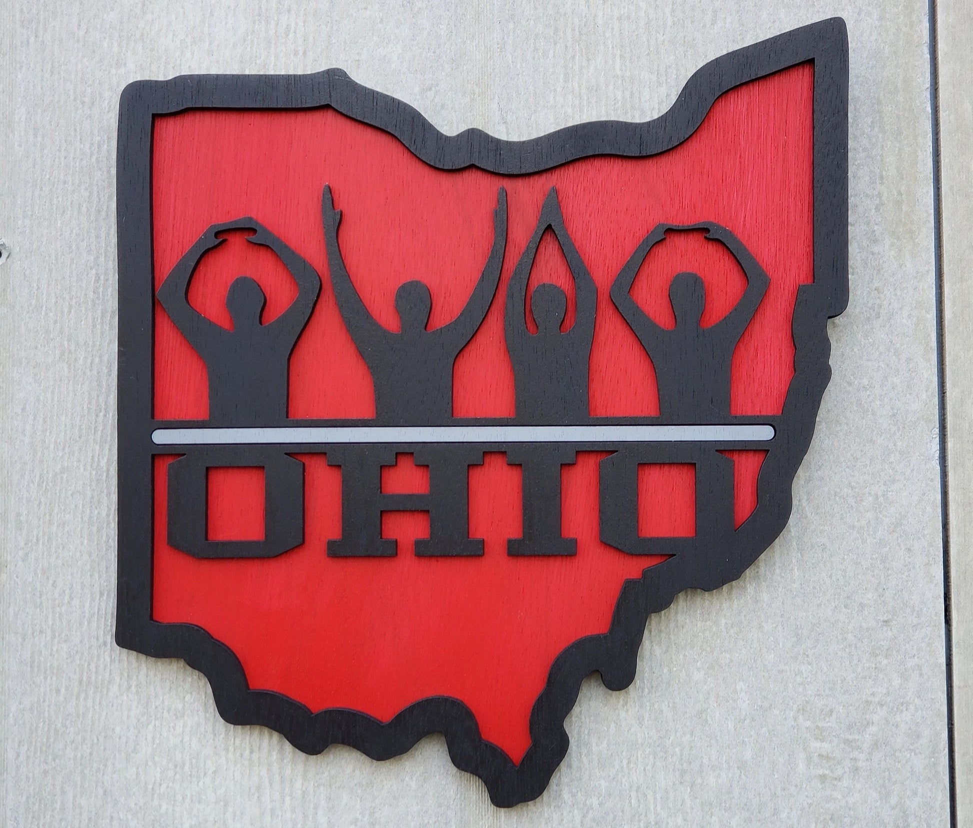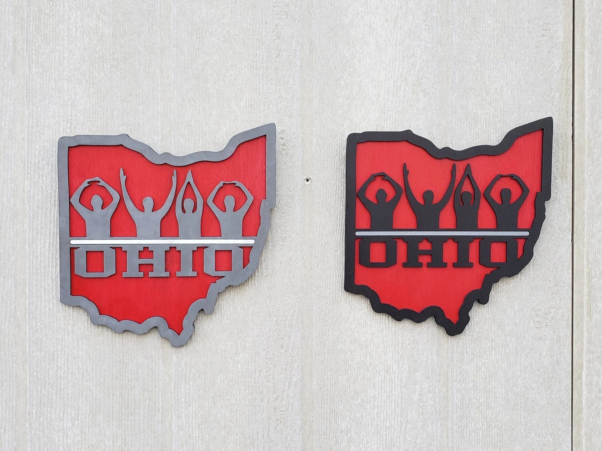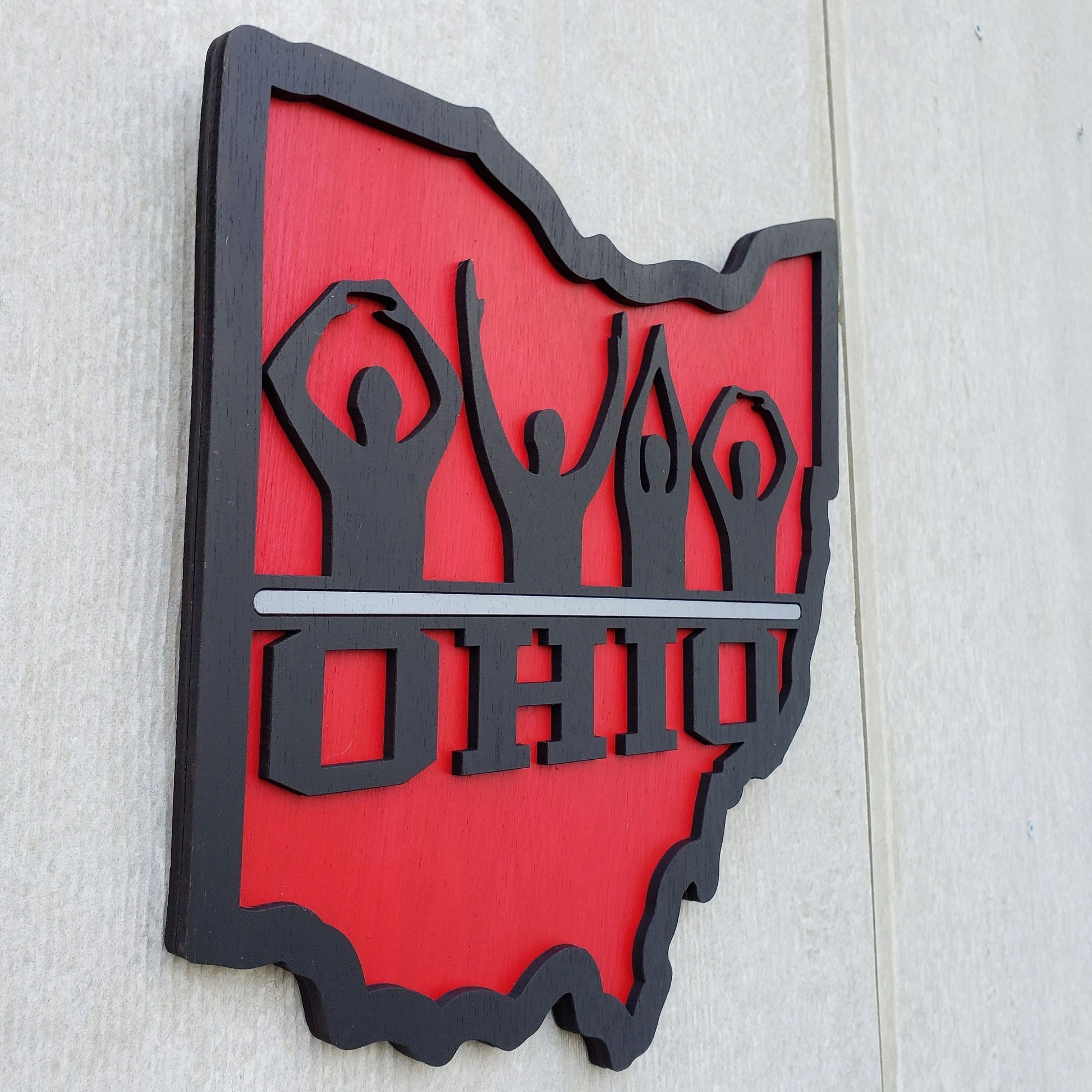 Ohio State Wall Sign, O-H-I-O Sign Don't be shy, show your O-H-I-O pride with this eye-catching wall sign. This is a great addition to any game room or a gift. Get yours today and make your friends drool the next game day. Laser-cut from birch wood. Painted in a combination of scarlet, white, black, and grey. Hang with a sawtooth hanger attached to the back. Measures 12"w x 12.75"h x .50"
