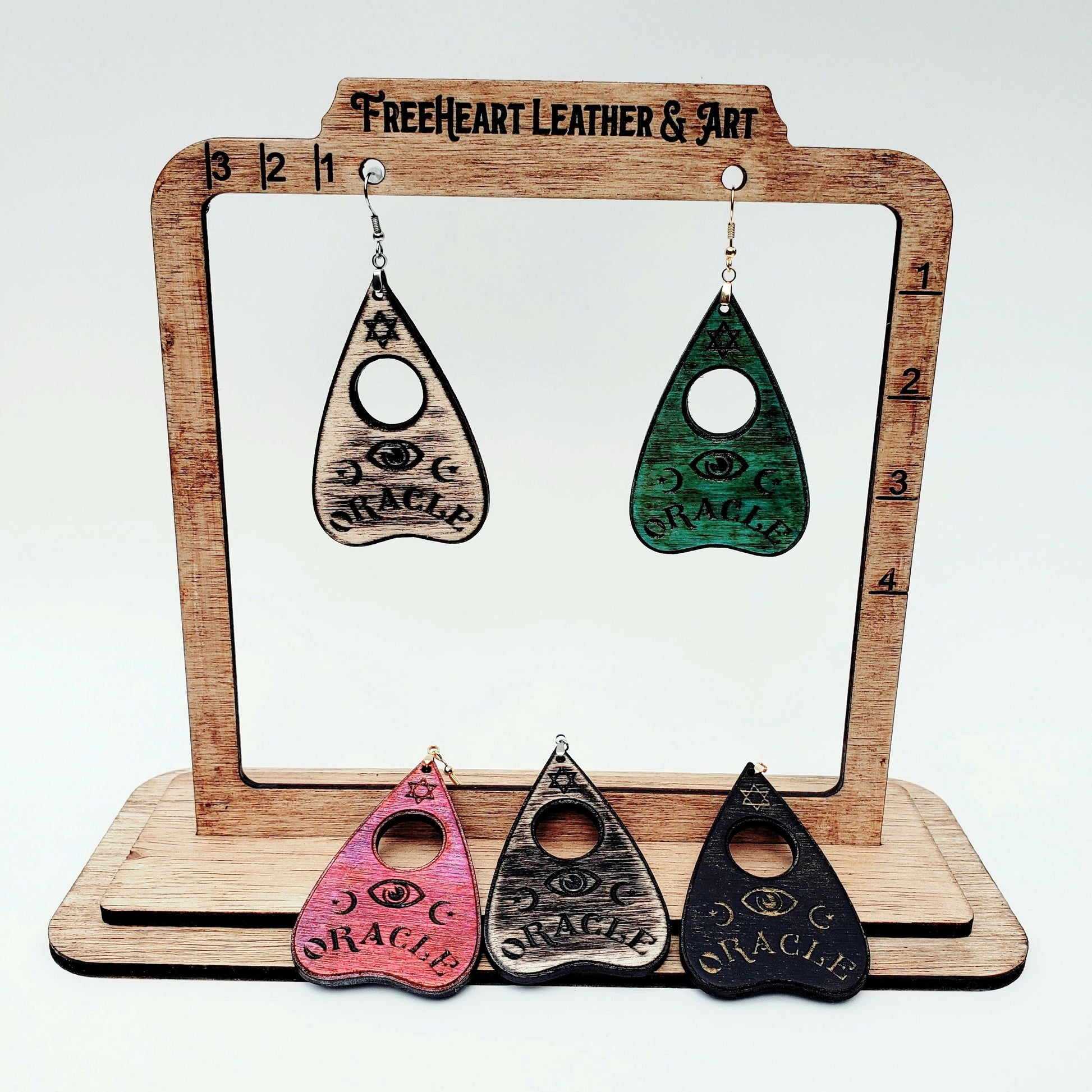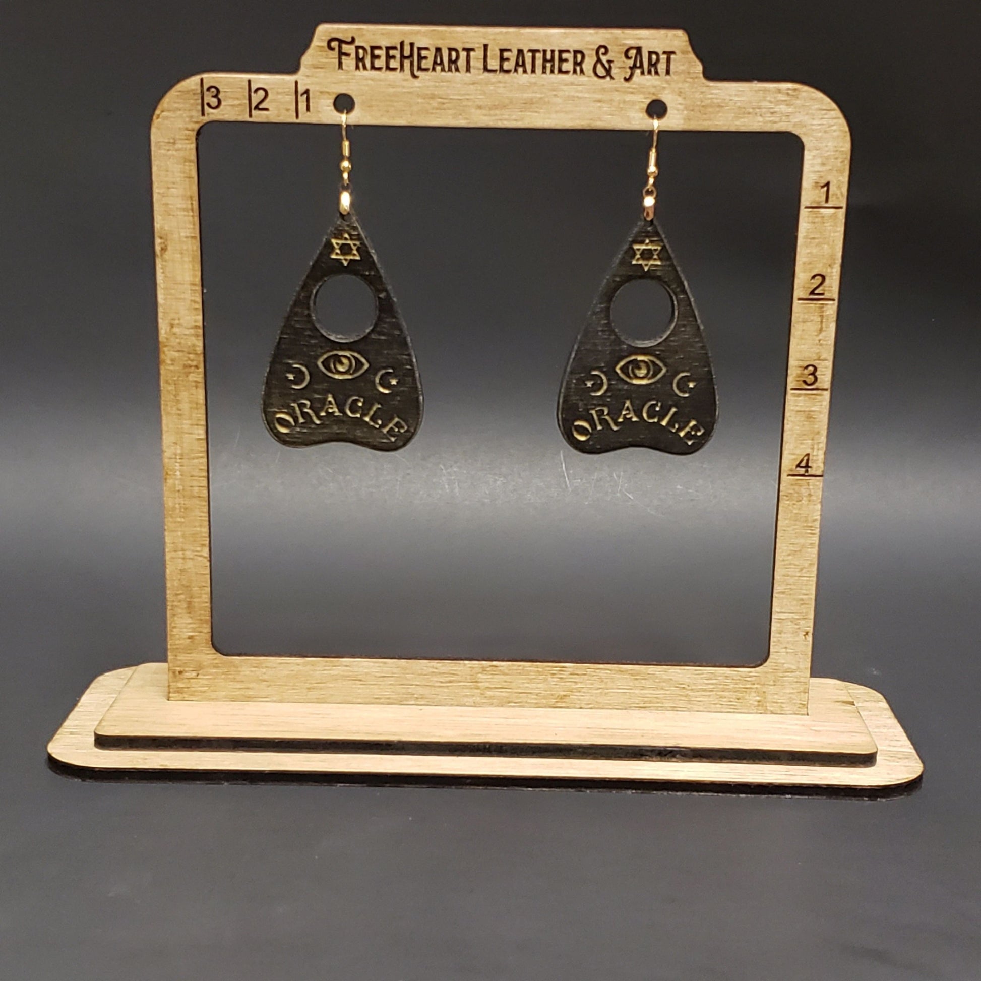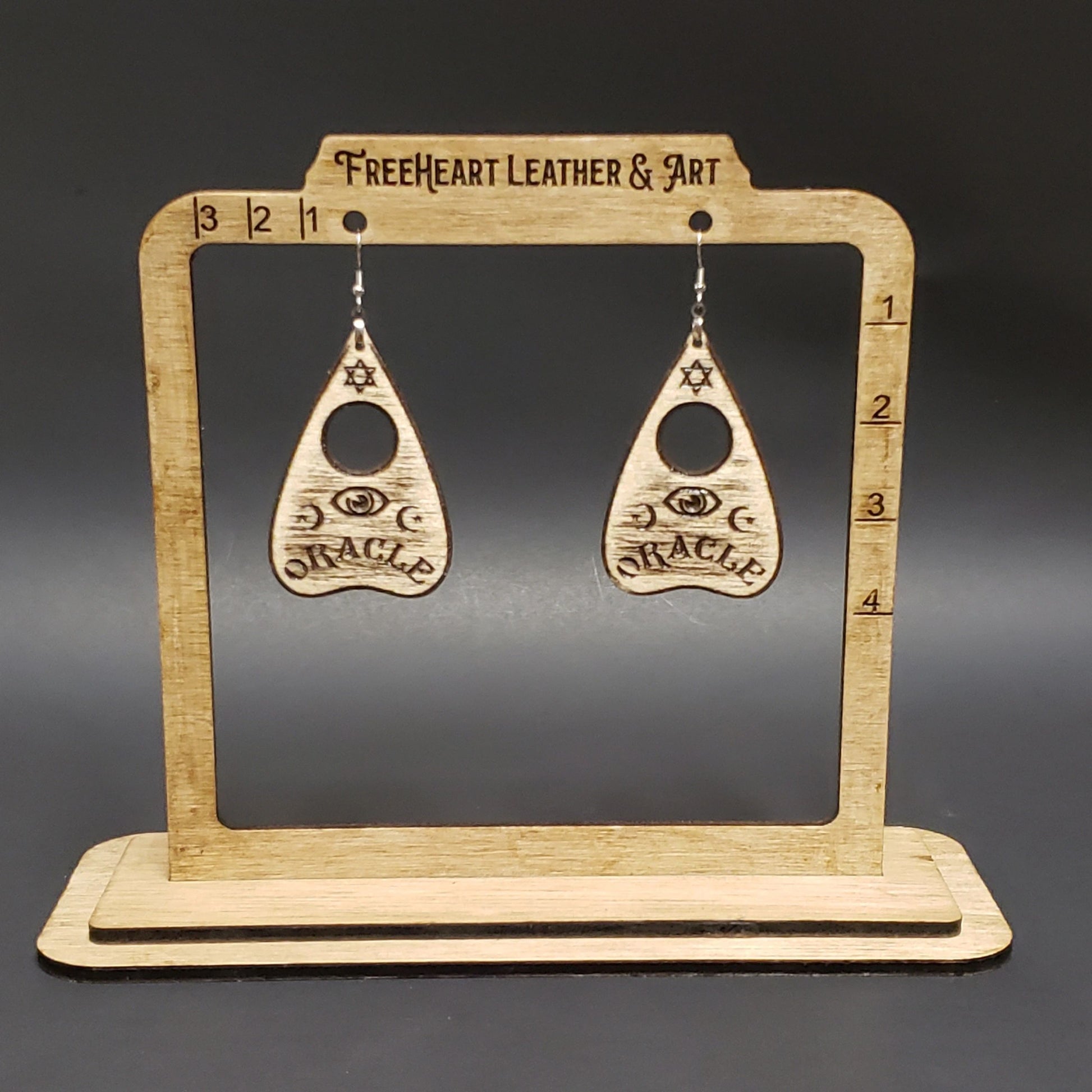 Oracle Dangle Earrings These earrings are Laser-cut and engraved Oracle/Planchette dangle earrings. The birch wood can be dyed any color and antiqued for a vintage look. Great for Halloween or any time of year.