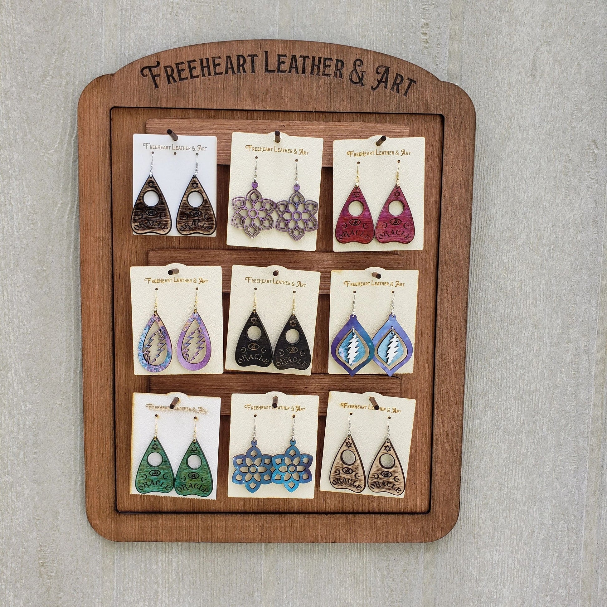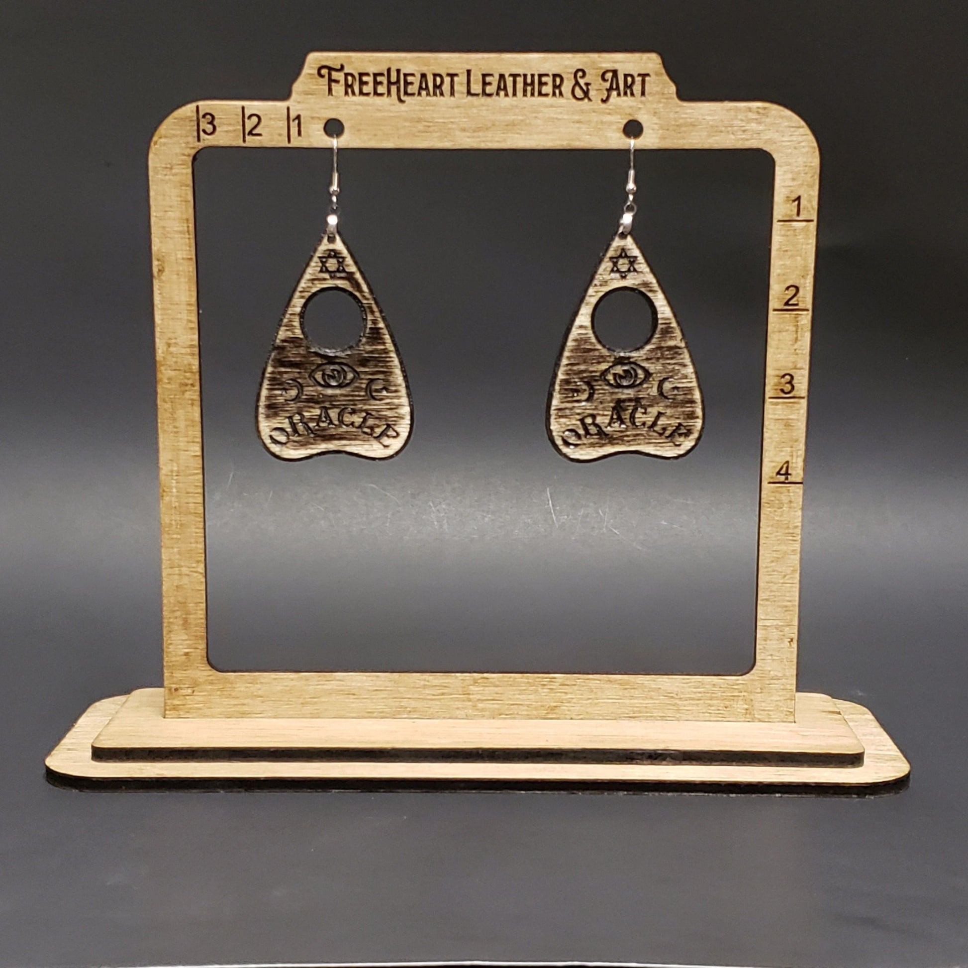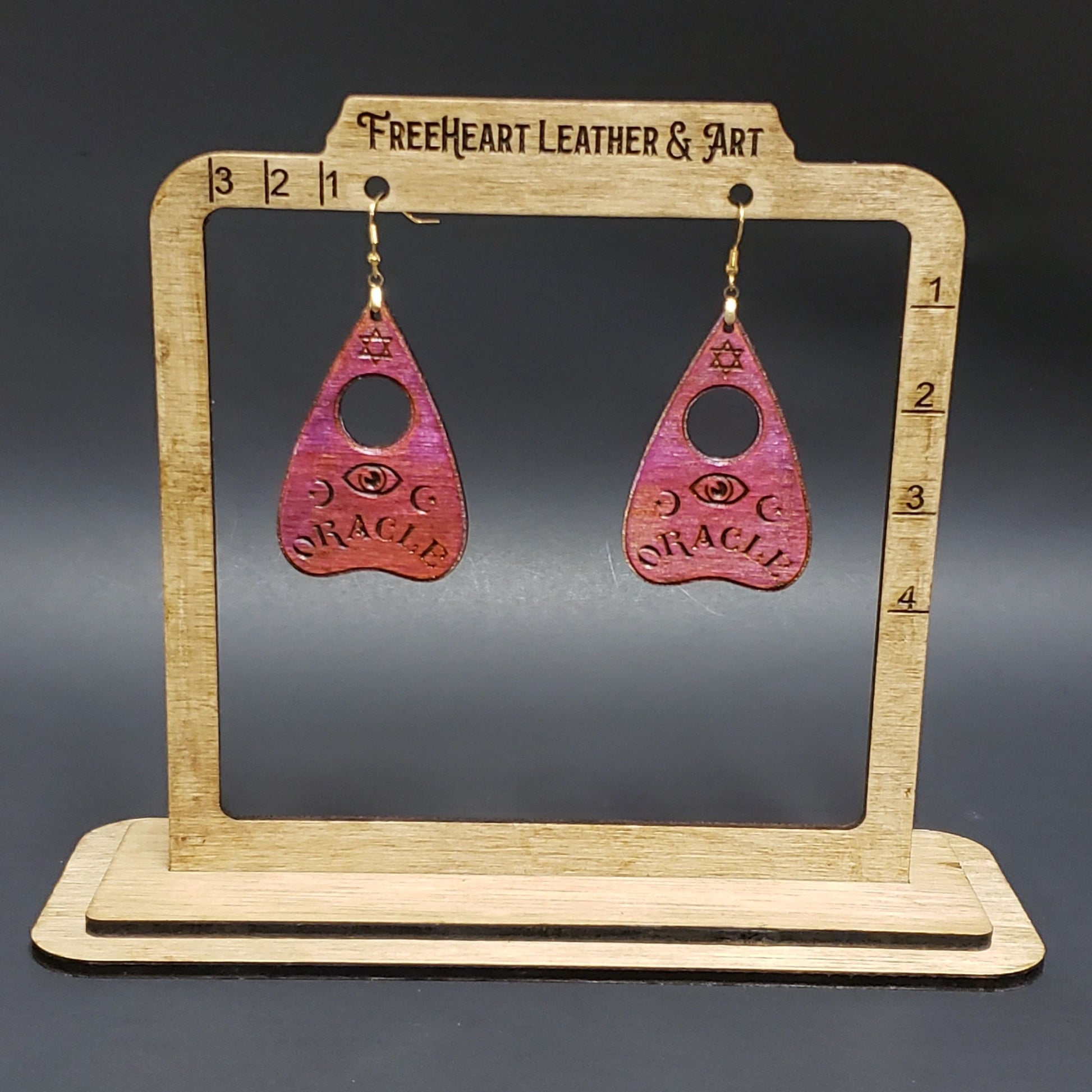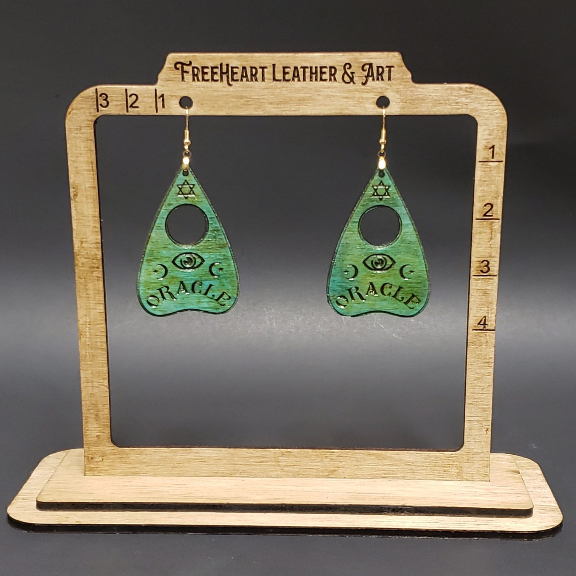 Oracle Dangle Earrings These earrings are Laser-cut and engraved Oracle/Planchette dangle earrings. The birch wood can be dyed any color and antiqued for a vintage look. Great for Halloween or any time of year.