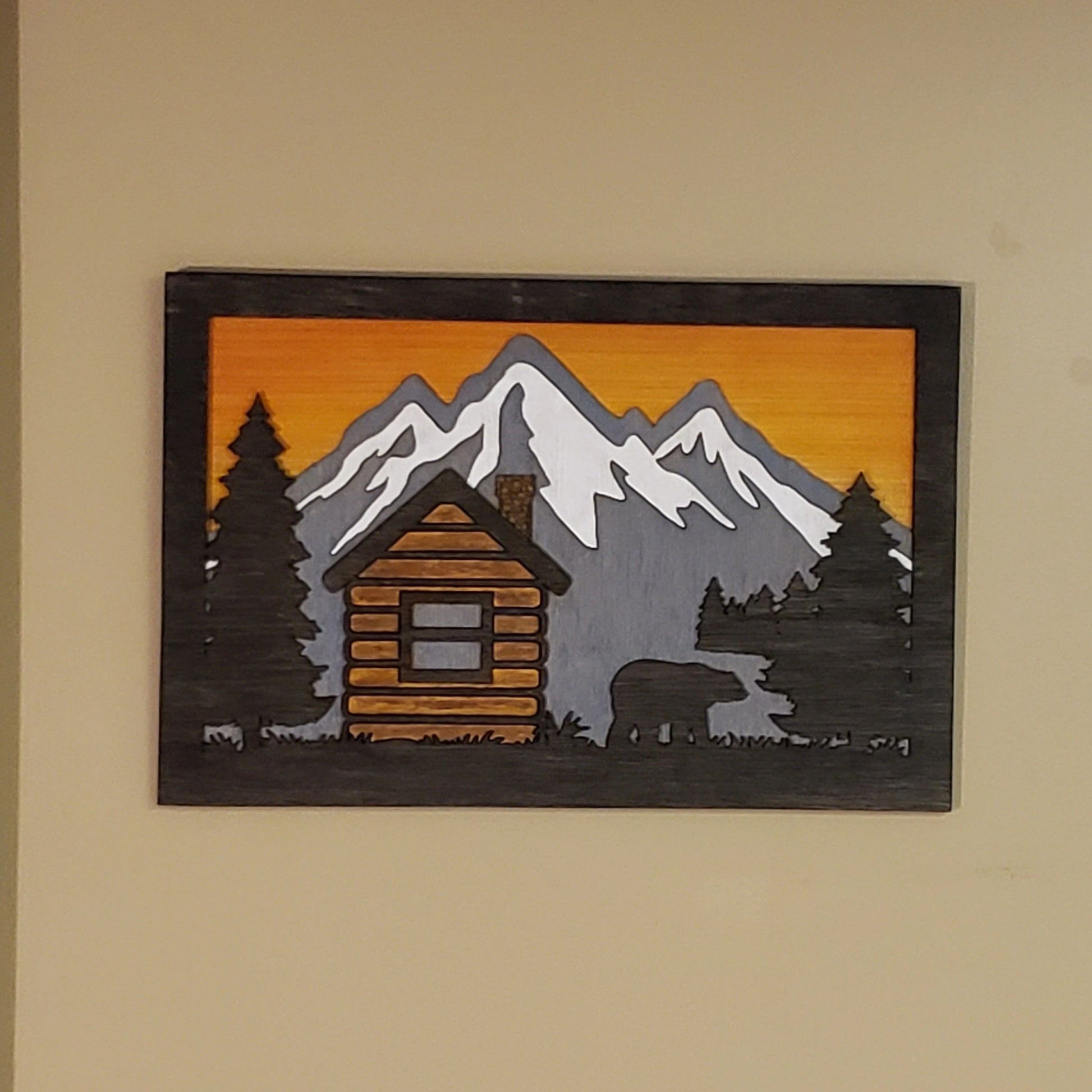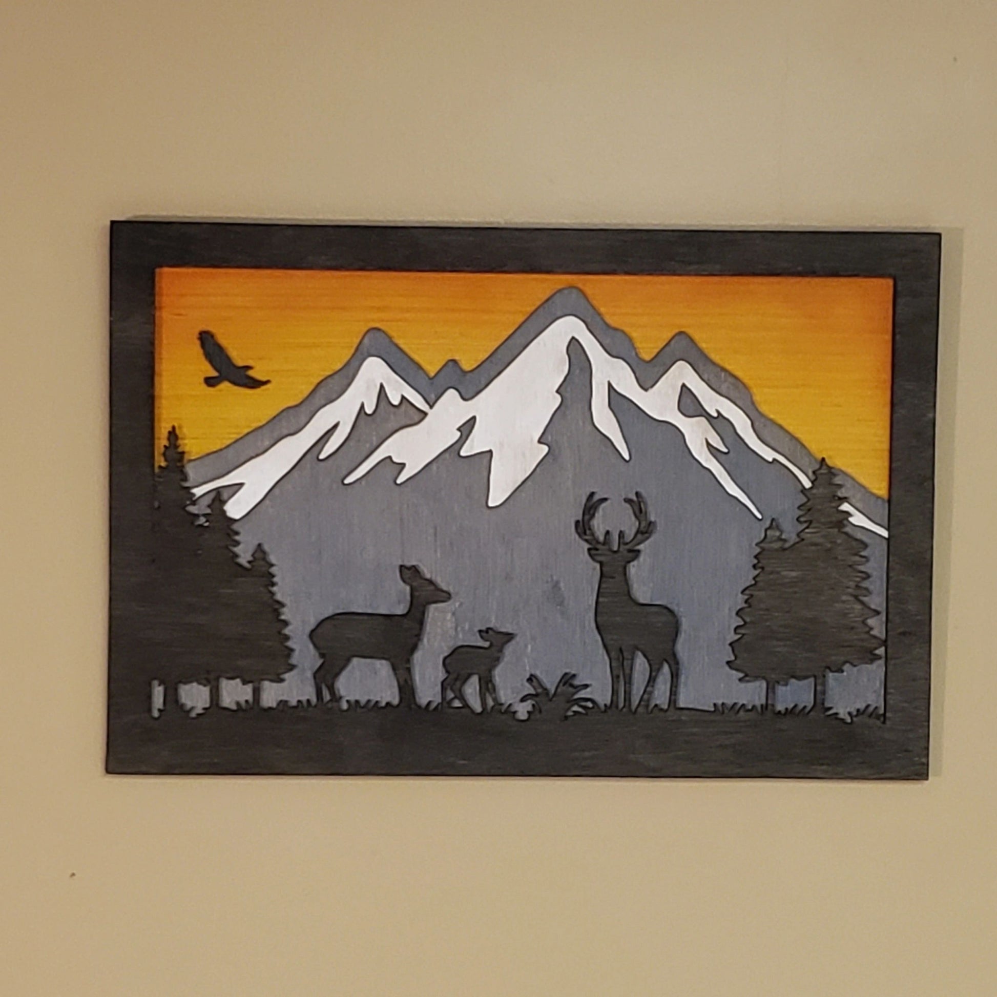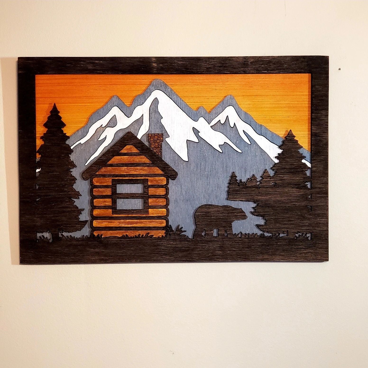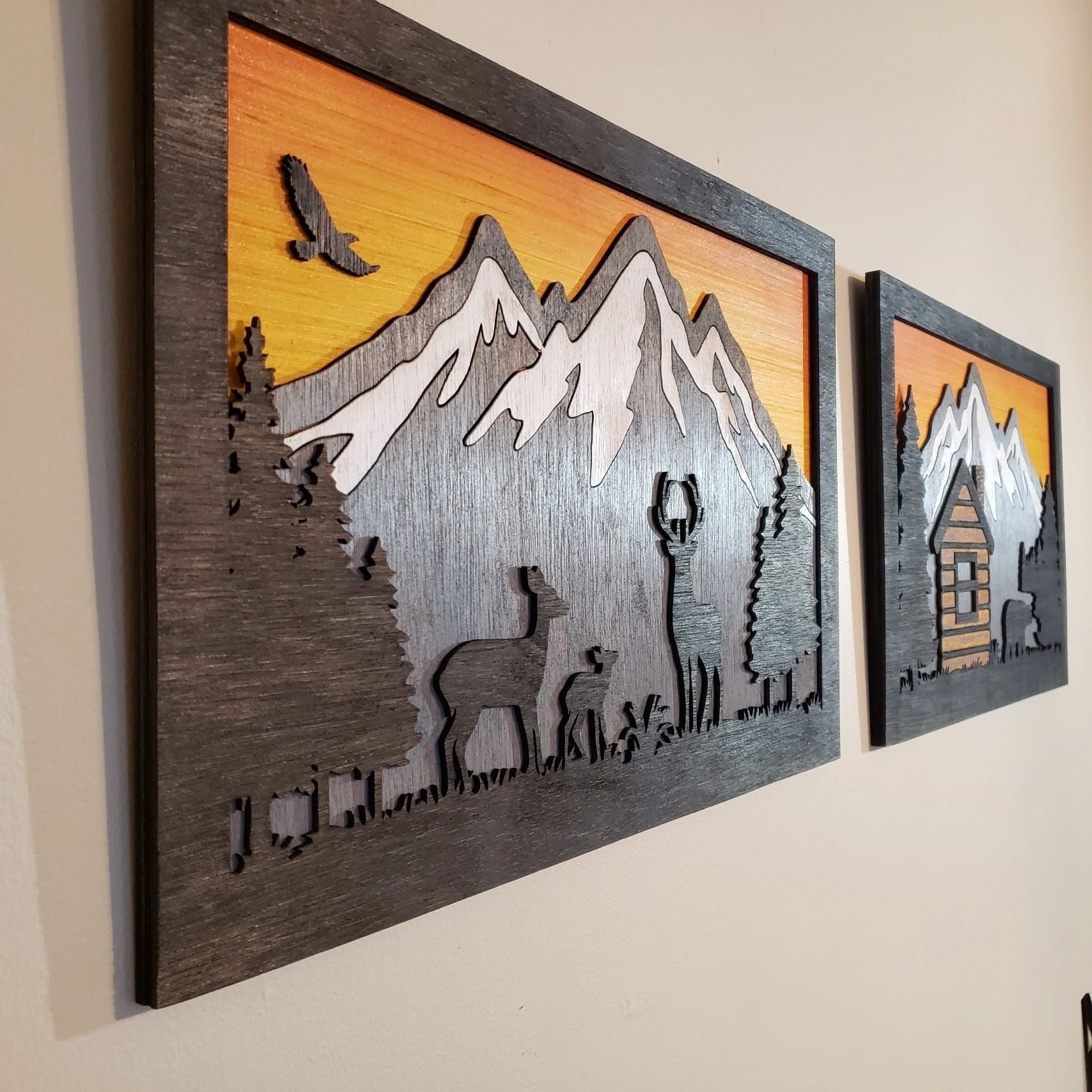 Each picture is laser cut from a mix of 1/4 and 1/8 inch wood. Hand stained with a mix of colors including Charred Wood, Weathered Grey, Amber, White Wash. The sky is airbrushed with dye. The back is painted and the whole piece has been sealed.