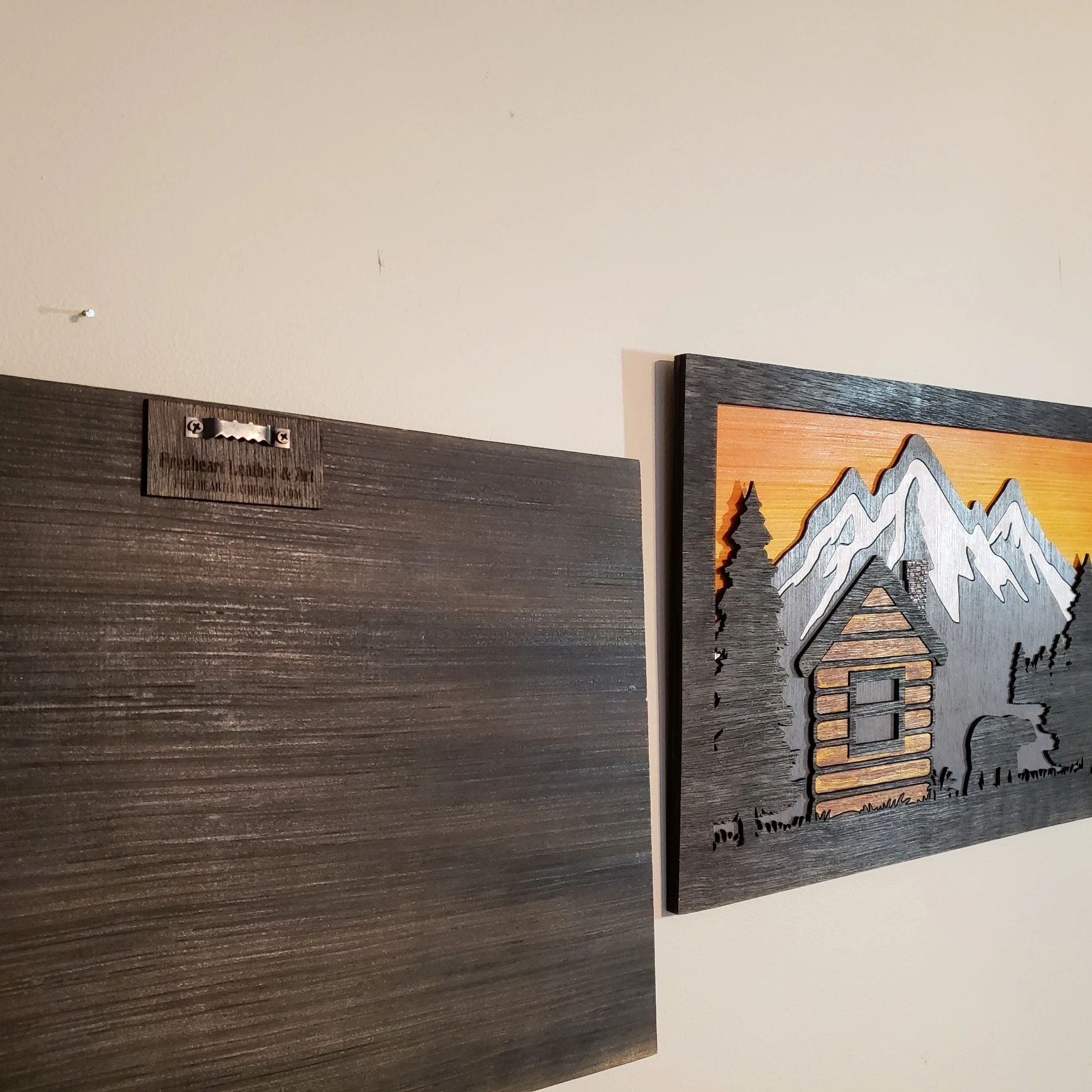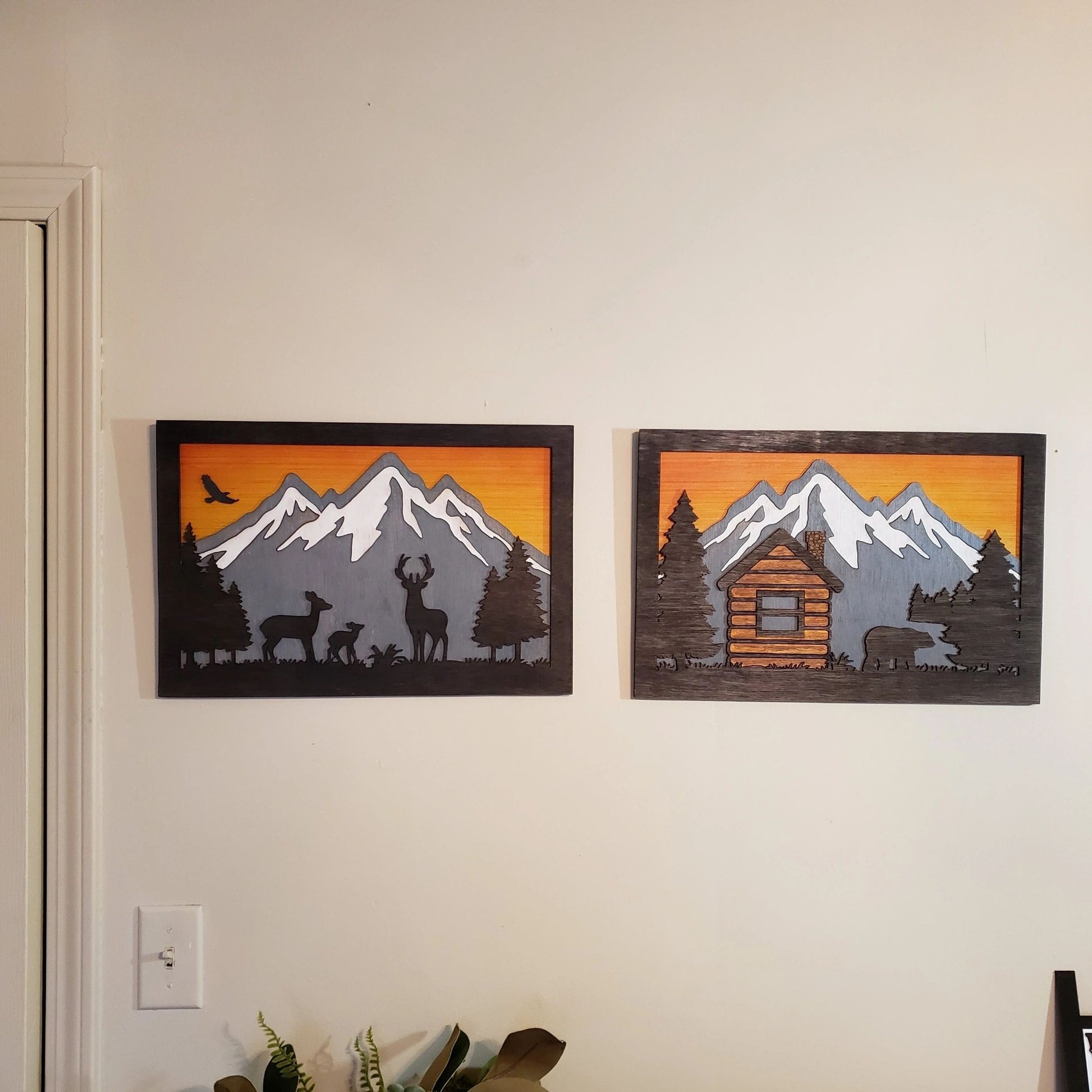 These beautiful pieces of wood wildlife wall art will brighten up any wall. Nature and Wildlife features a silhouetted view of either a buck, doe, & fawn. Also a log cabin with a bear. You can use each piece separately or purchase both for a warm wall spanning punch.