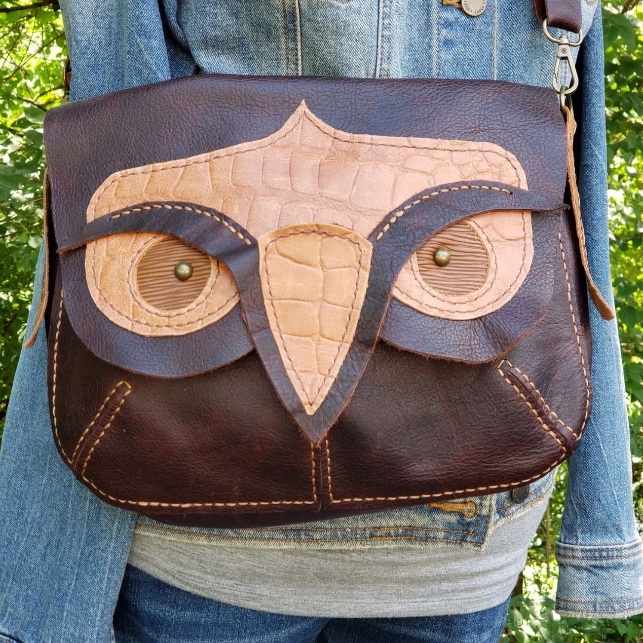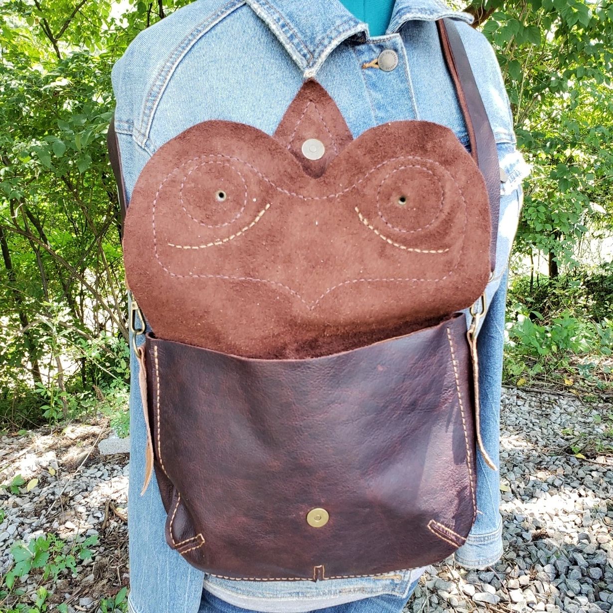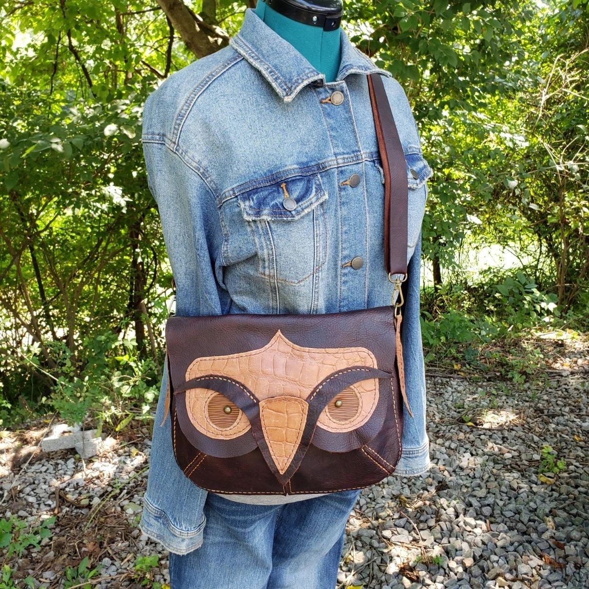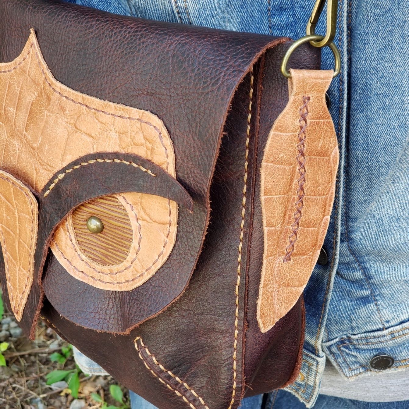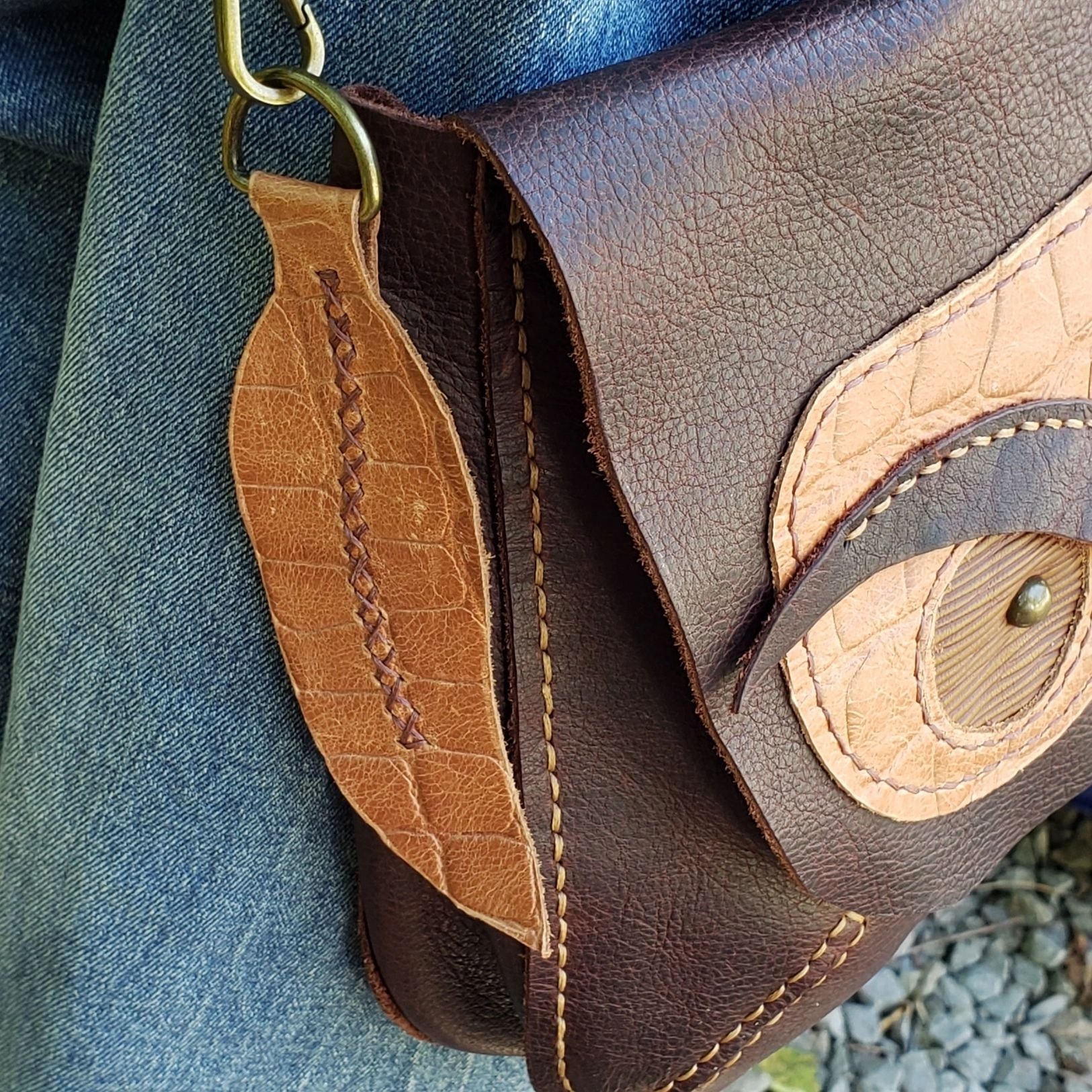 A one-of-a-kind handmade leather purse with an Owl face will have people talking. This purse is hand cut from a mix of durable oil-tanned leather with embossed accent leathers.
