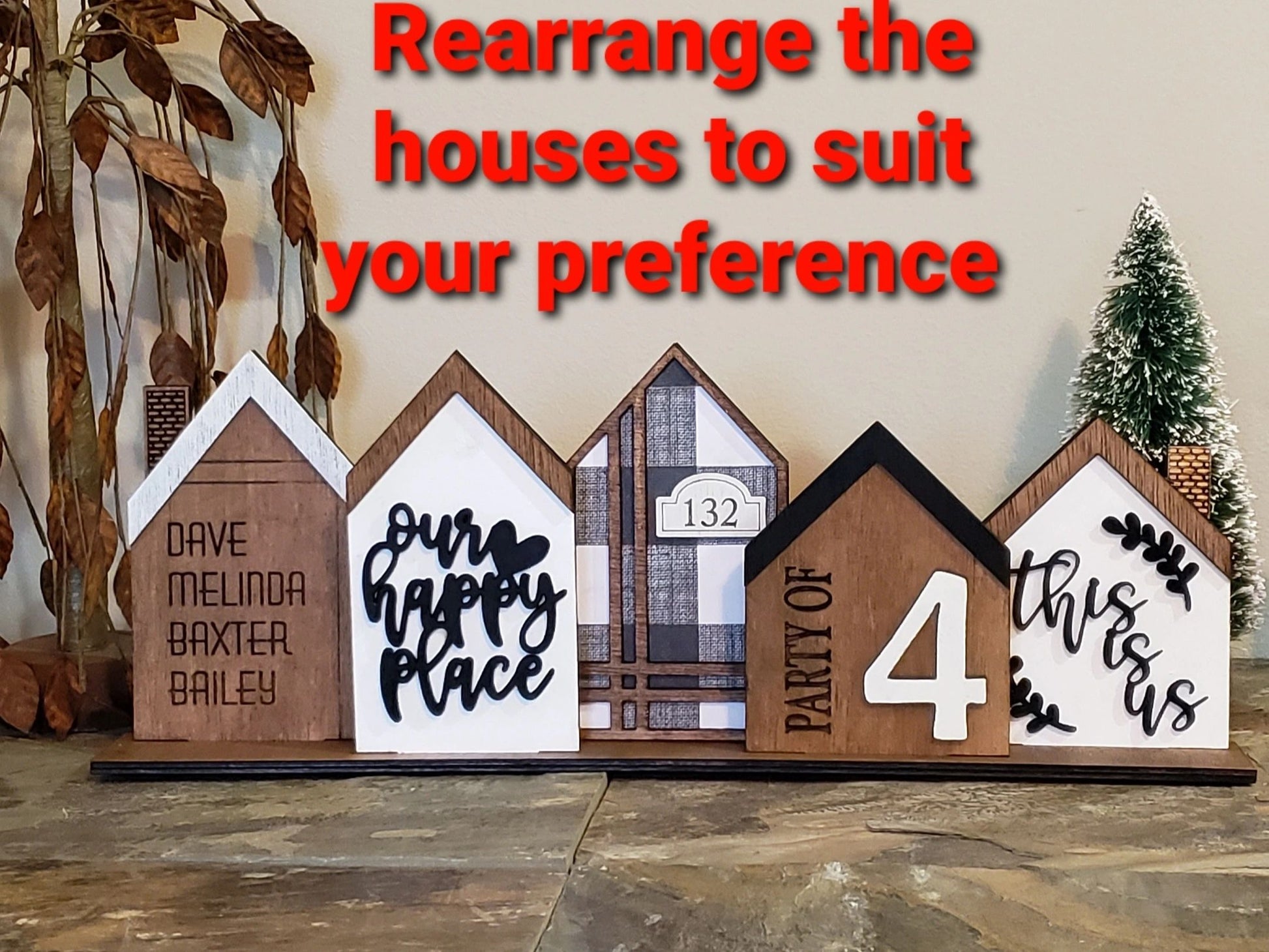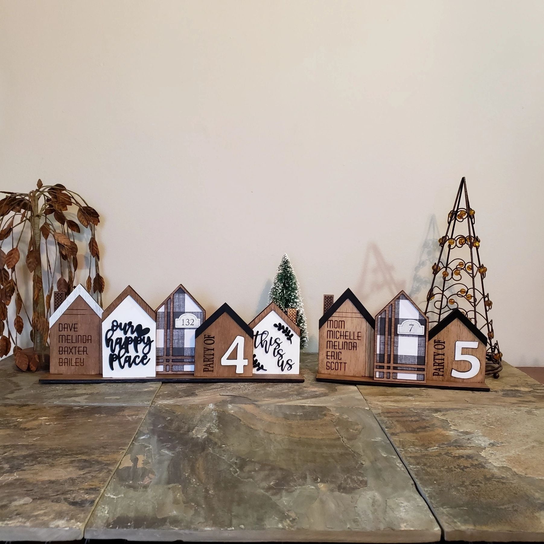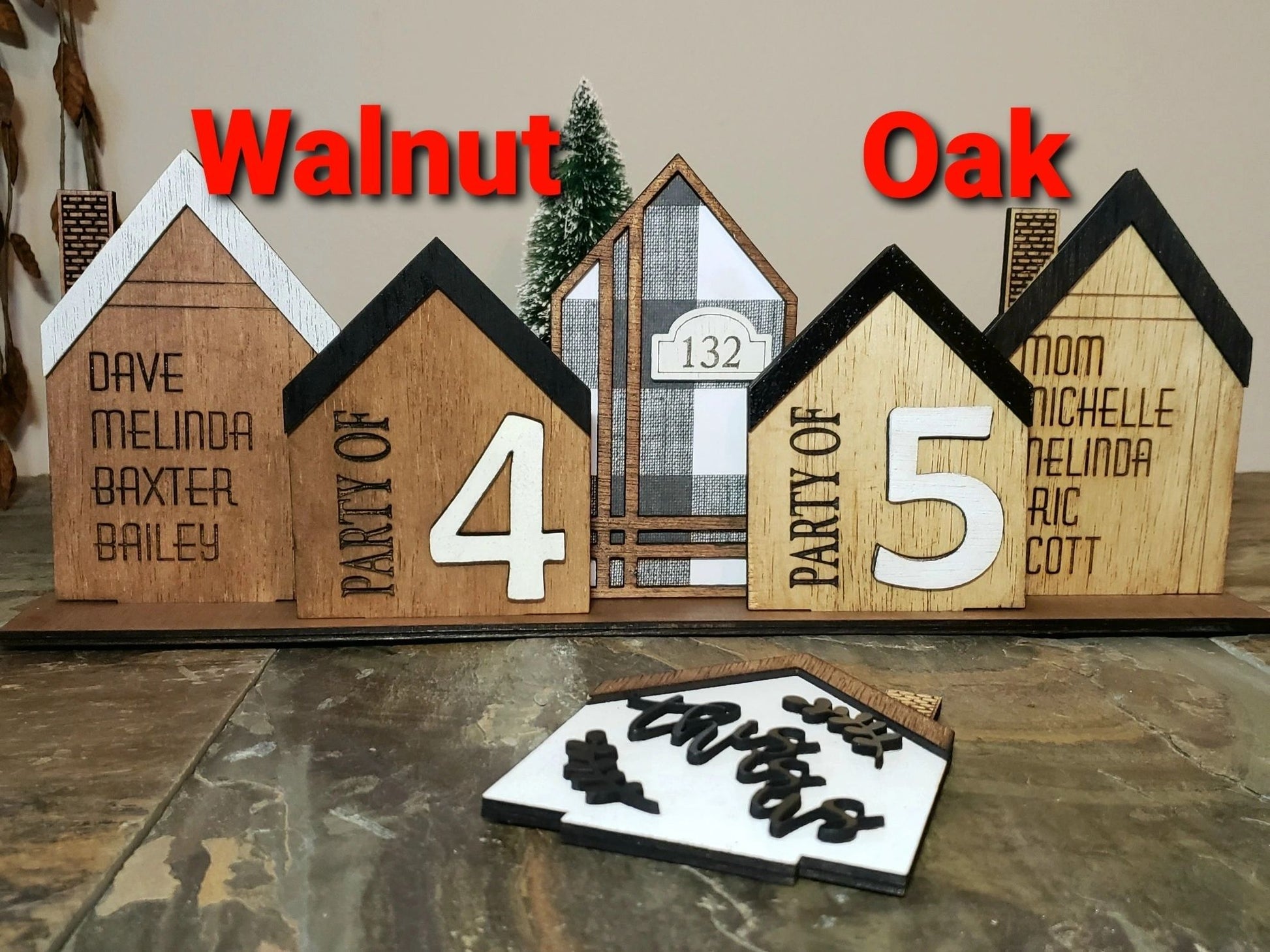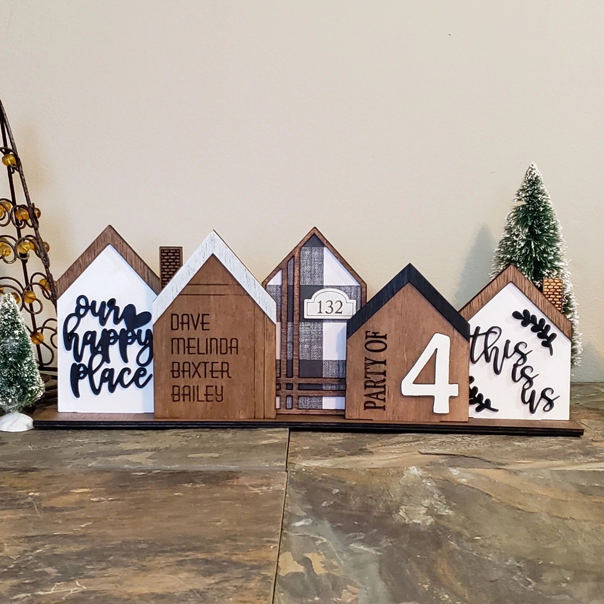 Personalized Standing House Sets These standing houses customizable sets are available in 3 or 5-house sets. These make a wonderful gift for newlyweds, a new homeowner, or any occasion that a thoughtful gift is needed. The rustic farmhouse style can also be ordered in a walnut OR oak finish for just the right shade to match any decor. The houses each have a tab on the bottom that pops into a slot on the base. The houses can be rearranged into any configuration that you would like. The 3 house set includes: The family name house The party of # 3rd house options are plaid address house OR This Is Us house. The 5 house set includes all of the houses shown: The family name house The party of # The address house The This Is Us house The Our Happy Place house The 5-set base measures app 16" long x 1 3/4" wide and 1/4" inch thick. The 3 set base measures app 10.5" long x 1 3/4" wide and 1/4" inch thick. Each house varies in size and is app 3-3.5" wide and 3.2 - 5.8" inches tall.