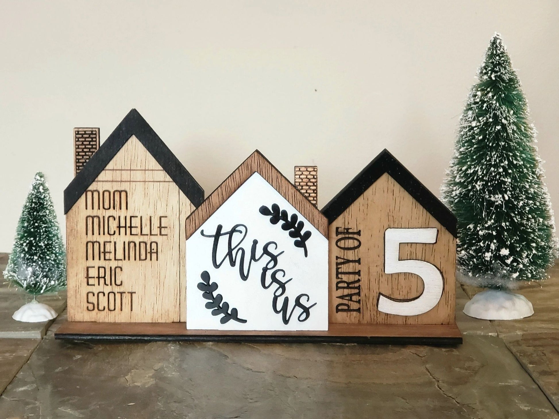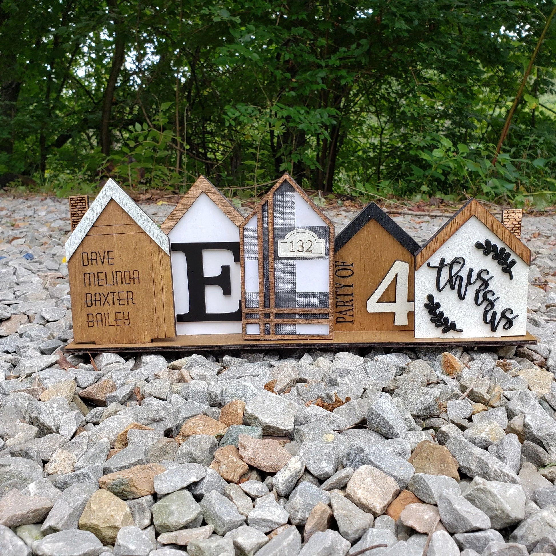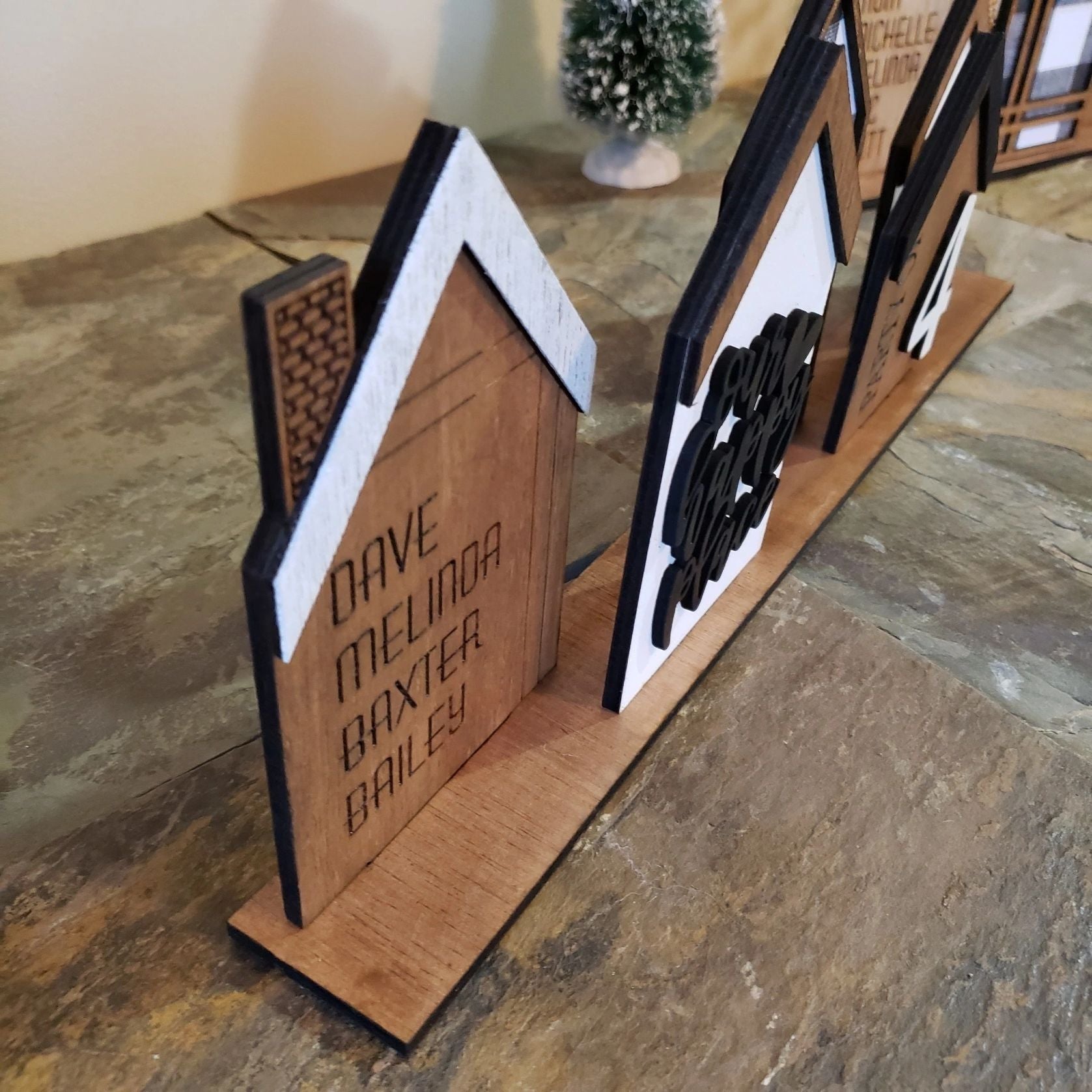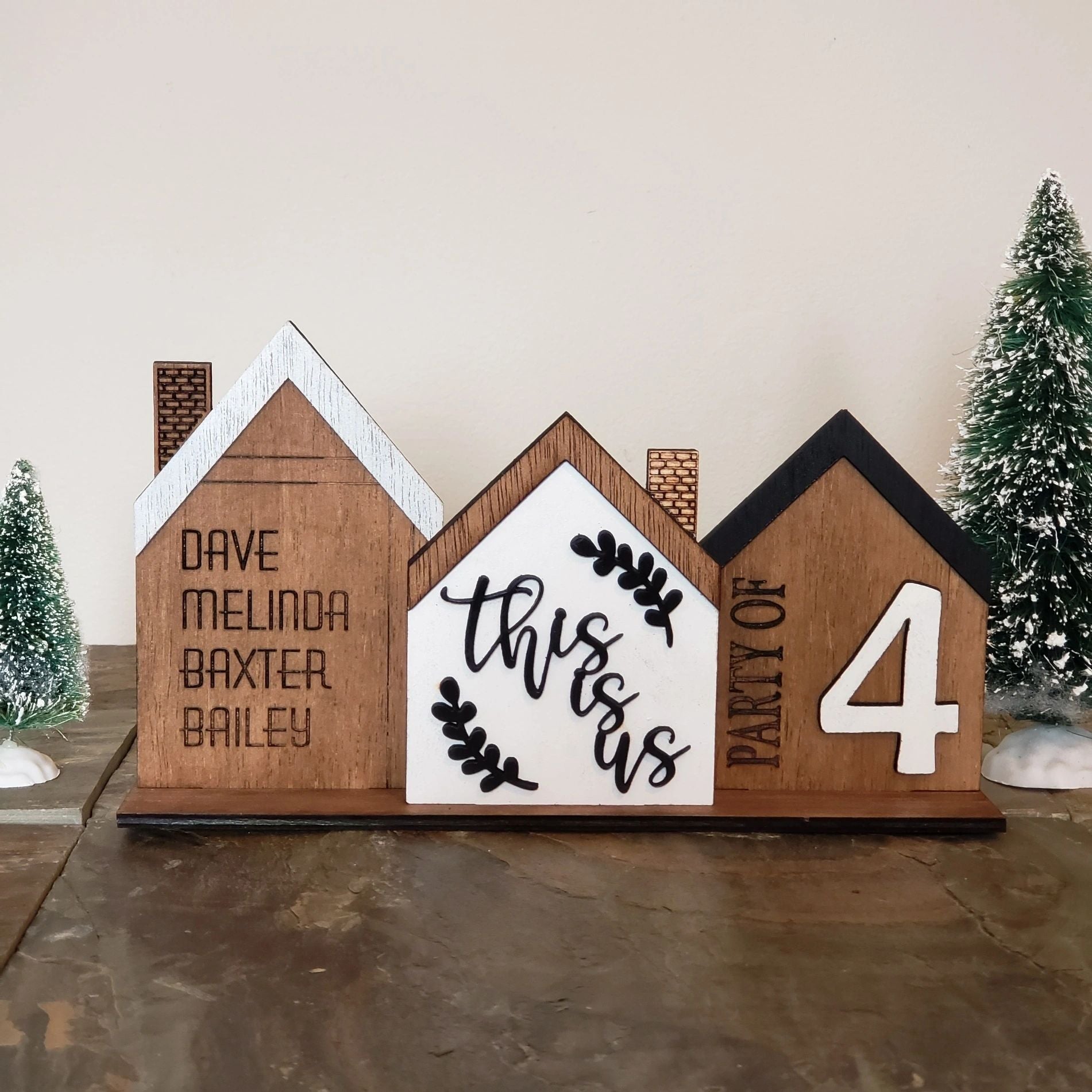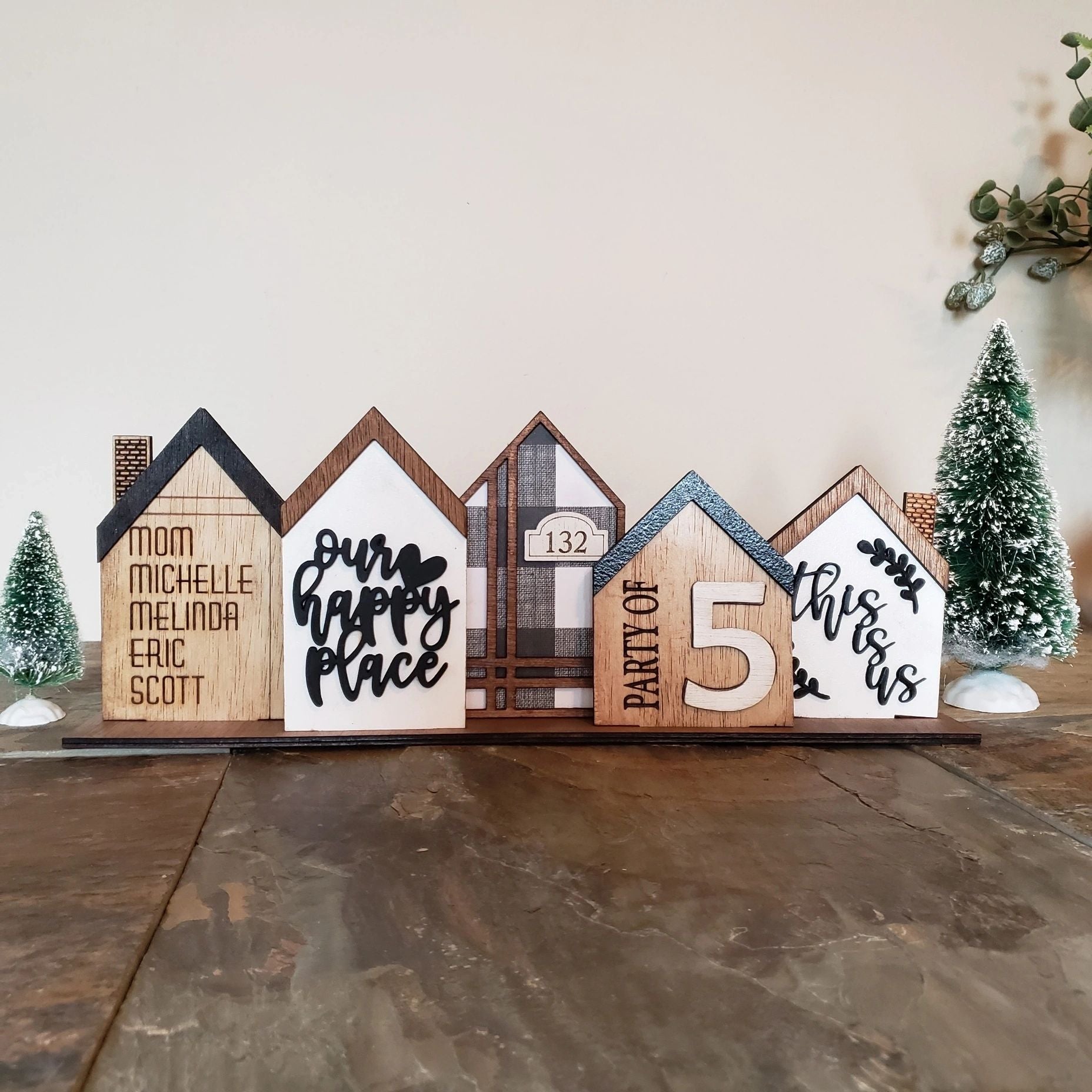 Personalized Standing House Sets These standing houses customizable sets are available in 3 or 5-house sets. These make a wonderful gift for newlyweds, a new homeowner, or any occasion that a thoughtful gift is needed. The rustic farmhouse style can also be ordered in a walnut OR oak finish for just the right shade to match any decor. The houses each have a tab on the bottom that pops into a slot on the base. The houses can be rearranged into any configuration that you would like. The 3 house set includes: The family name house The party of # 3rd house options are plaid address house OR This Is Us house. The 5 house set includes all of the houses shown: The family name house The party of # The address house The This Is Us house The Our Happy Place house The 5-set base measures app 16" long x 1 3/4" wide and 1/4" inch thick. The 3 set base measures app 10.5" long x 1 3/4" wide and 1/4" inch thick. Each house varies in size and is app 3-3.5" wide and 3.2 - 5.8" inches tall.