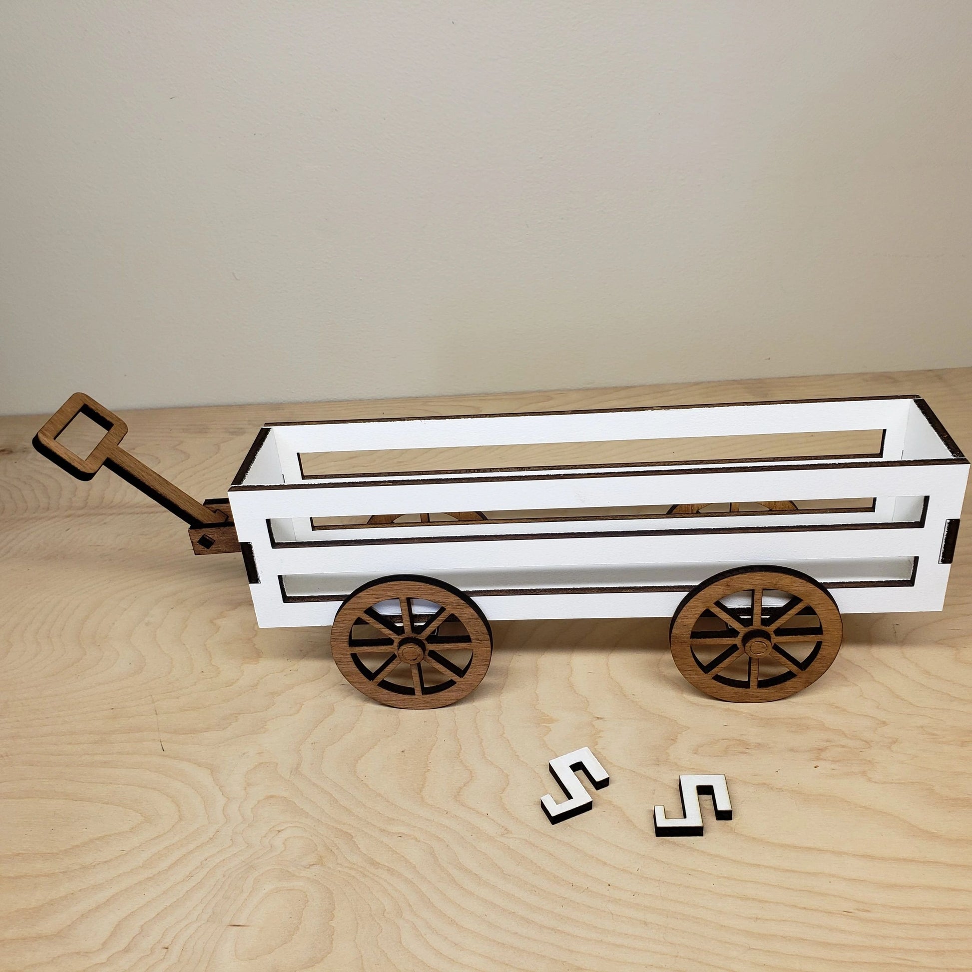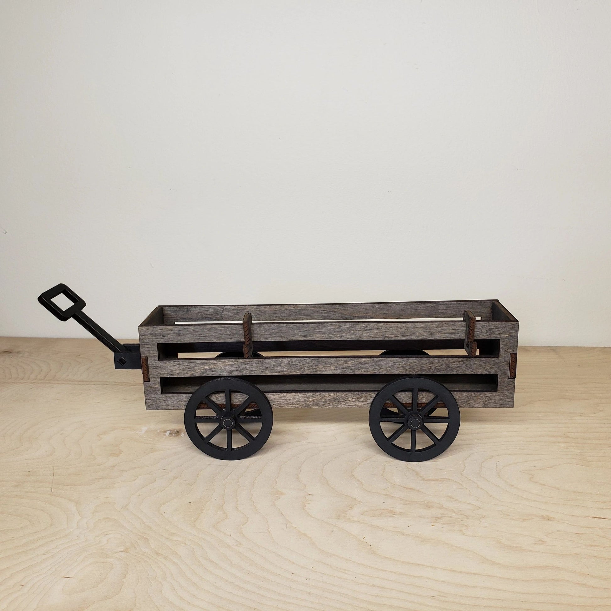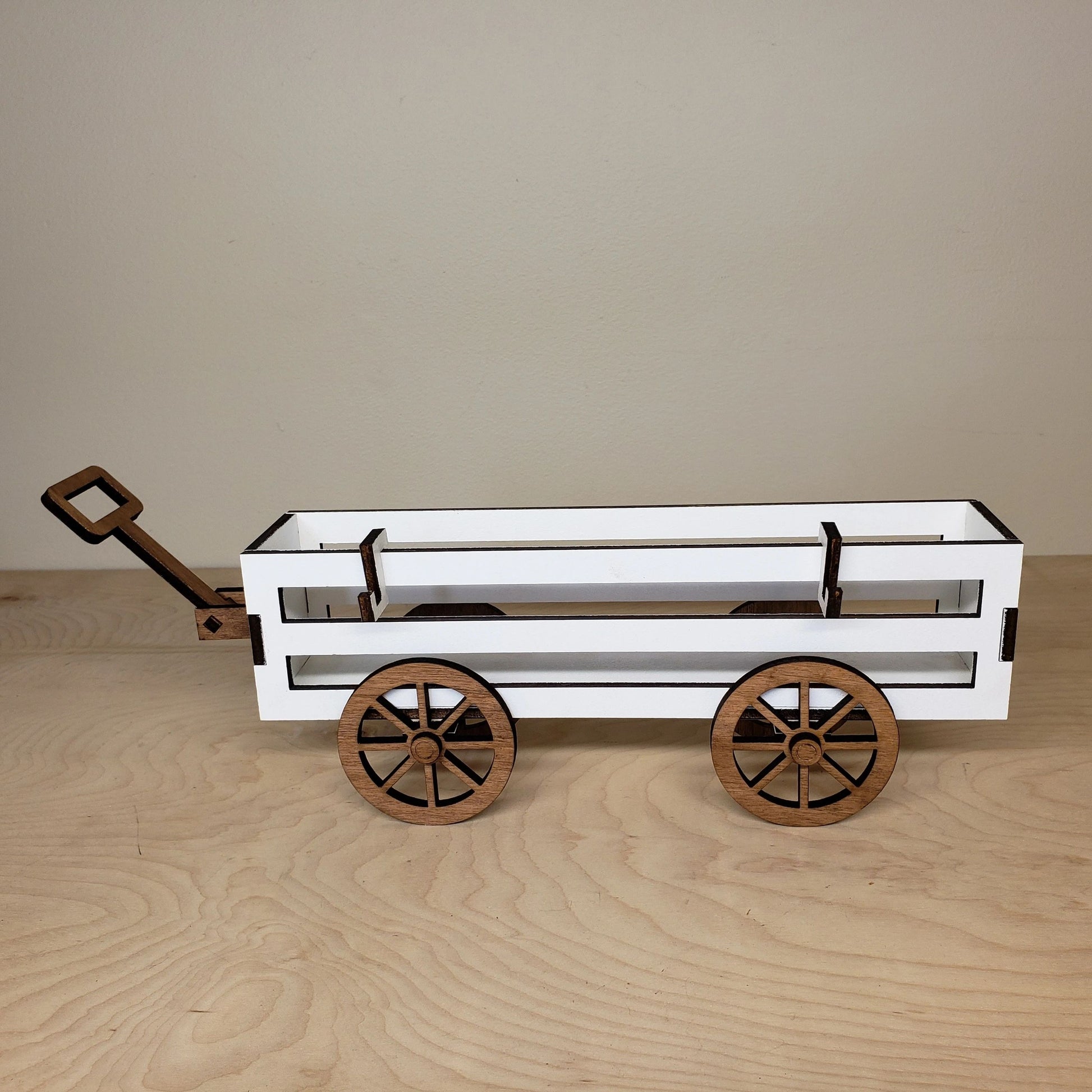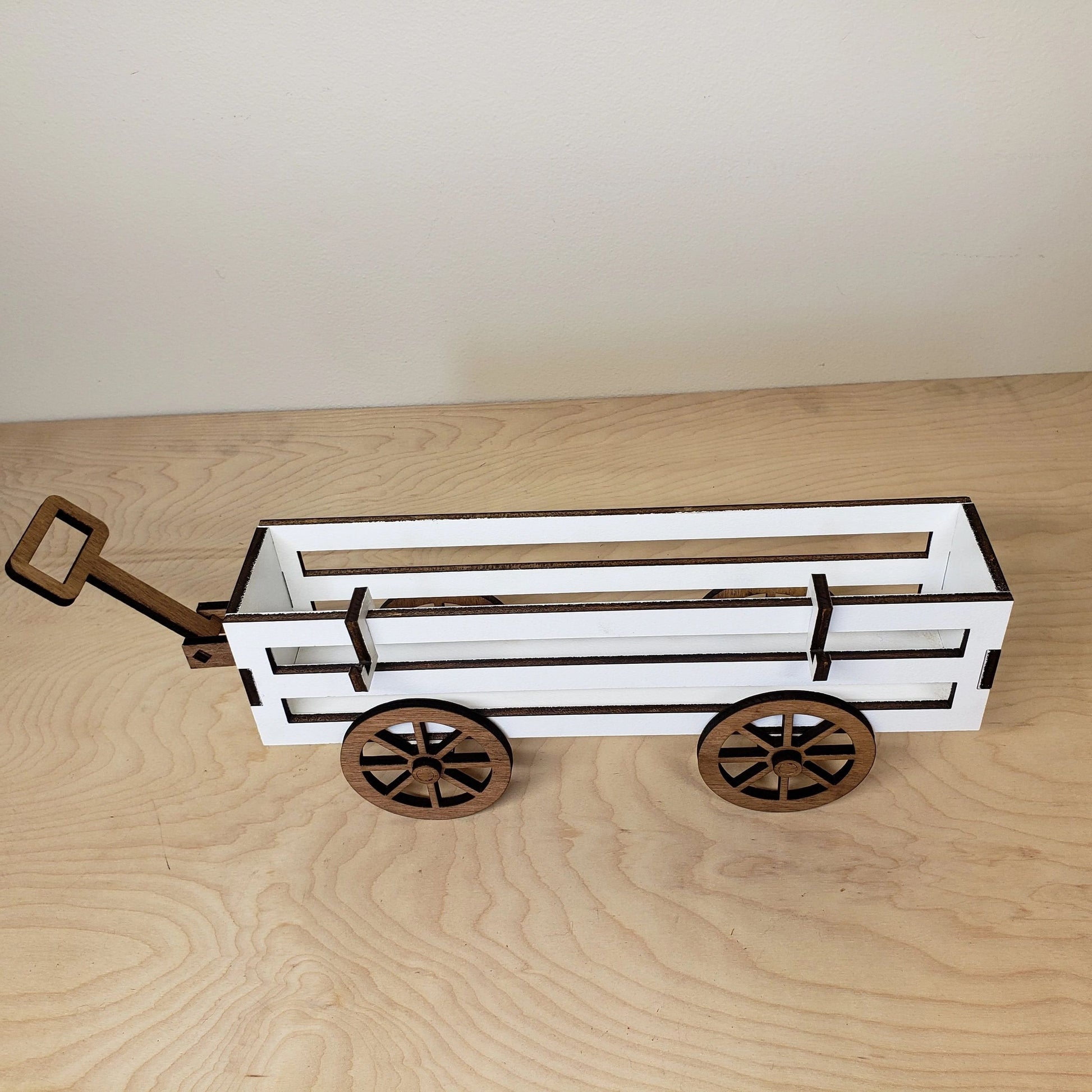 Rustic Wood Wagon for Interchangeable Wagon Inserts or Any Home Decor This is the NEW style of Rustic Wood Wagons. These are fantastic alone or with any of the wagon inserts sets available in my shop. You can also add your own pieces for a truly unique look. The wagons are laser cut from 1/4" birch wood. Each wagon is hand painted or stained. The wagons measure 13 x 4 x 2.5". The interior crate part of the wagon measures 10" long and 1 7/8" wide.