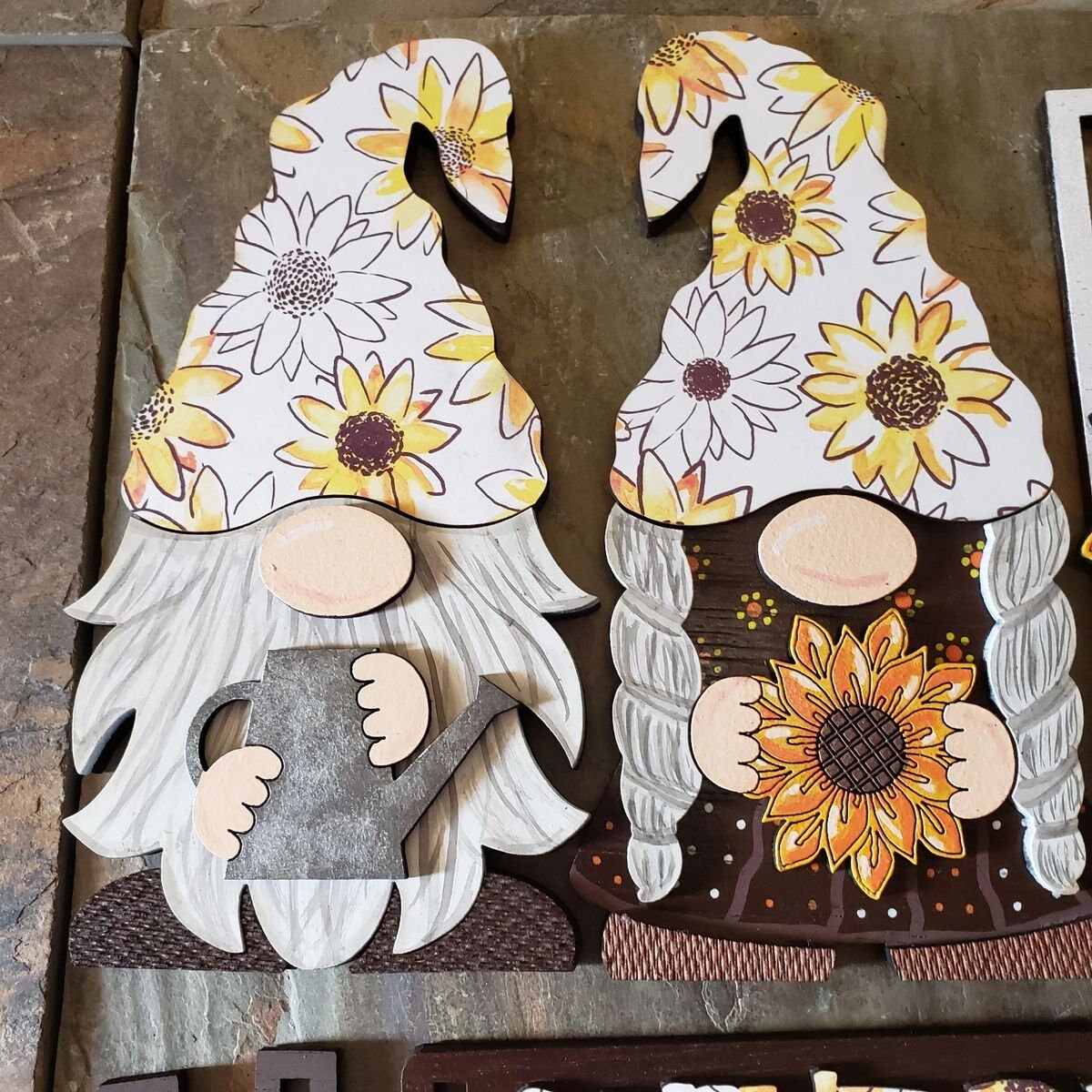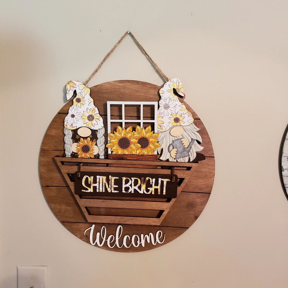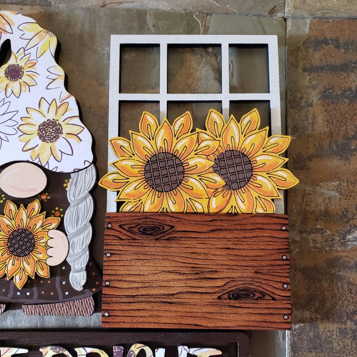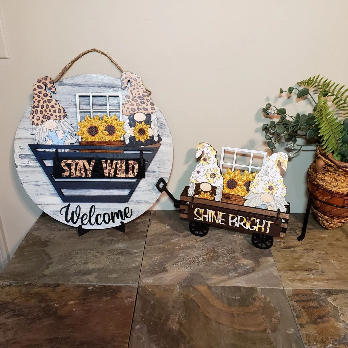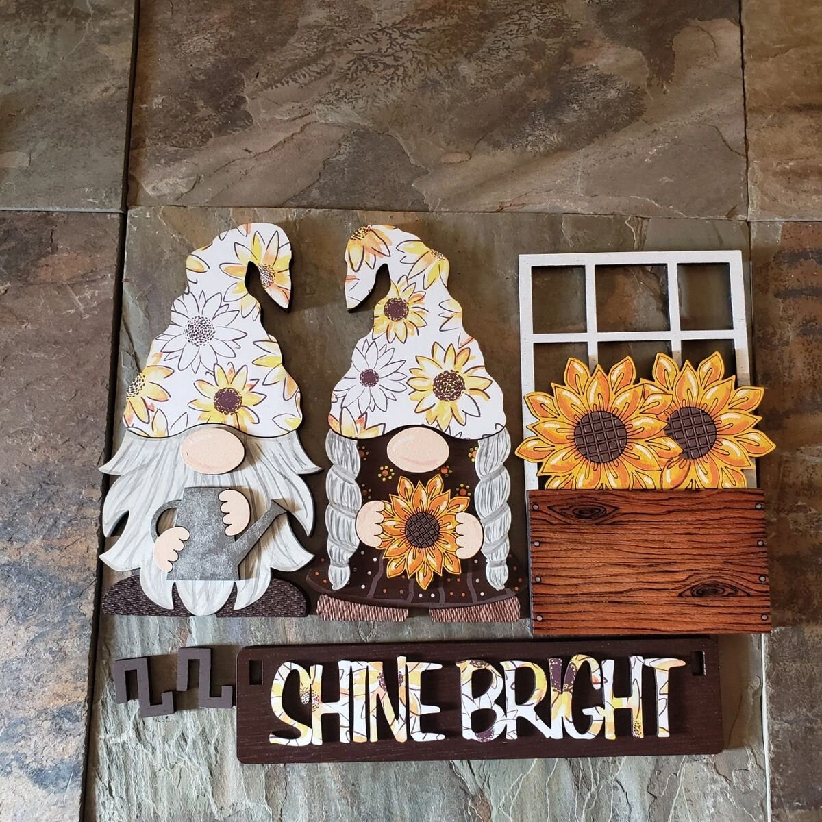 Sunflower Gnomes Shine Bright Interchangeable Wagon Set The shine bright sunflower gnome set will add a fun pop of color to your home decor. Use the set as stand-alone decor or add them to a wagon. This set is multi-layered and laser cut from a mix of birch and MDF. The gnomes measure 7.25 x 4". The window box measures 7 x 4.25". The banner sign measures 8.5 x 2" and comes with 2 removable wood hooks to hang the banner.